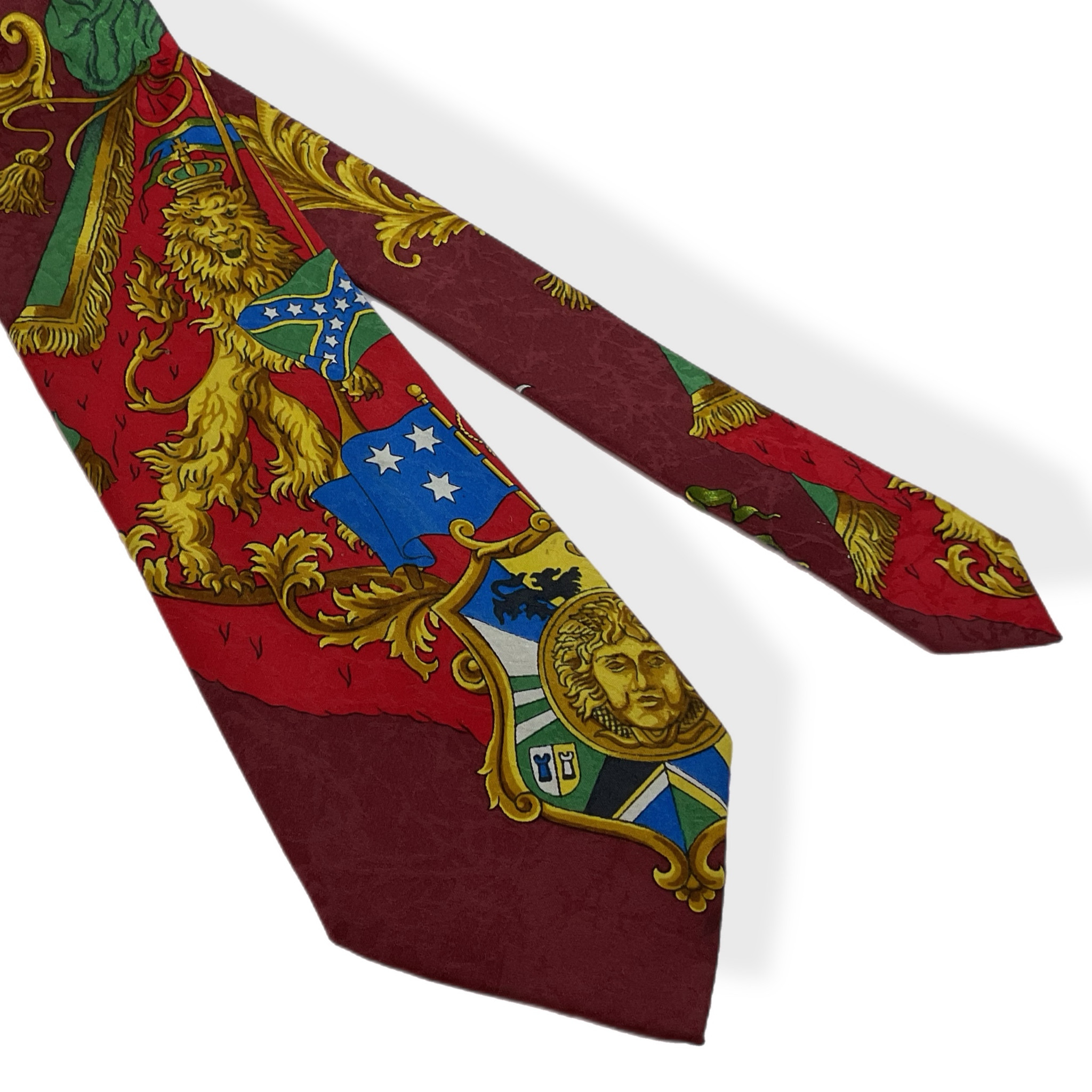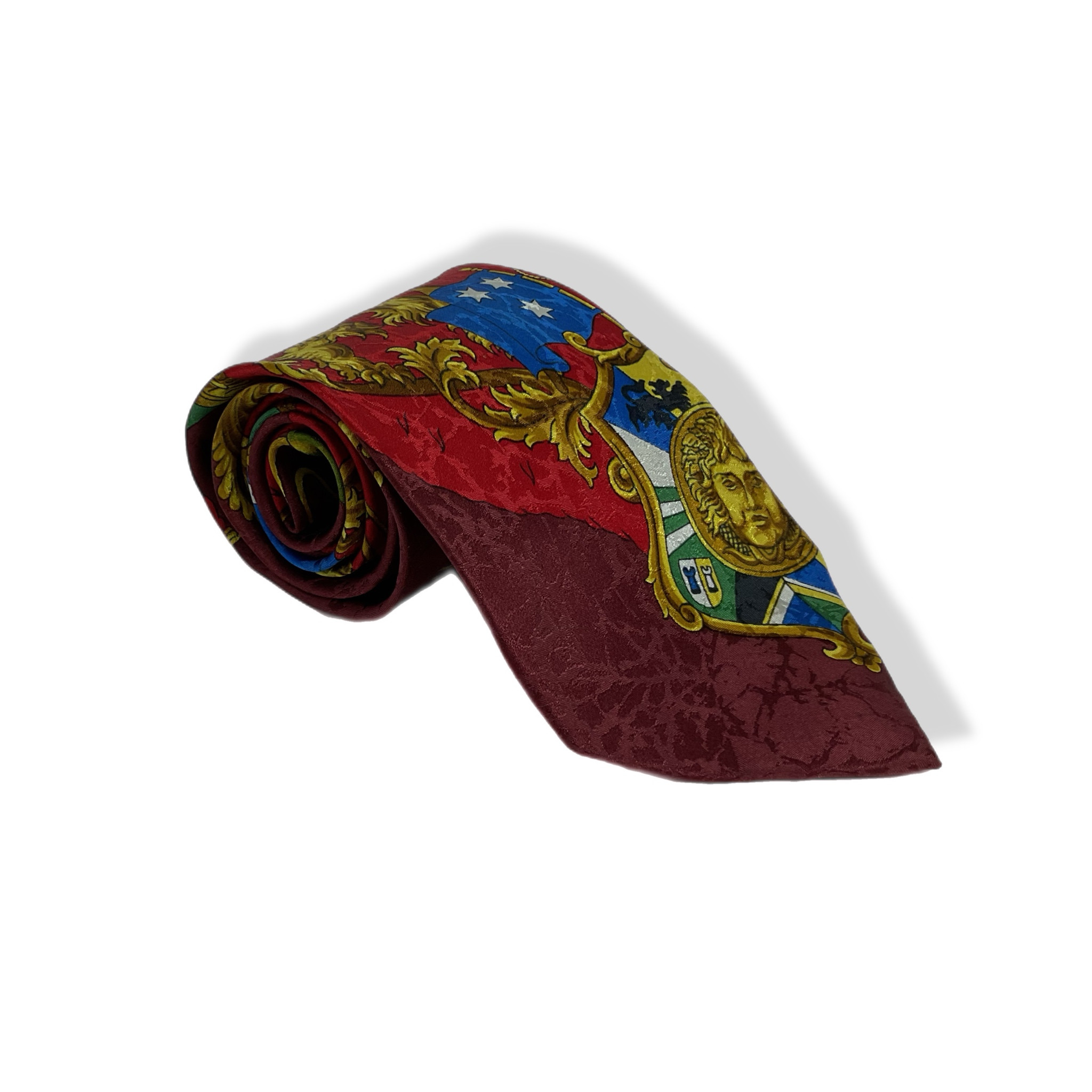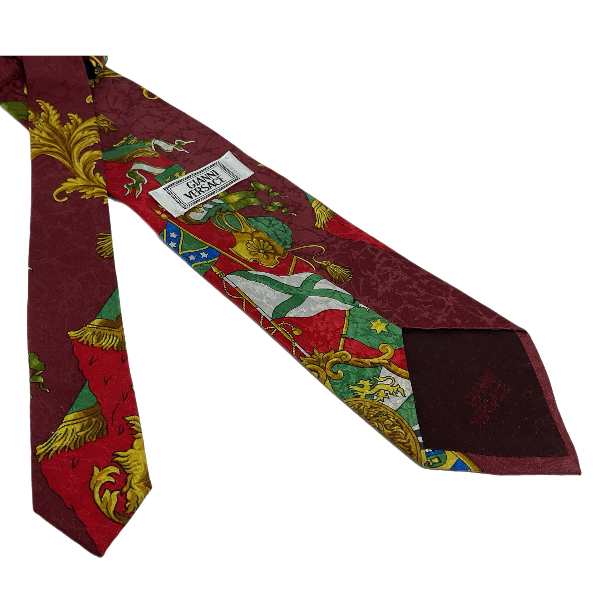 La fantasia iconica di Gianni Versace inconfondibile con il suo colore bordeaux con dettagli, blu, oro, verdi e rossi.