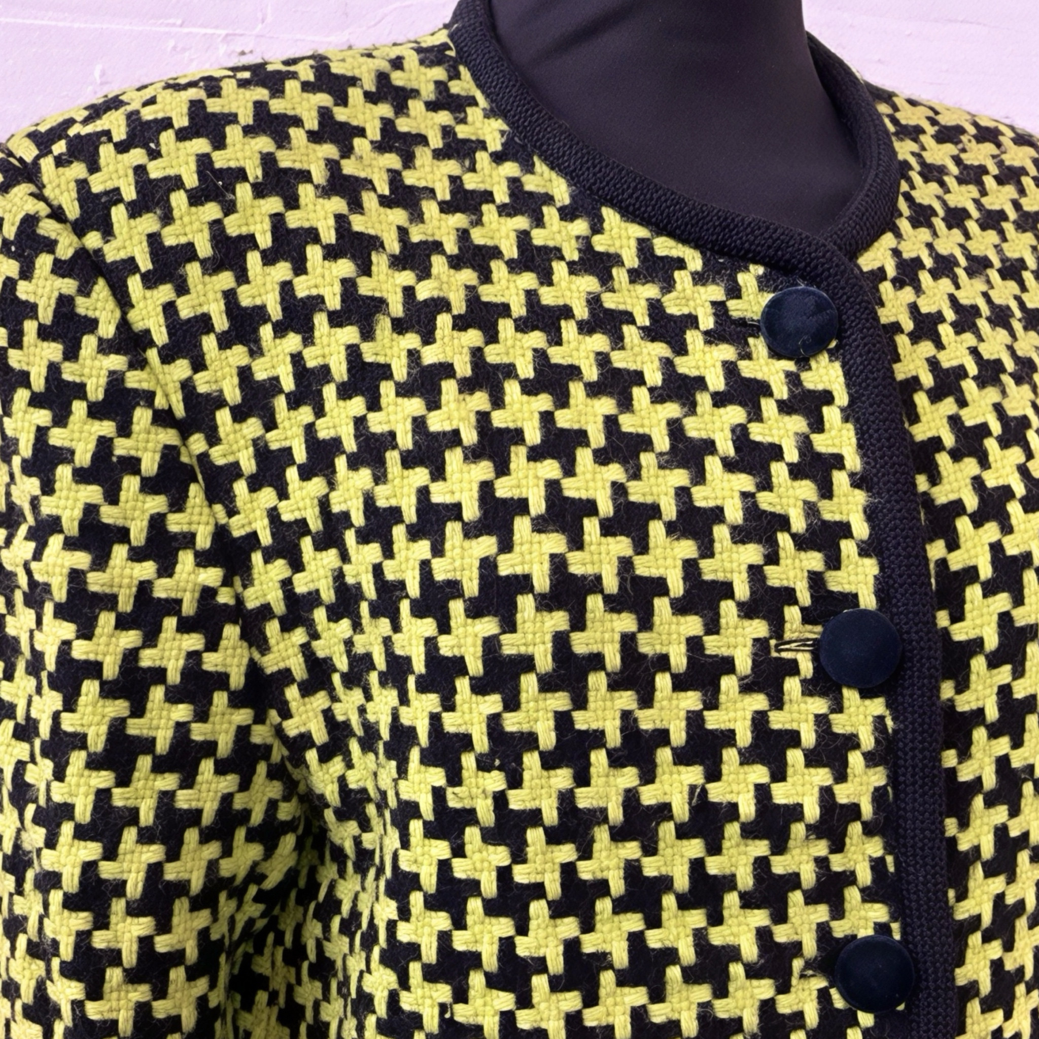 Giacca realizzata in tweed con motivo pied-de-poule bicolore verde lime e nero. Il modello presente una linea dritta e corta, con scollo rotondo e profili in contrasto nero che valorizzano il design.