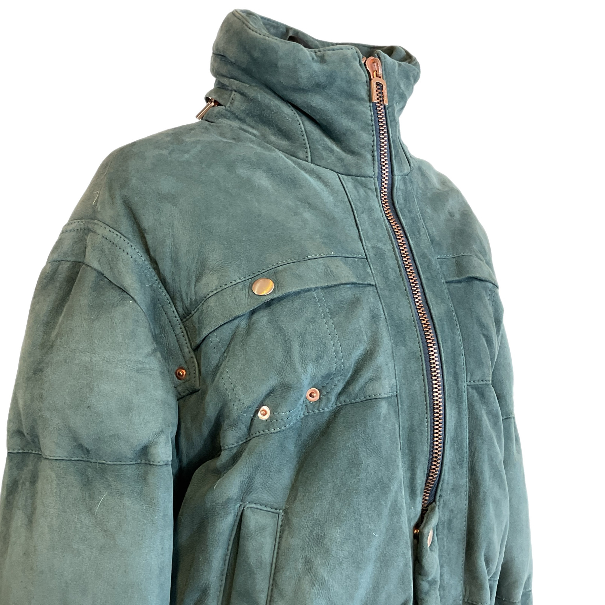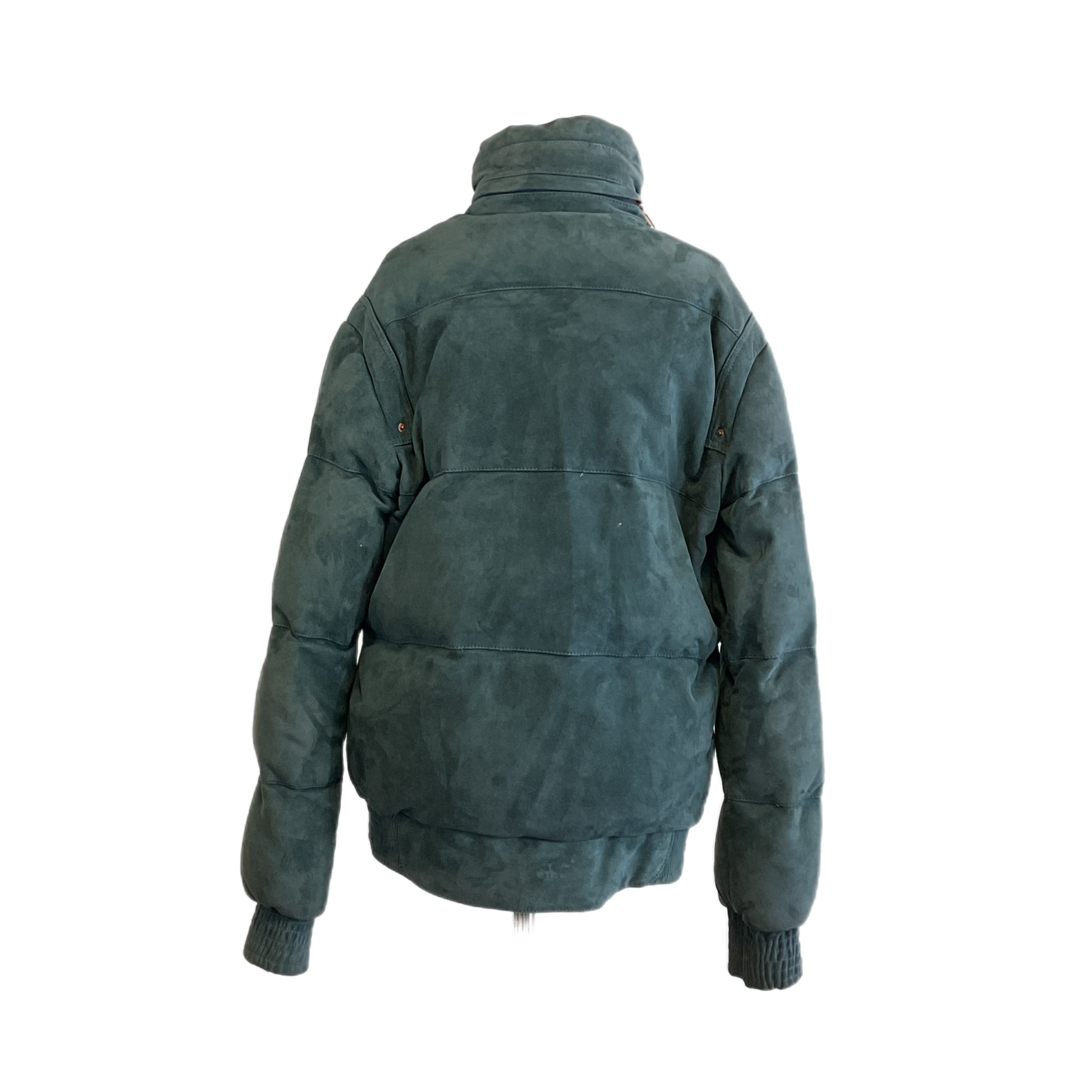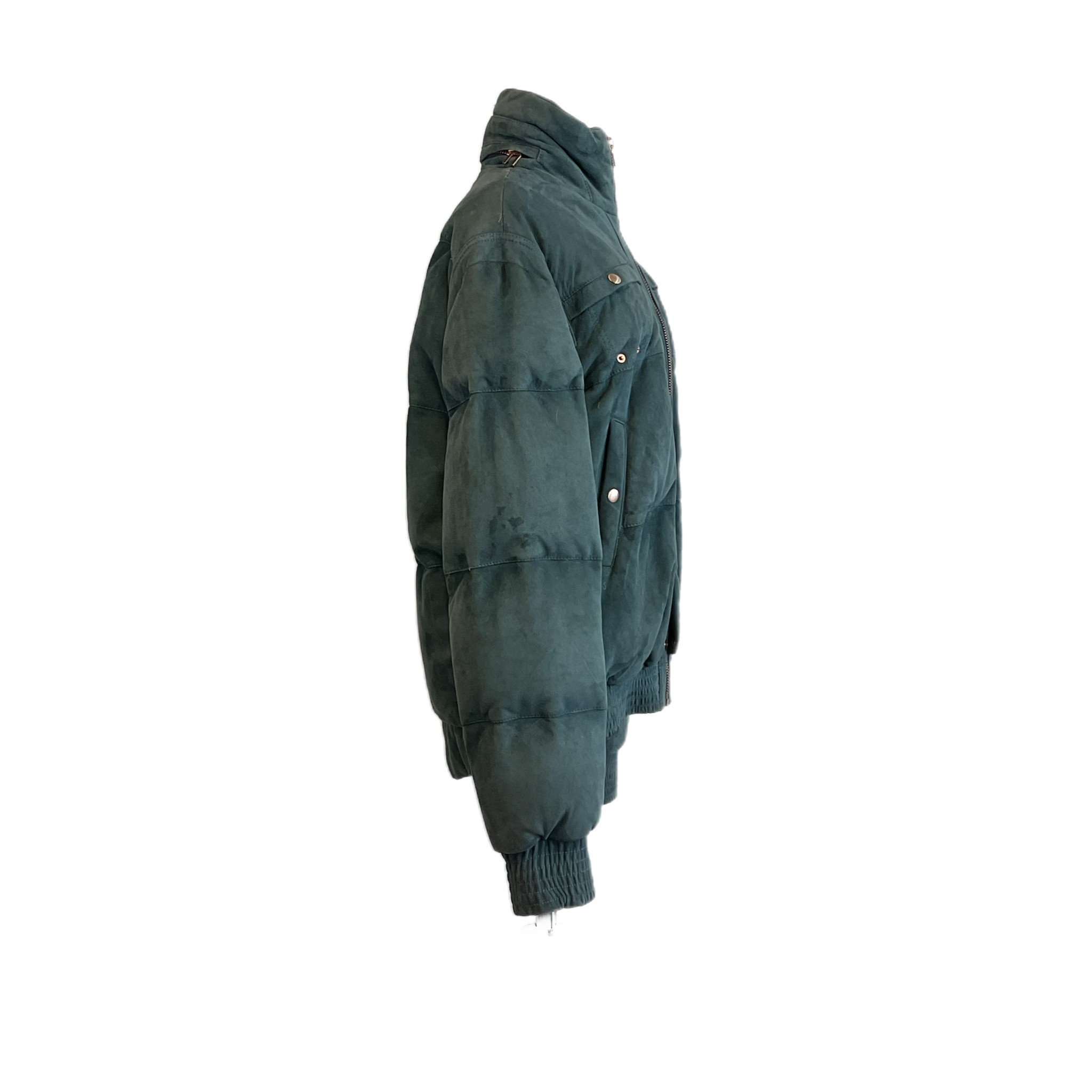 Giubbotto Emanuel Ungaro anni '80 dal design moderno e funzionale, perfetto per affrontare le giornate più fredde con stile. Realizzato in tessuto effetto scamosciato Suede, morbido al tatto e imbottito di piume d'oca di colore verde petrolio.