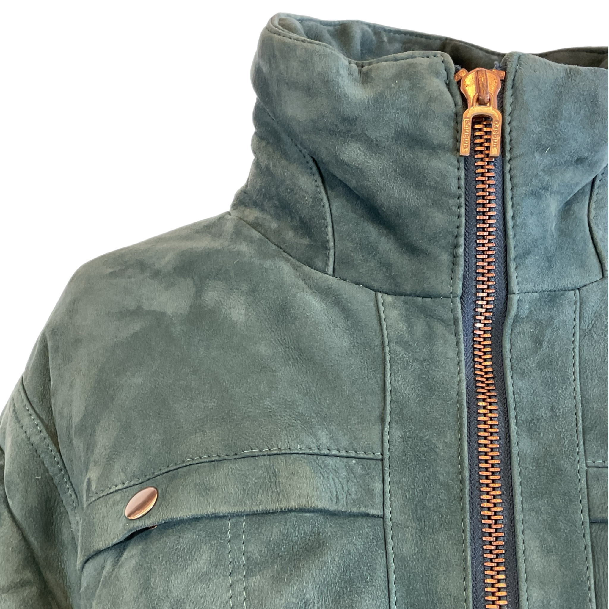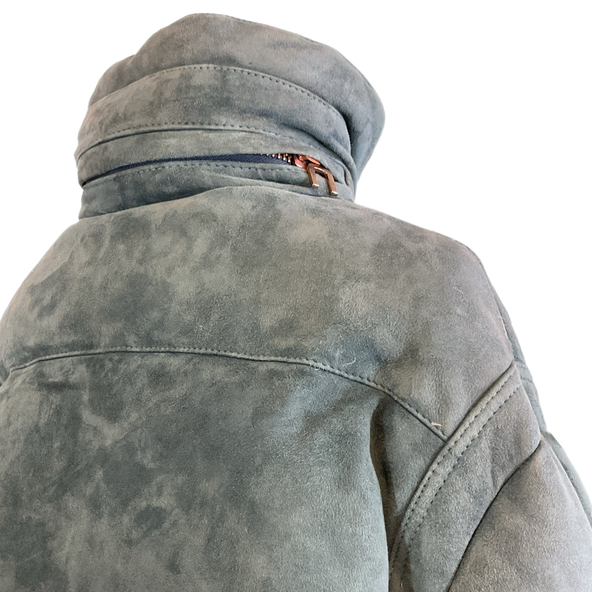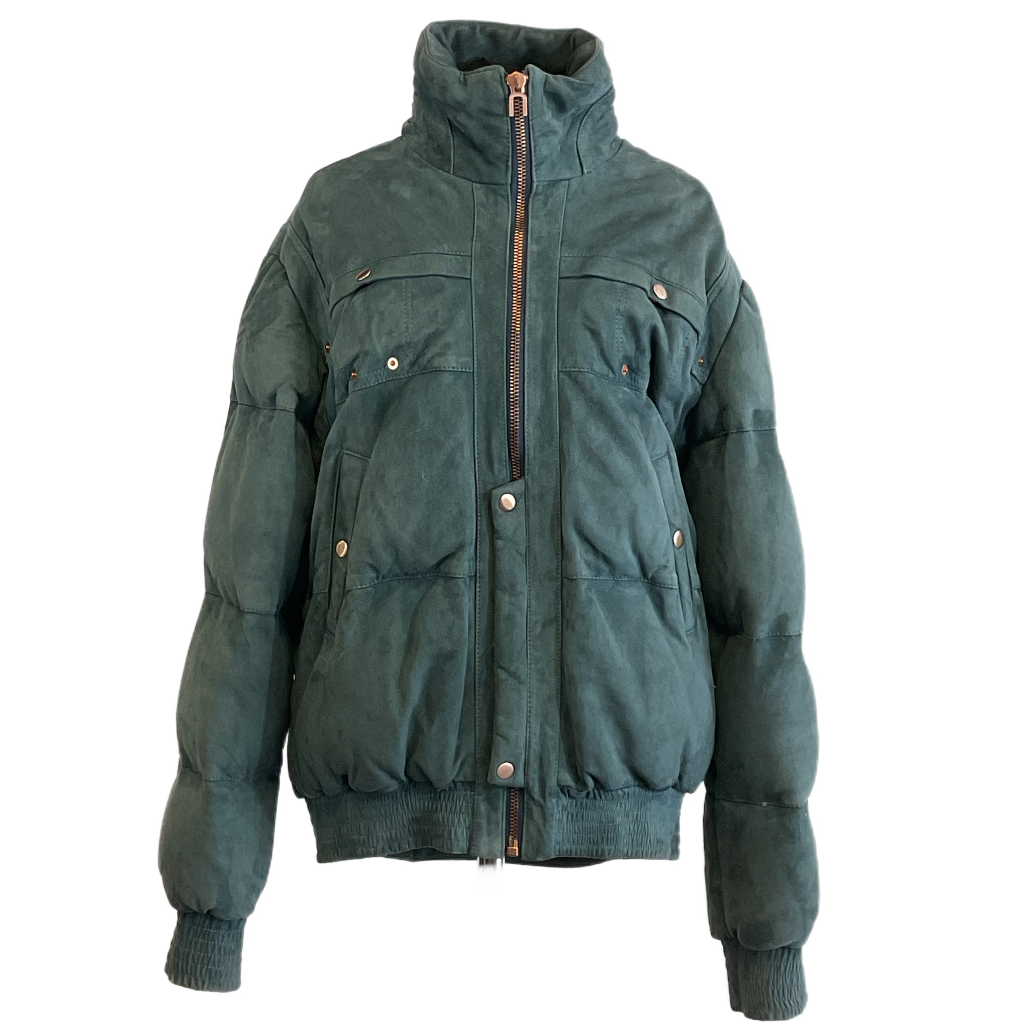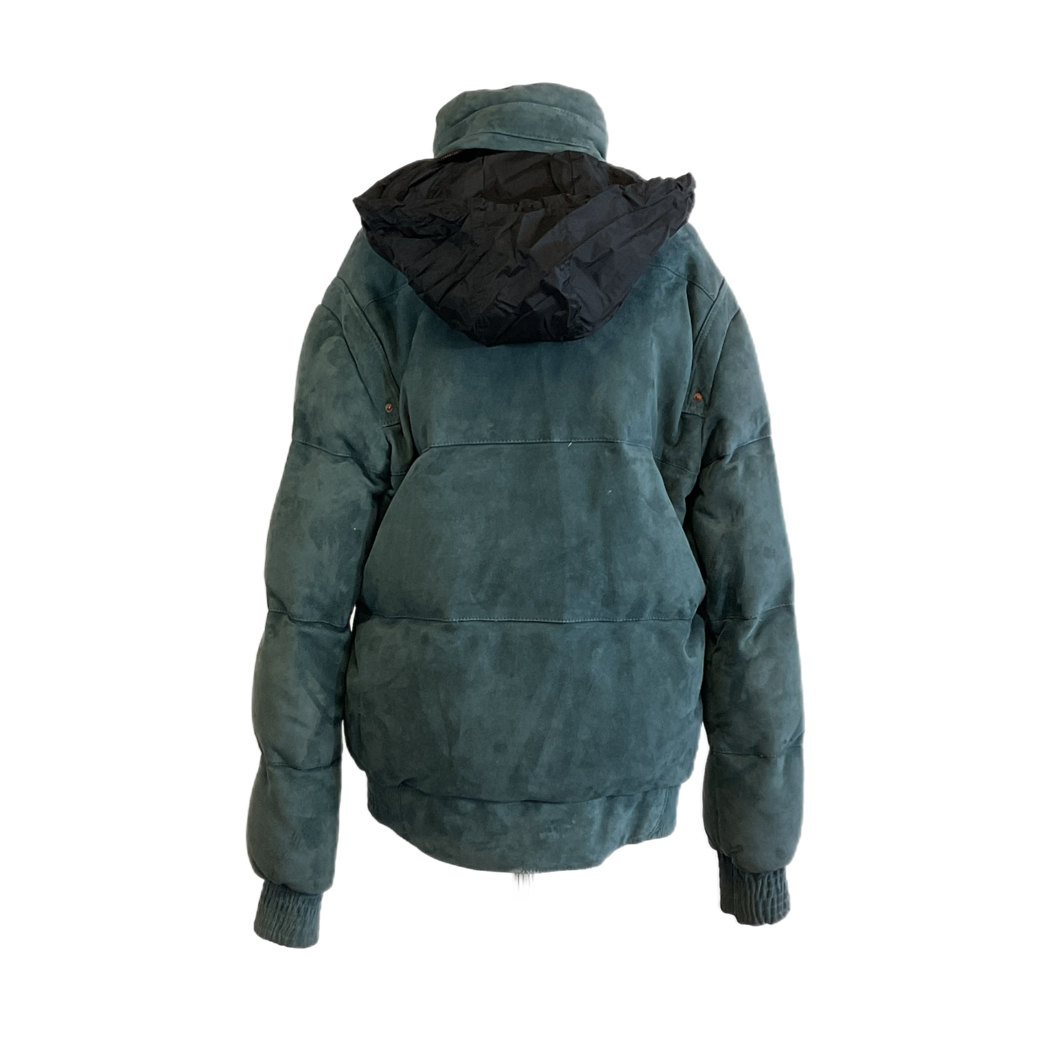 Giubbotto Emanuel Ungaro anni '80 dal design moderno e funzionale, perfetto per affrontare le giornate più fredde con stile. Realizzato in tessuto effetto scamosciato Suede, morbido al tatto e imbottito di piume d'oca di colore verde petrolio.