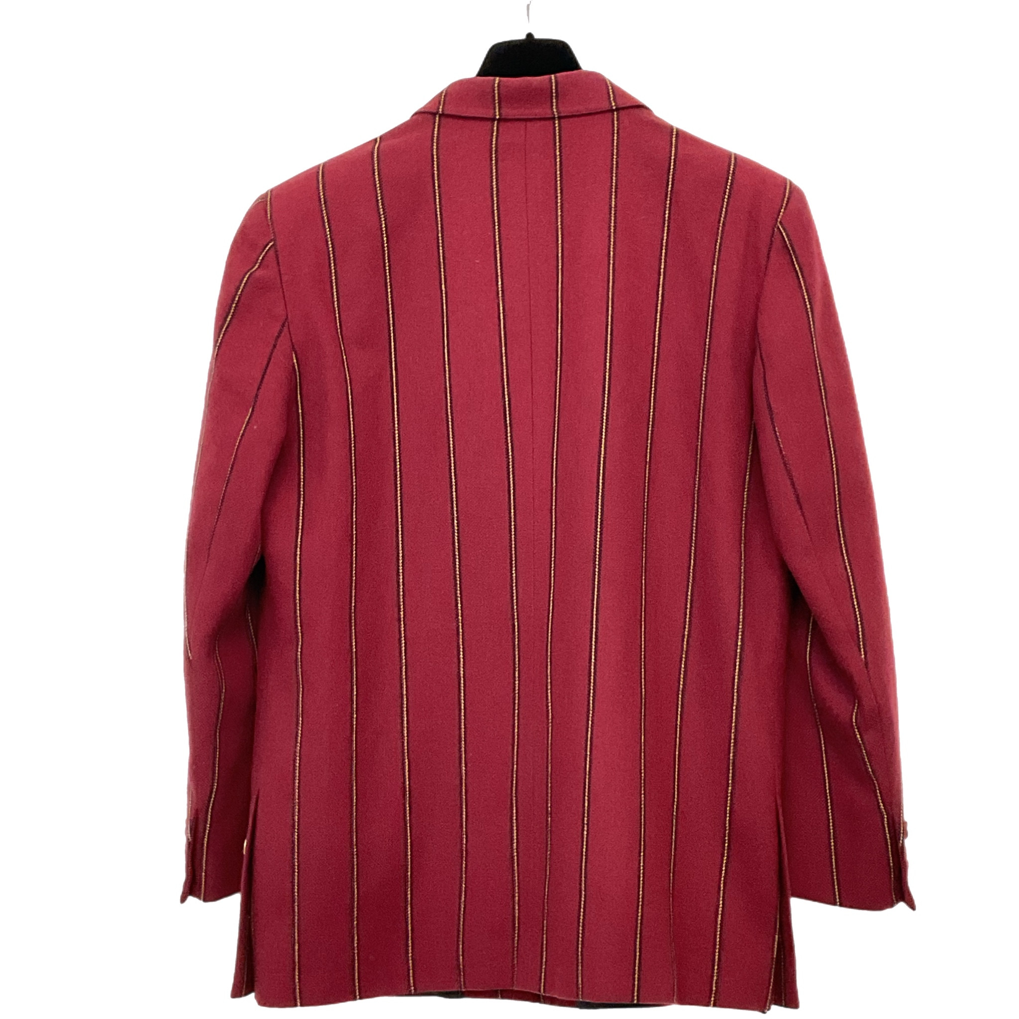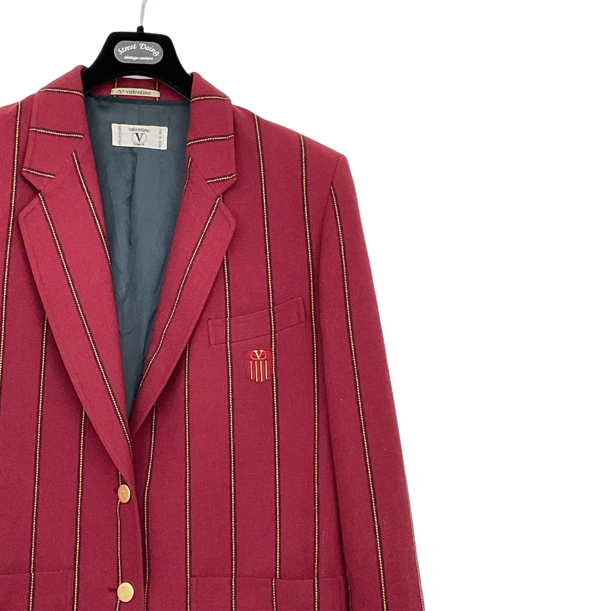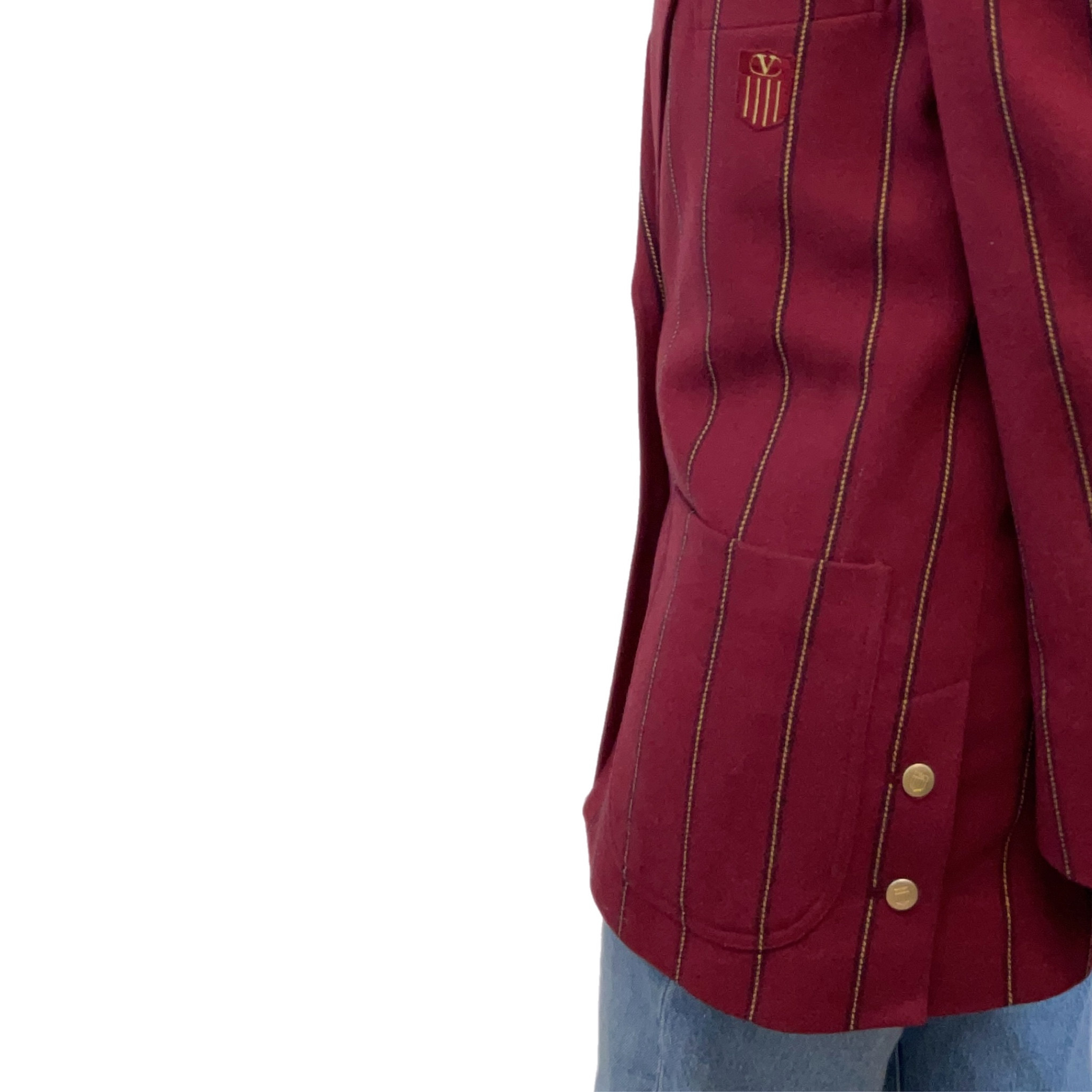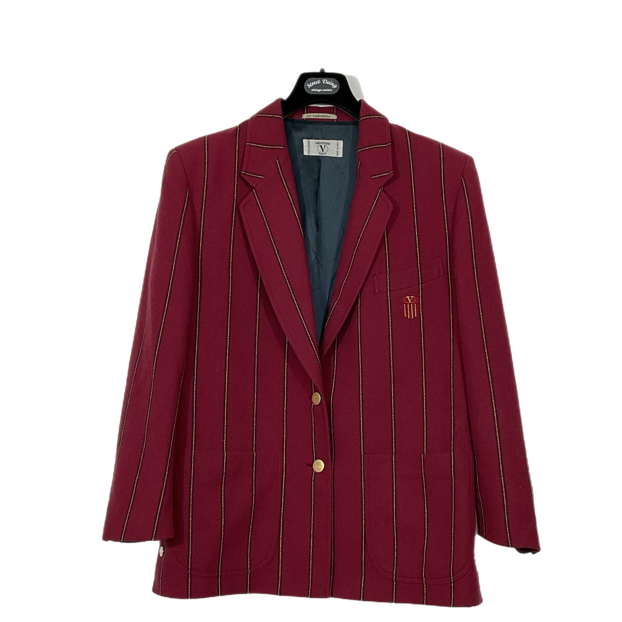 Giacca Valentino Sport di lana con fodera in seta anno 1980 bordeaux con righe gialle, stemma con logo Valentino e bottoni colore oro.