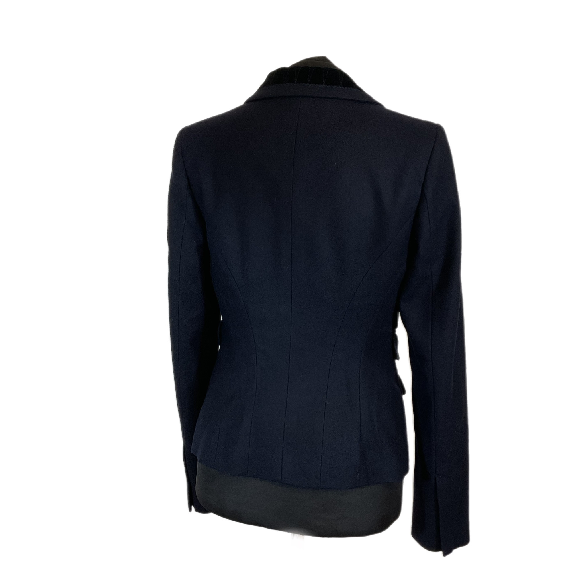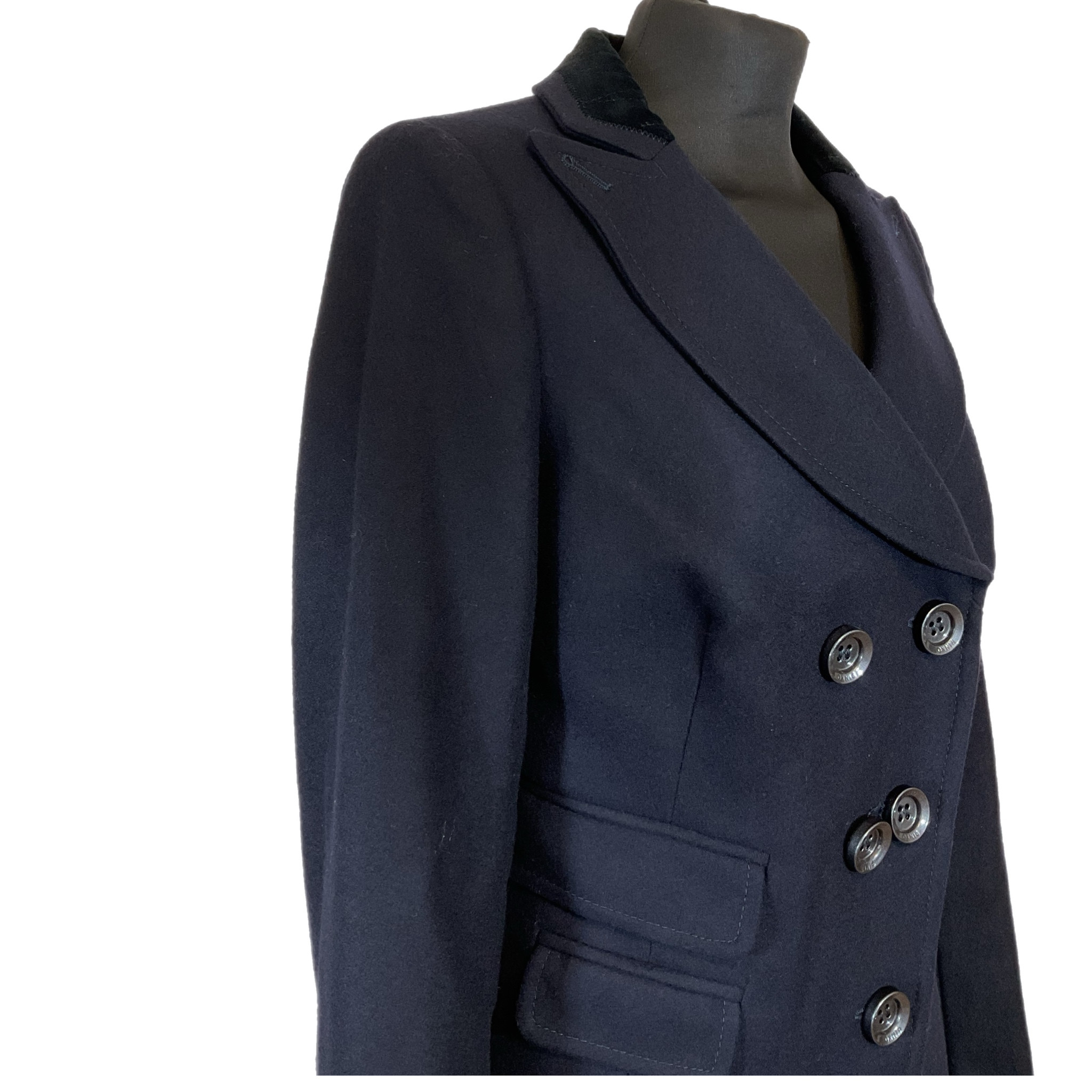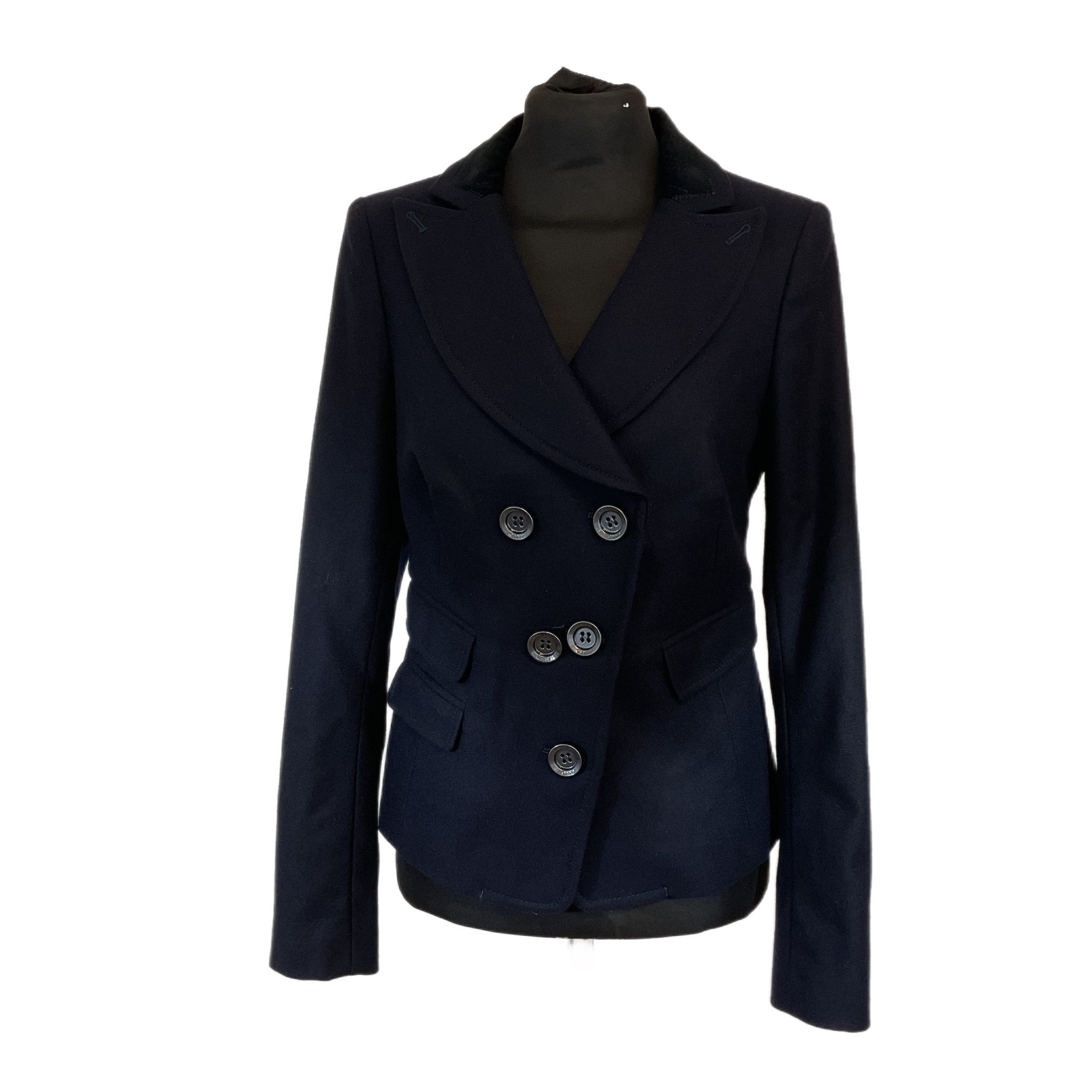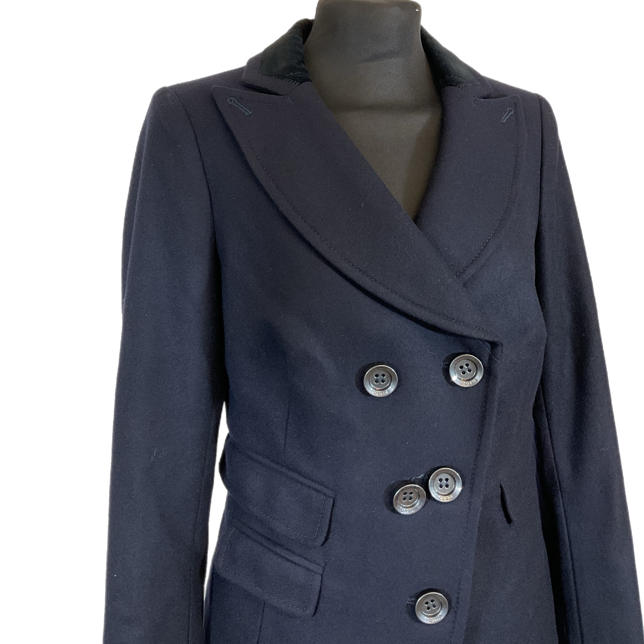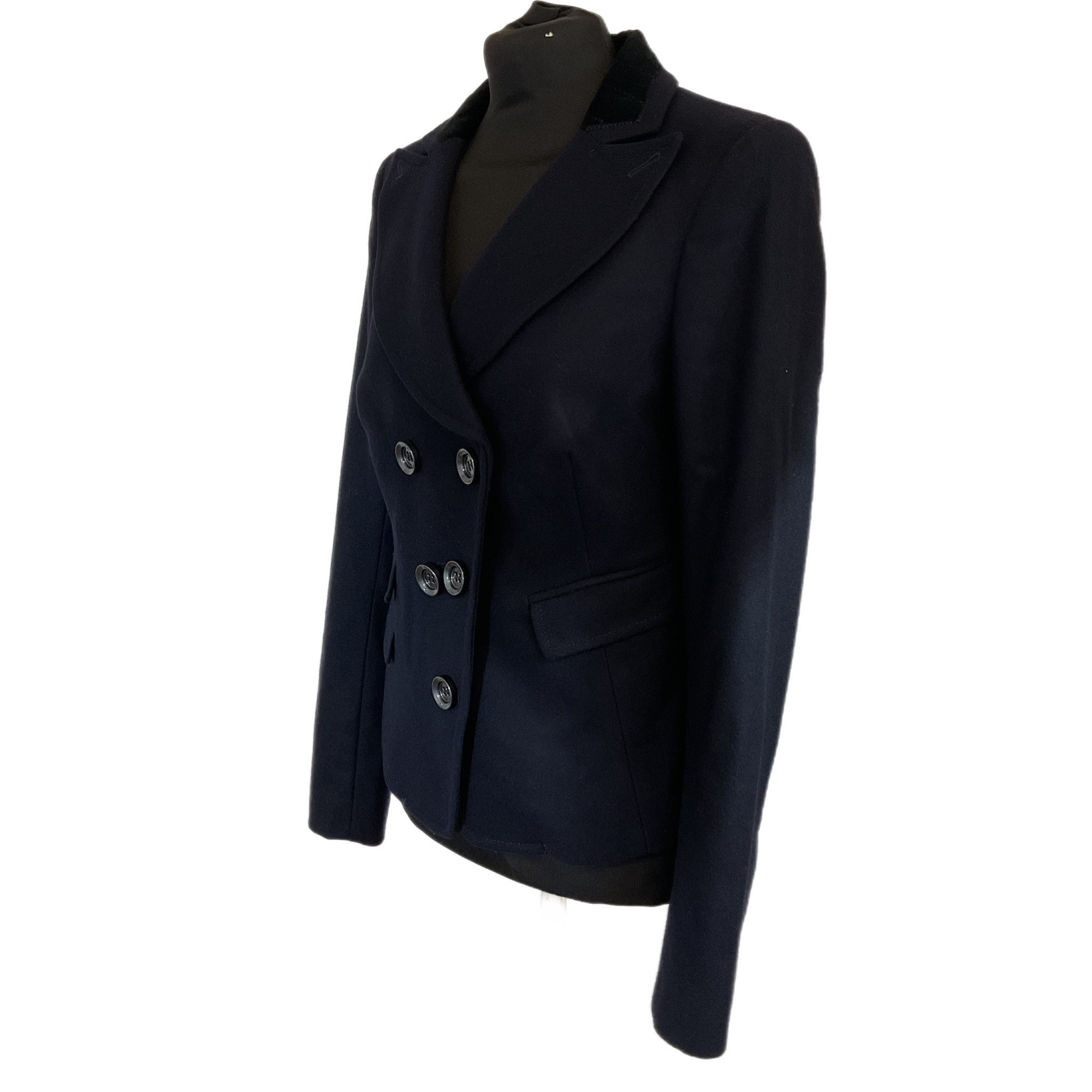Giacca corta in lana blu tg 42 anno 2010 , nuova , con cartellino, il colletto è in velluto nero, elegante e calda, perfetta per autunno inverno è avvitata e dona eleganza e una silhouette molto femminile.