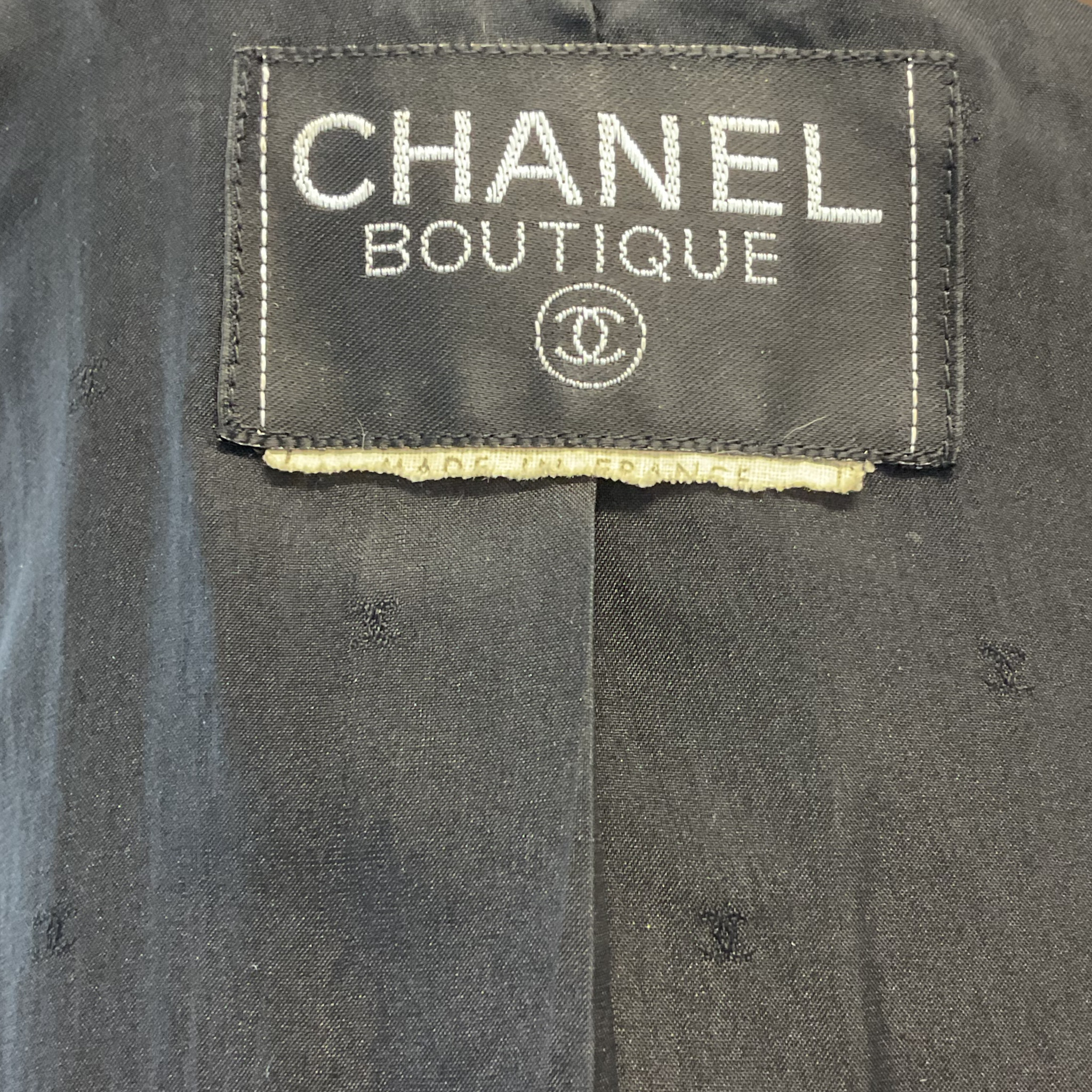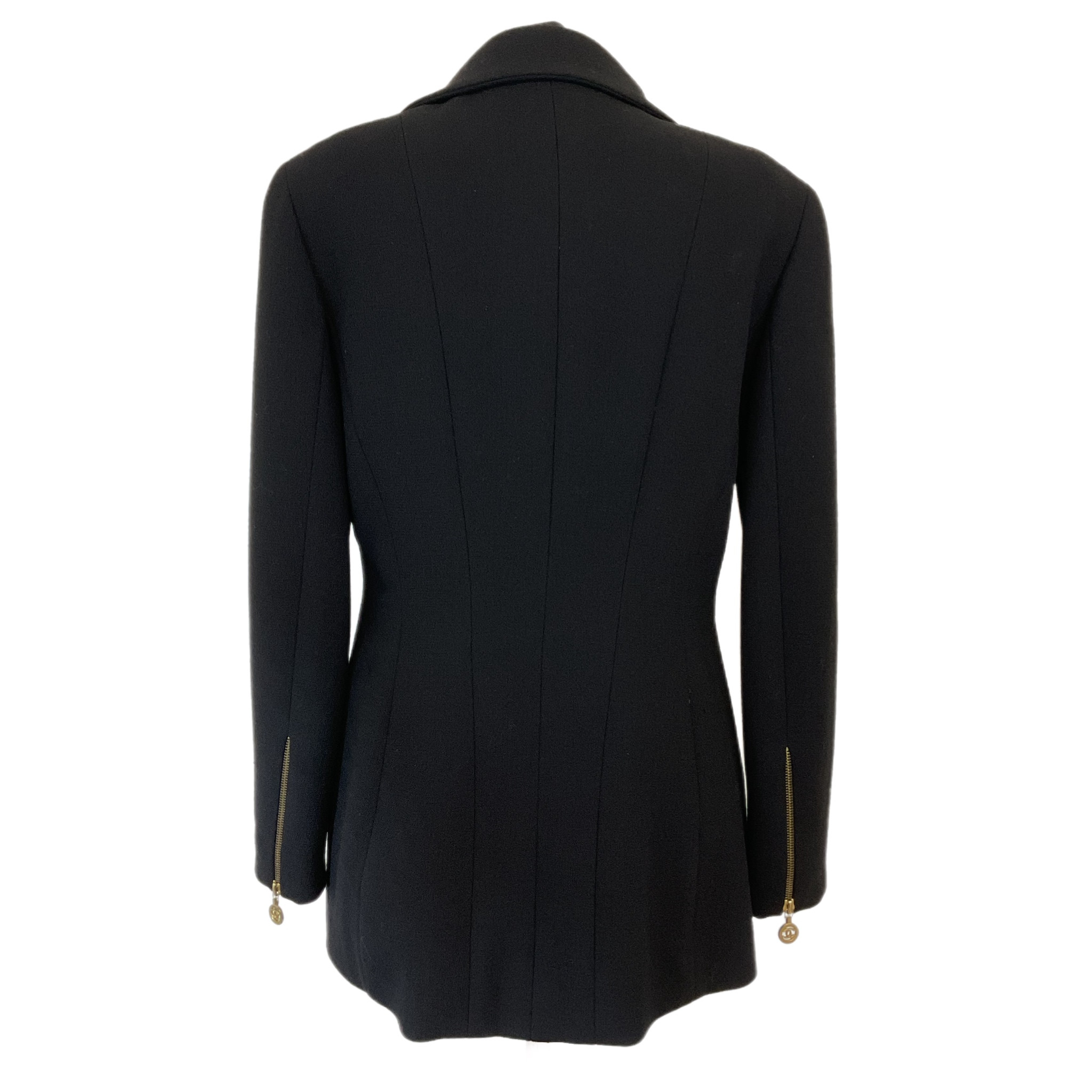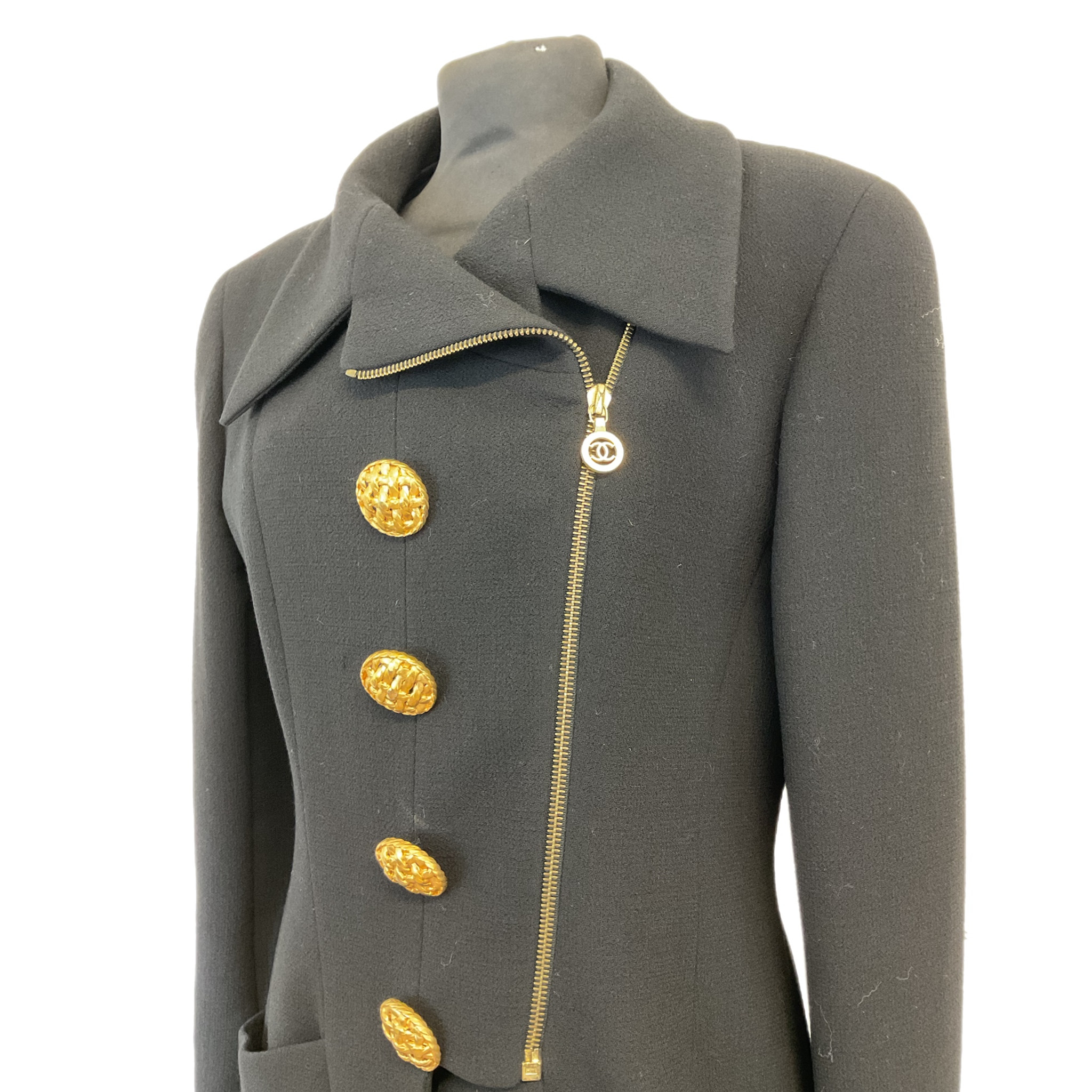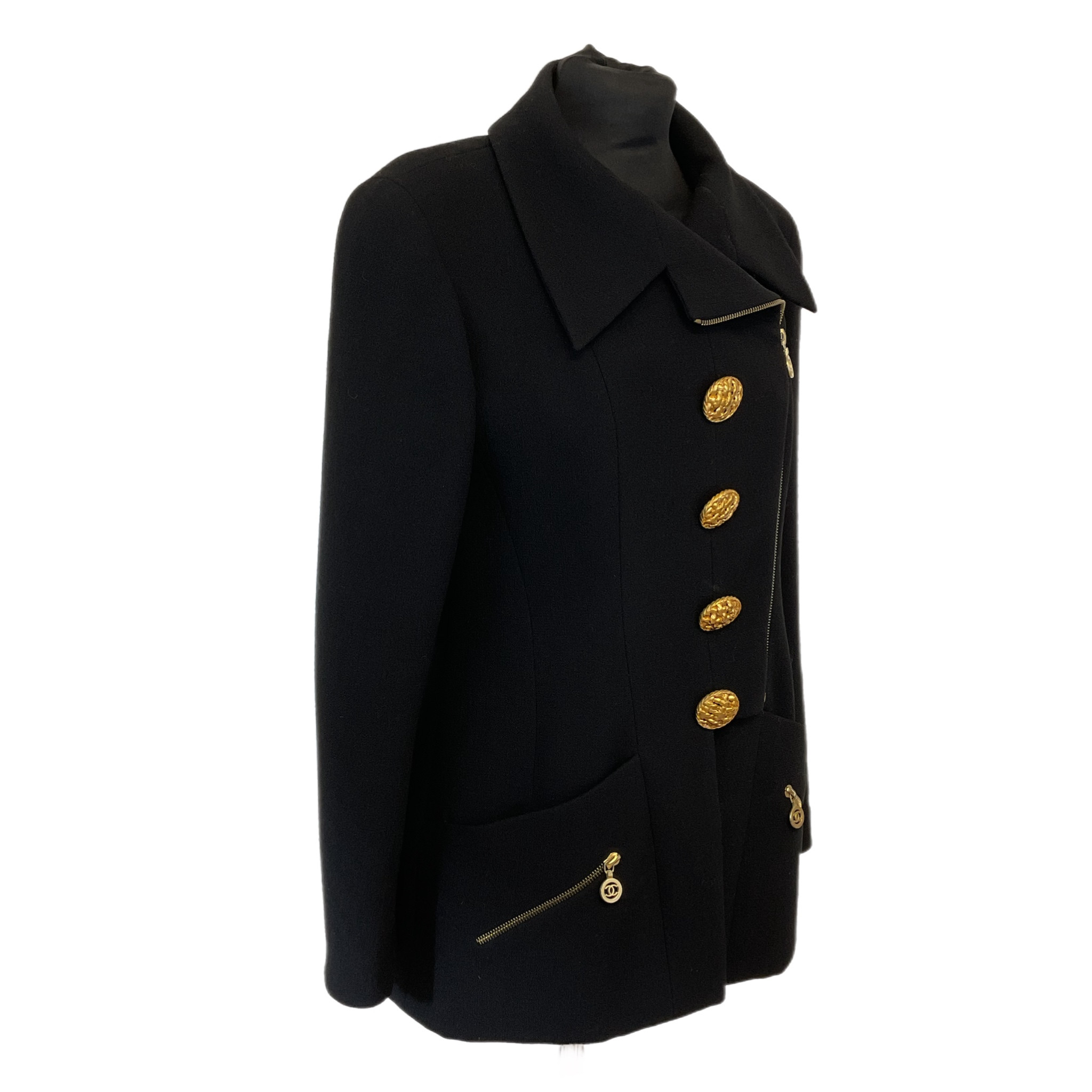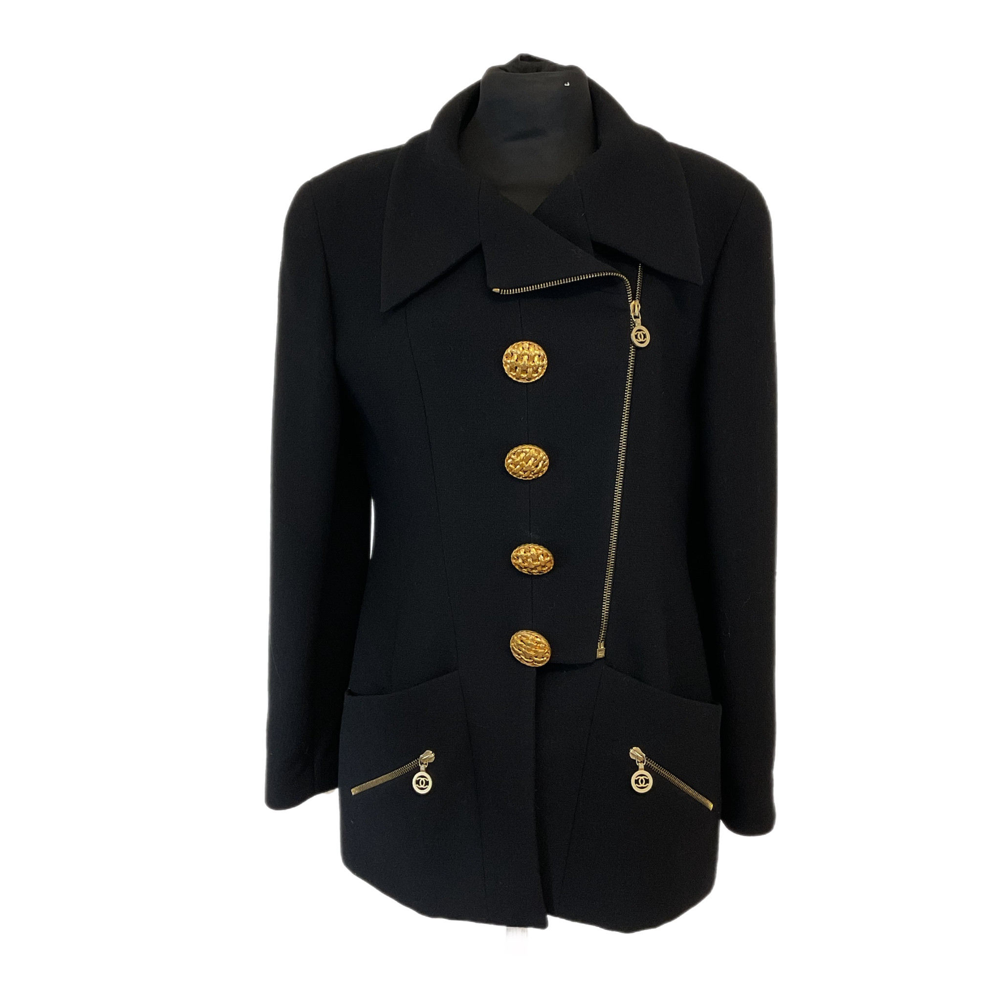 Giacca da donna dal taglio sartoriale Chanel in lana anni 2000 color nero, ideale per un look elegante e deciso. Il modello presenta una chiusura asimmetrica con zip frontale e una fila di bottoni dorati in stile bijoux che donano carattere e un tocco luxury al capo.