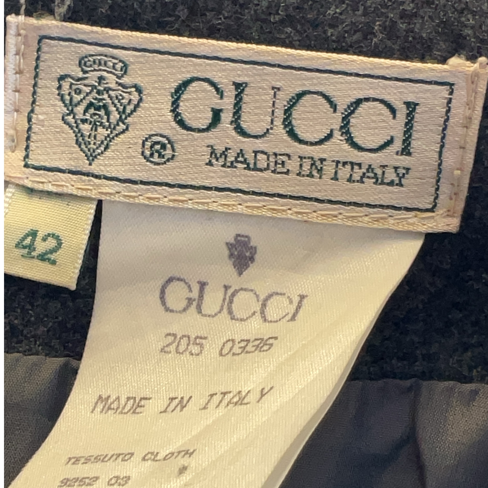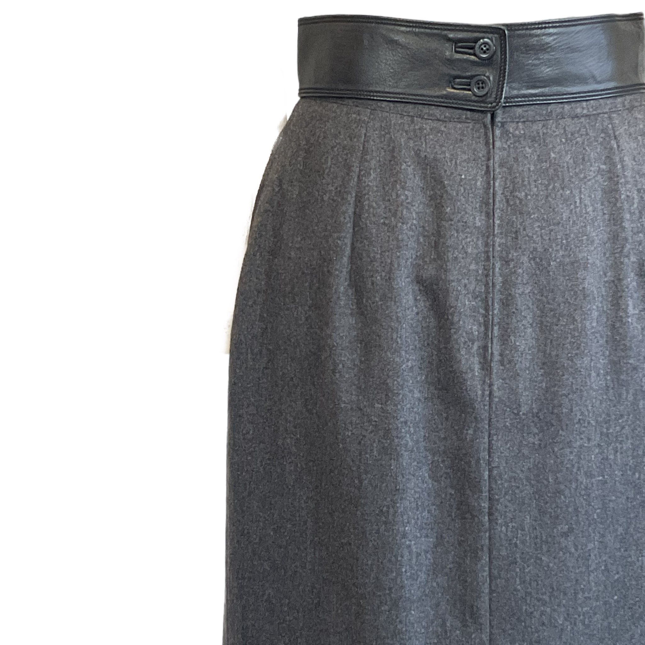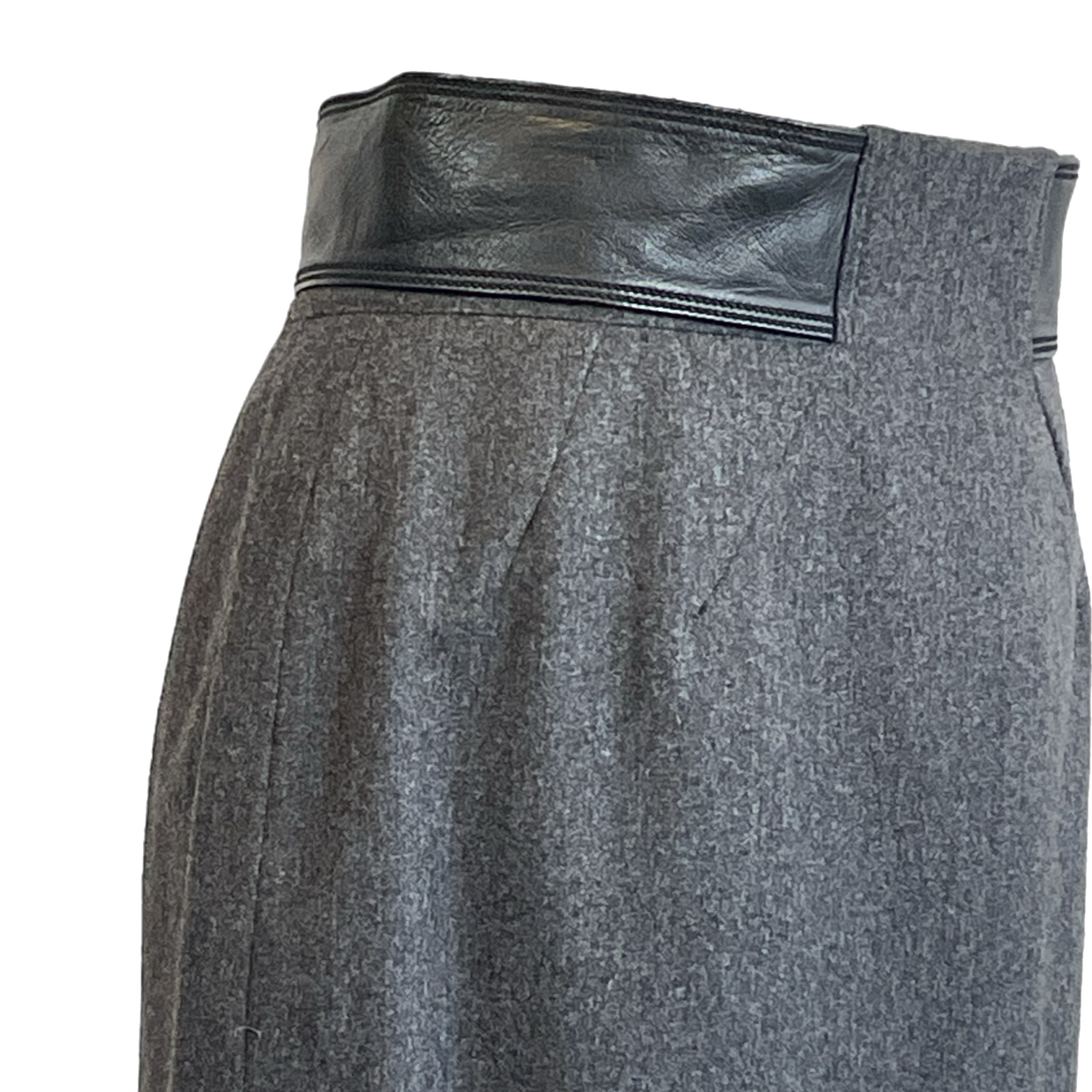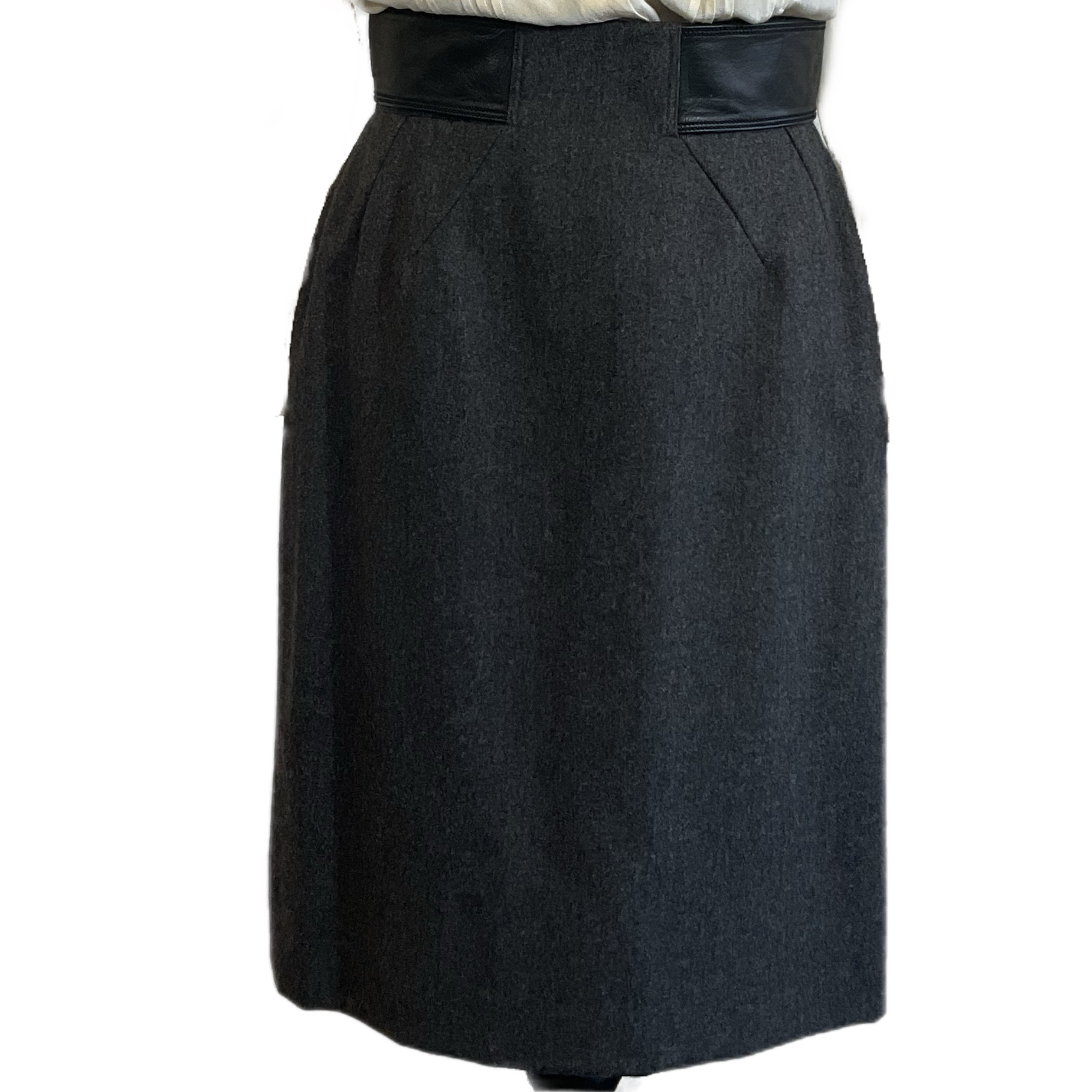 Gonna Gucci anni '80 in lana con cintura in pelle dal taglio elegante e femminile, realizzata in tessuto strutturato color grigio. Il design a vita alta valorizza la silhouette, mentre la fascia in pelle nera in vita aggiunge un dettaglio moderno e raffinato. Le cuciture sagomate frontali donano una vestibilità impeccabile e un look professionale. Lunghezza al ginocchio, linea dritta leggermente affusolata.Ideale per outfit business e occasioni formali, perfetta da abbinare a camicie, bluse o blazer.