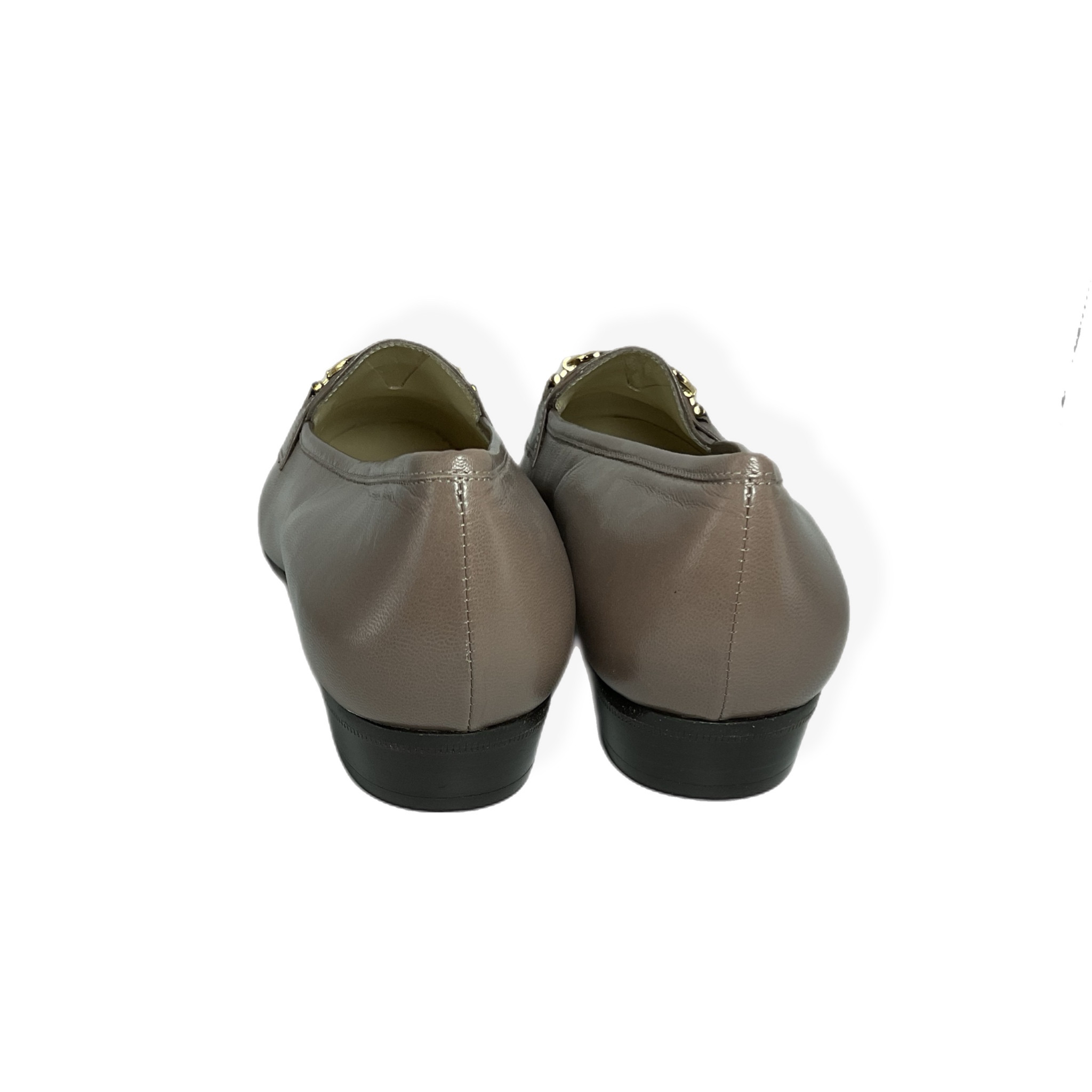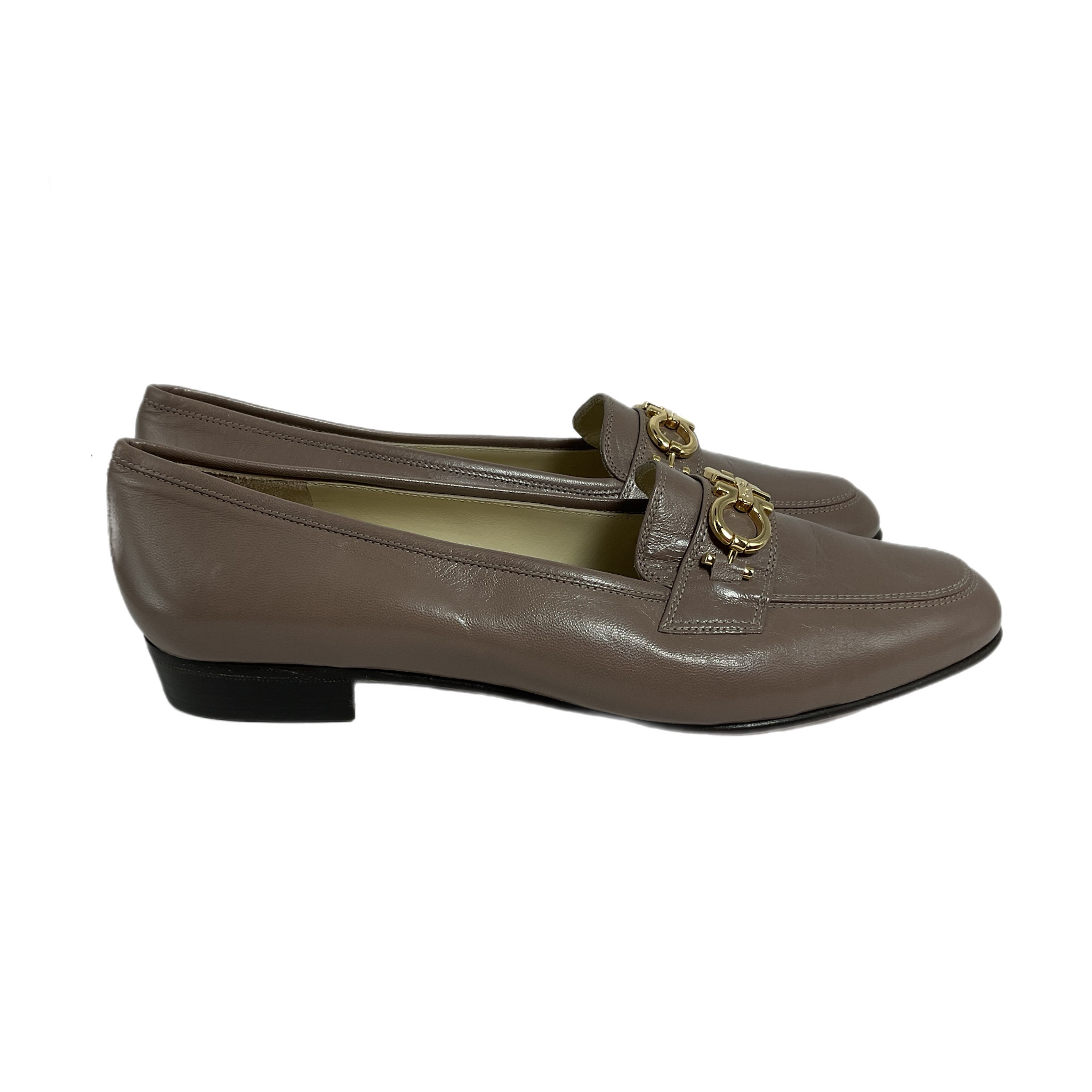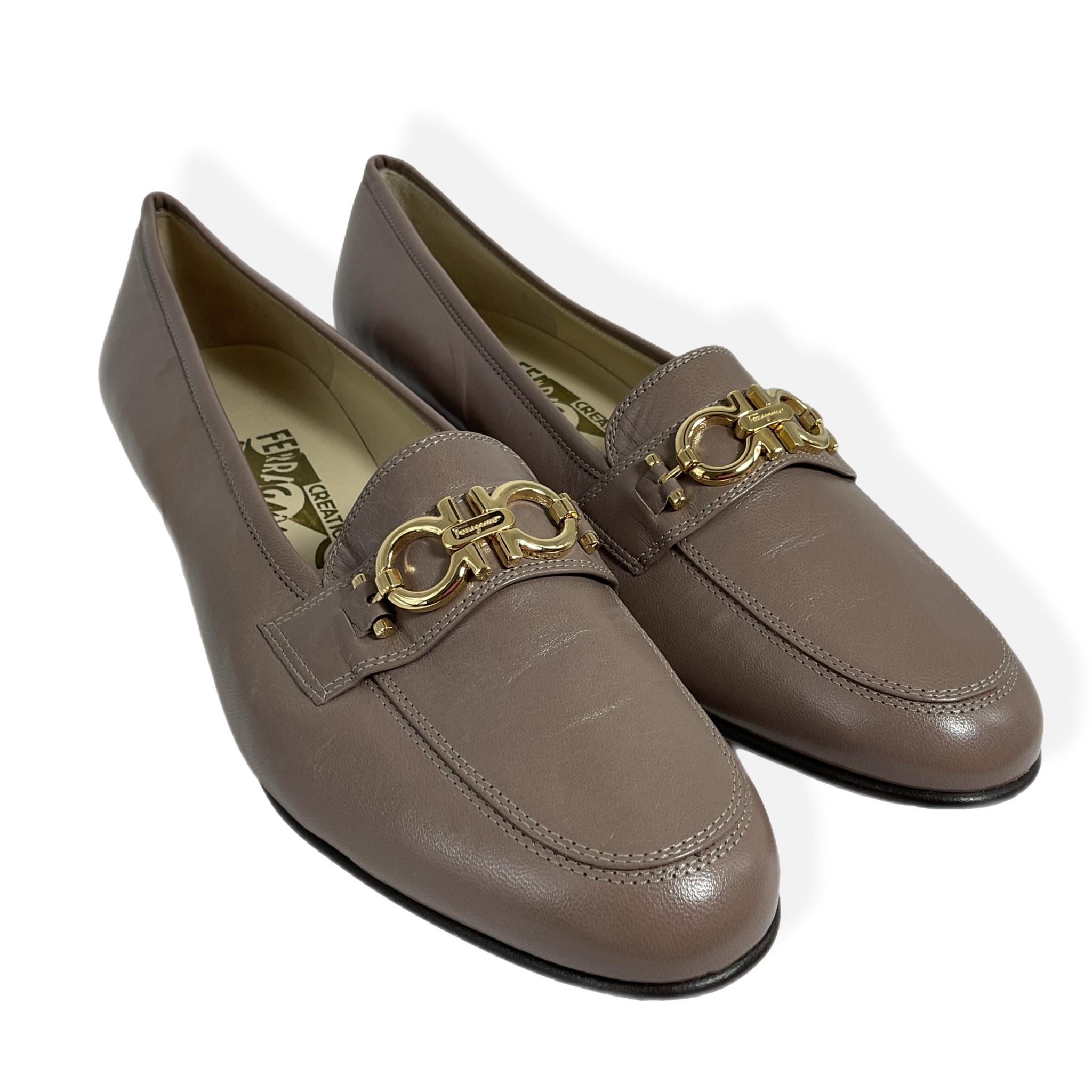 Mocassini Salvatore Ferragamo, in pelle e suola in cuoio con decoro gancini edizione limitata disegnata nel 1980 e ricreata negli anni 2000 di colore fango.