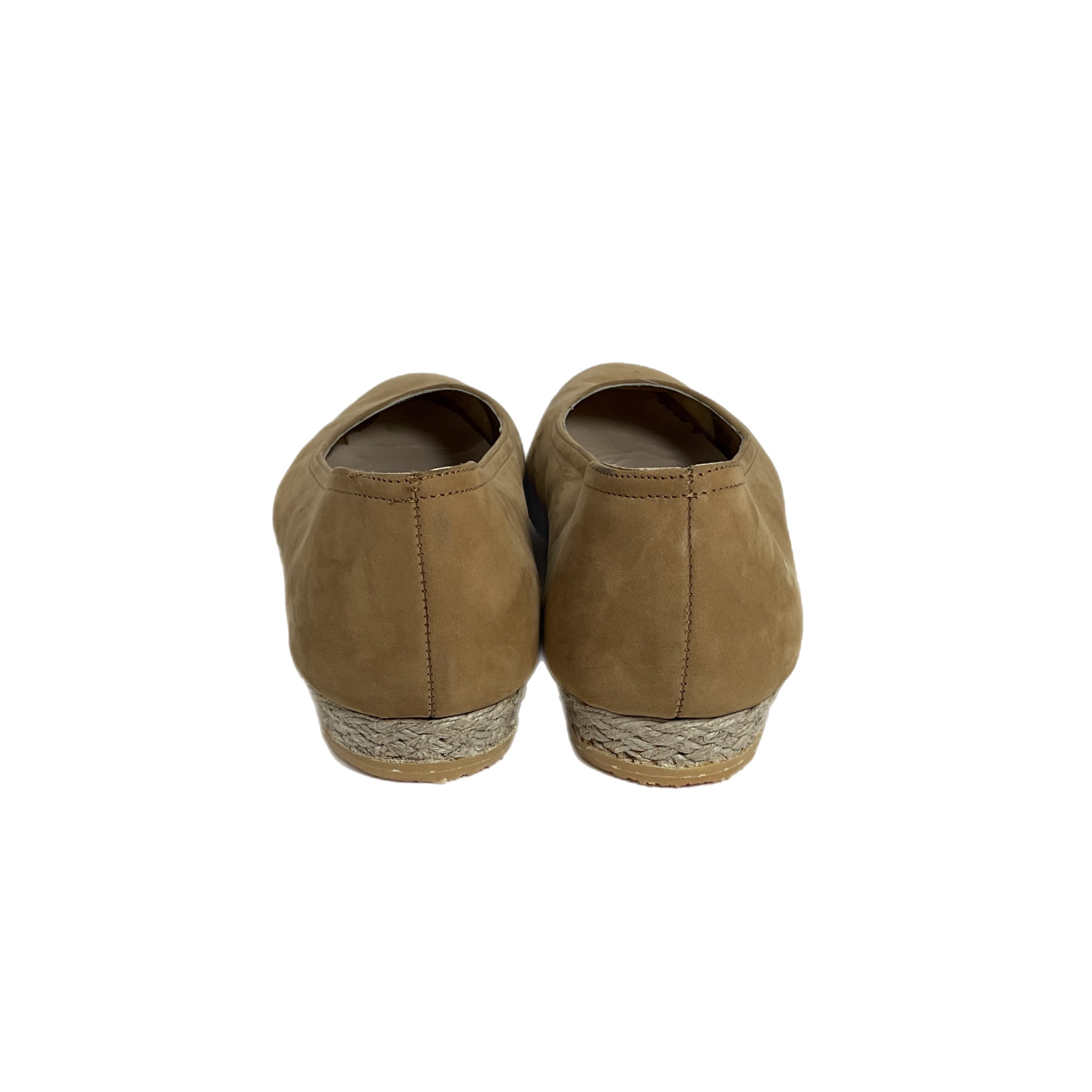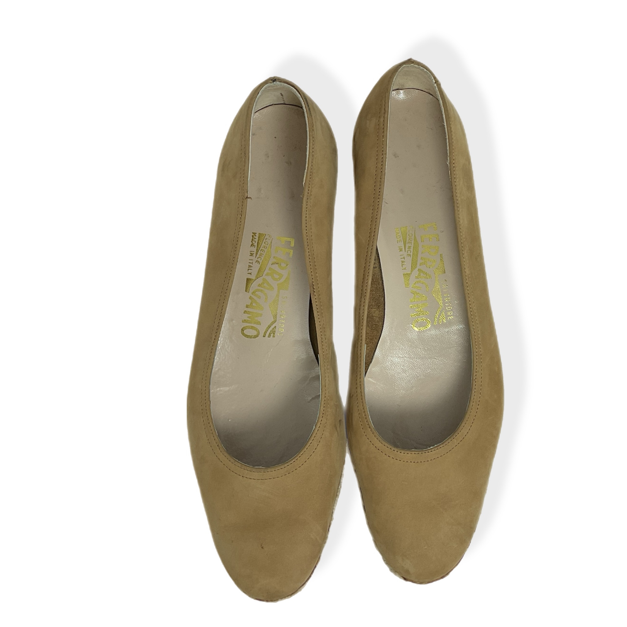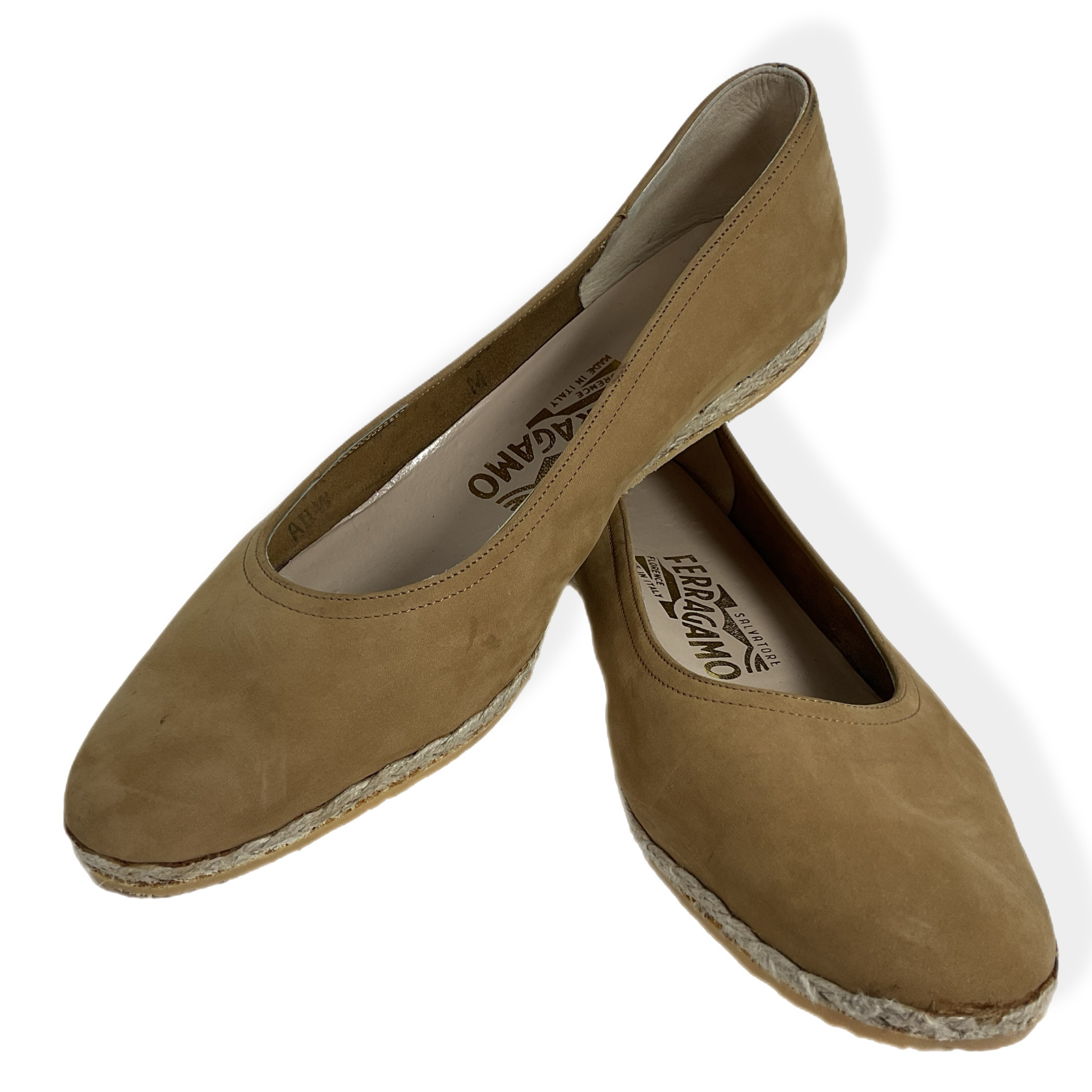 Espadrillas Salvatore Ferragamo con tacco 2 cm in pelle camoscio di colore marrone chiaro, con punta arrotondata, con suola in gomma.