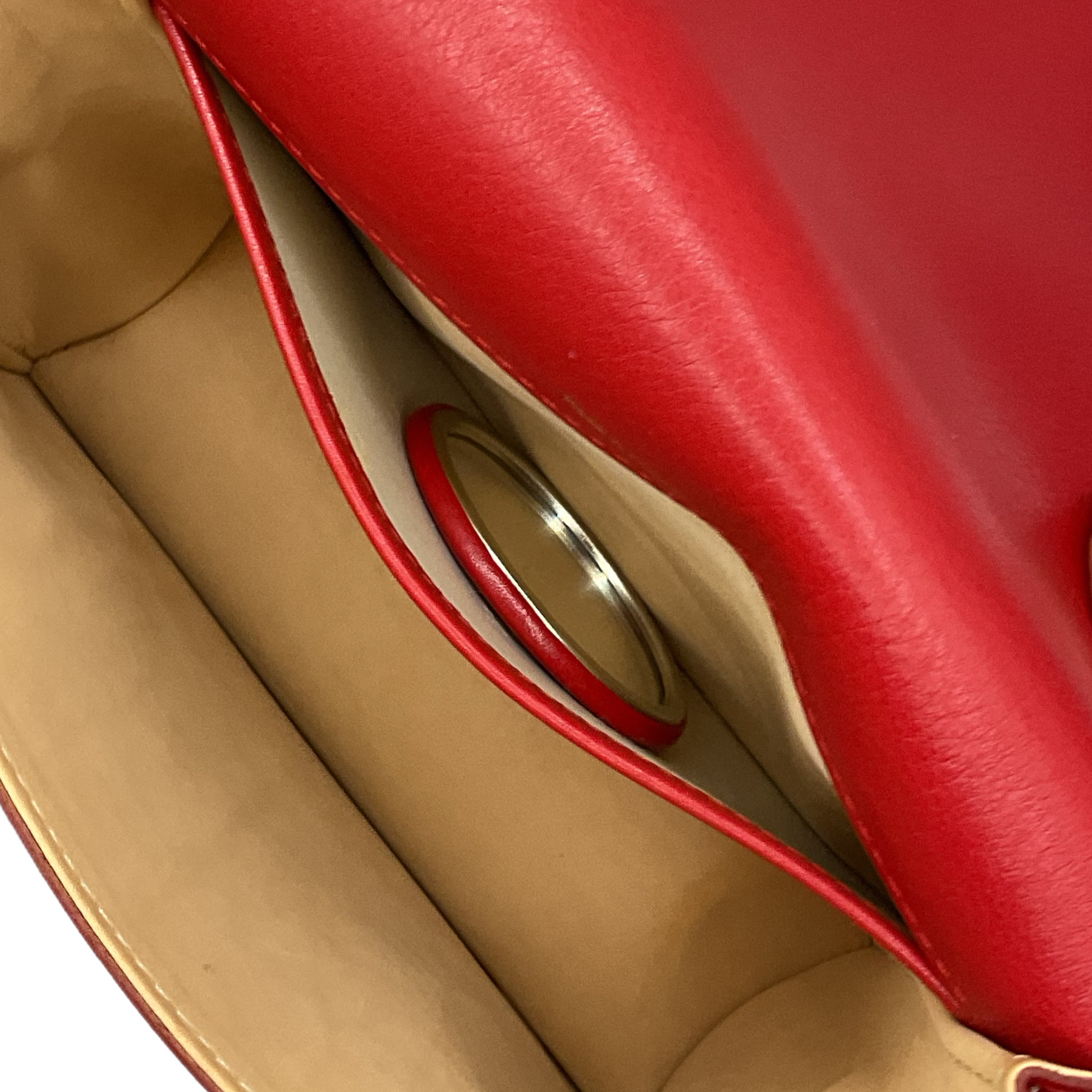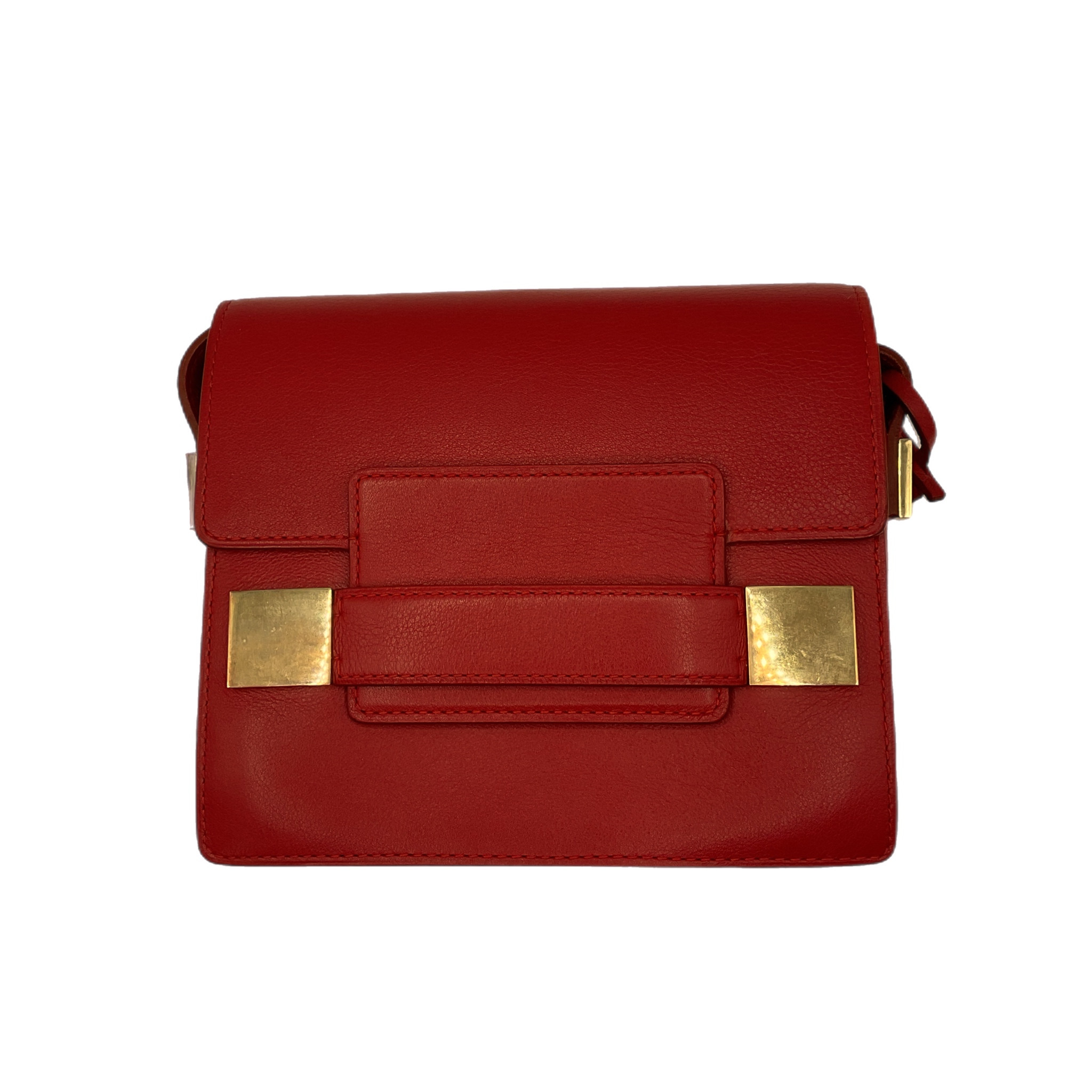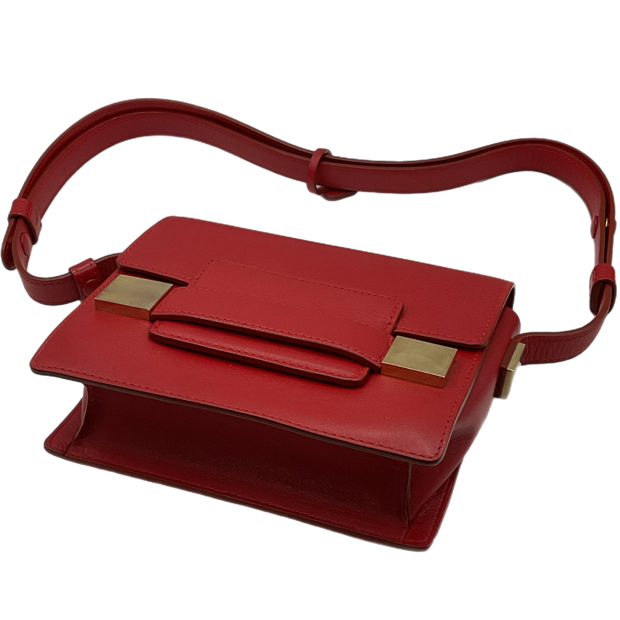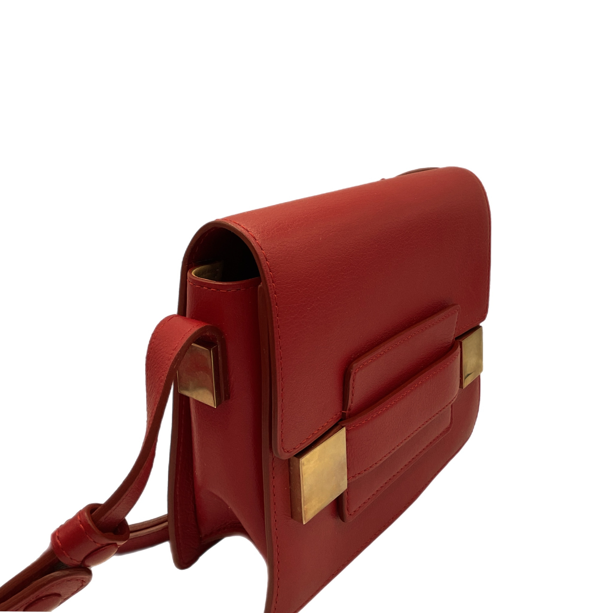 La borsa è in pelle di vitello liscia in una tonalità rosso cremisi con fermagli metallici squadrati in finitura oro e logo dorato stampato a caldo all'interno.