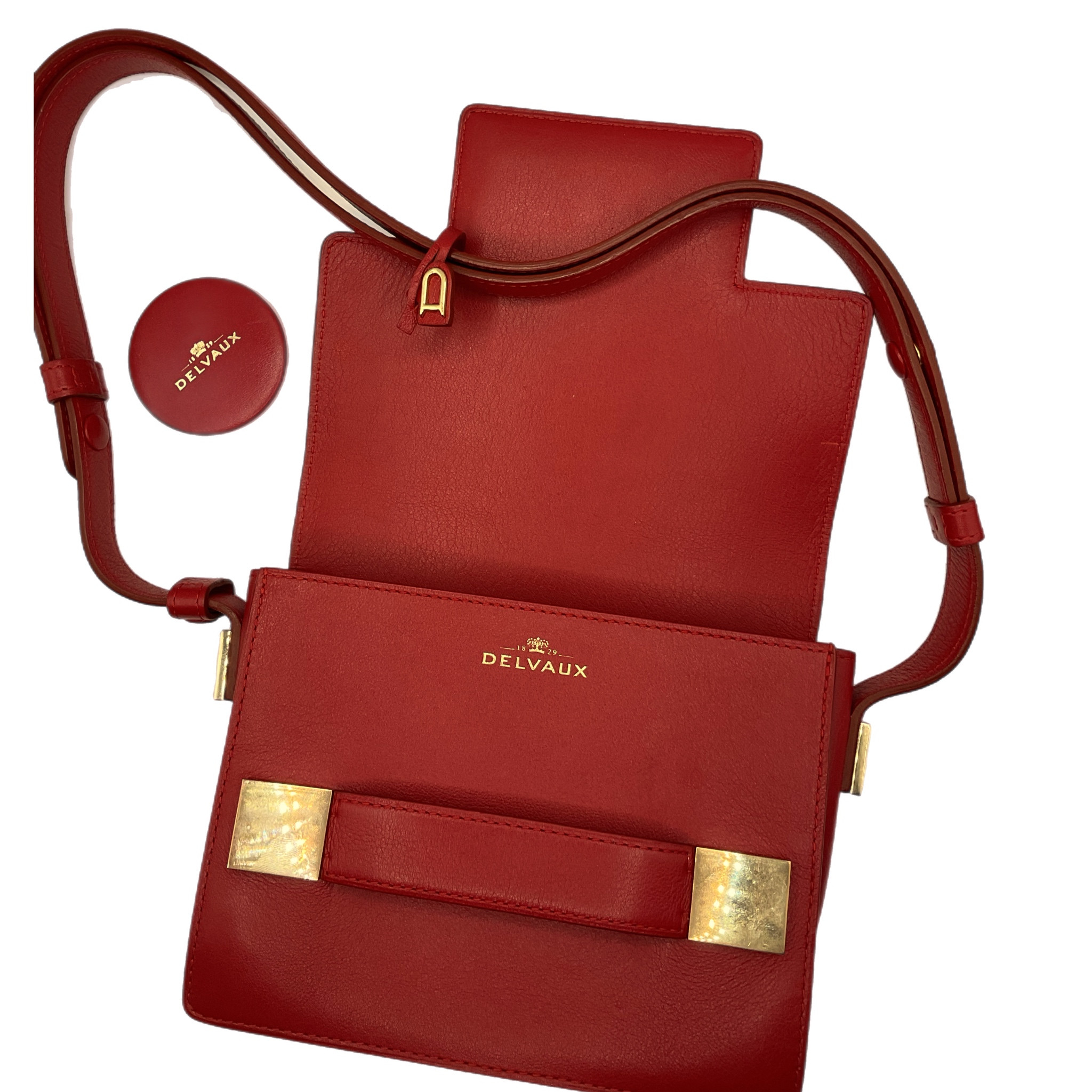 Dentro troviamo uno specchietto da borsa coordinato con logo Delvaux in oro.