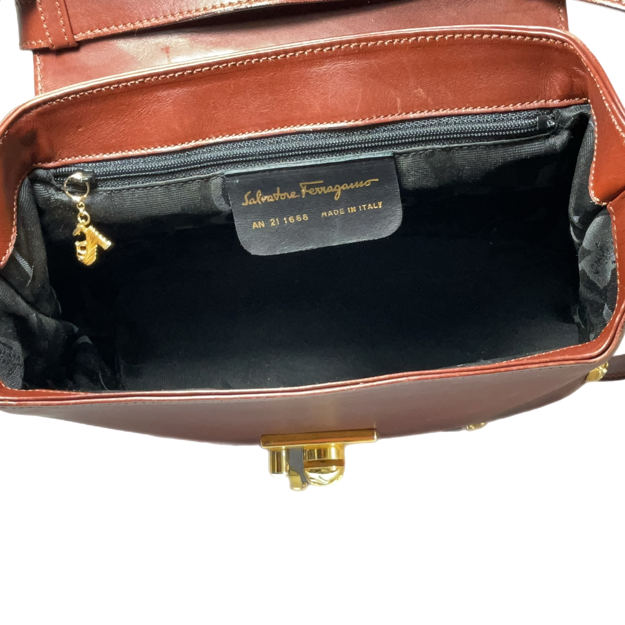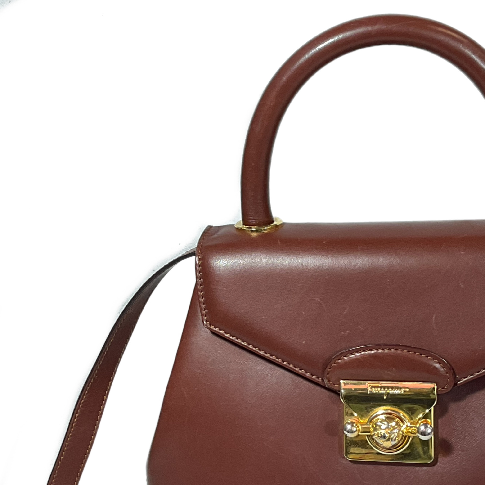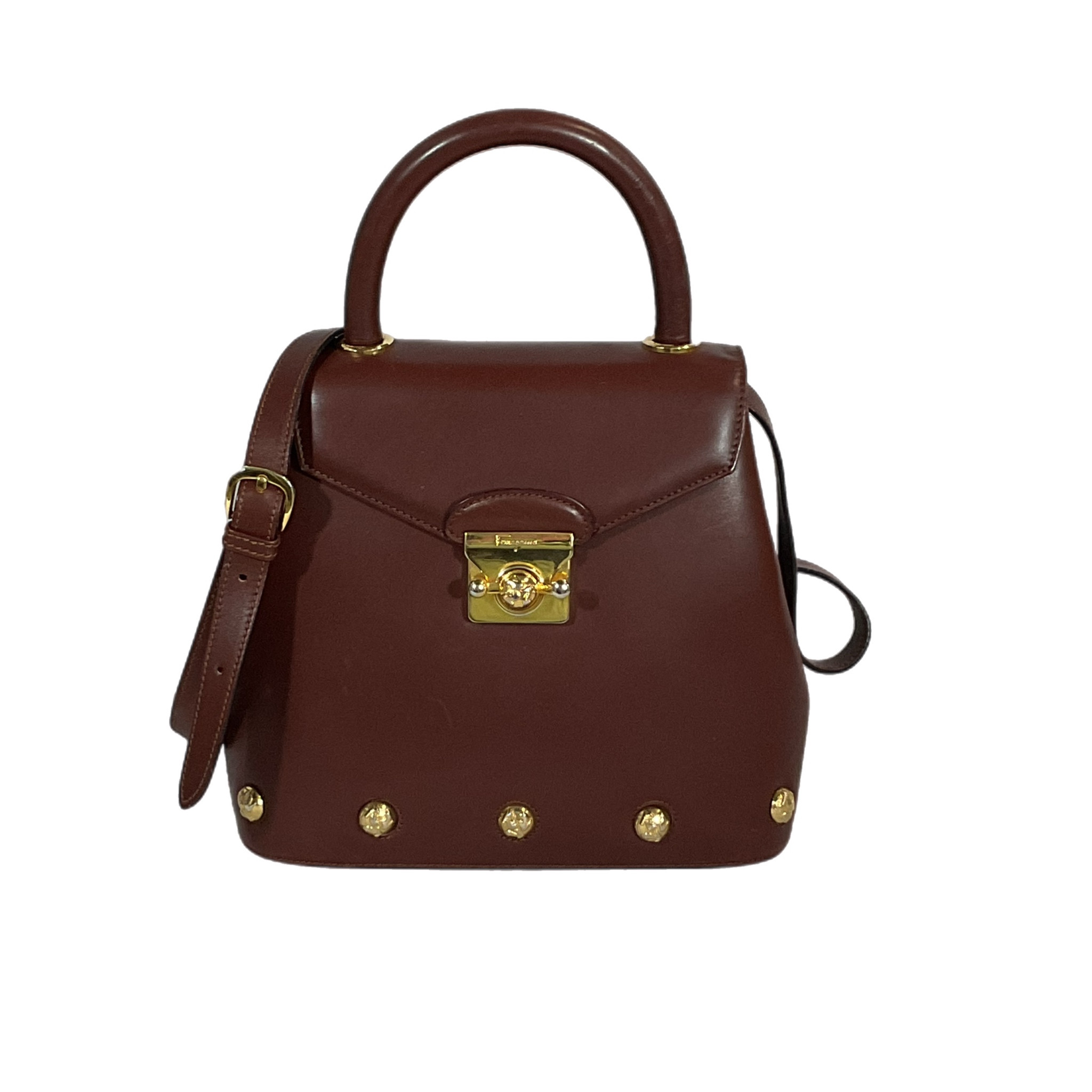 Borsa Salvatore Ferragamo anni 2000 in pelle liscia marrone con elementi in metallo color oro, la chiusura a gancio rotante la rende sicura e unica.