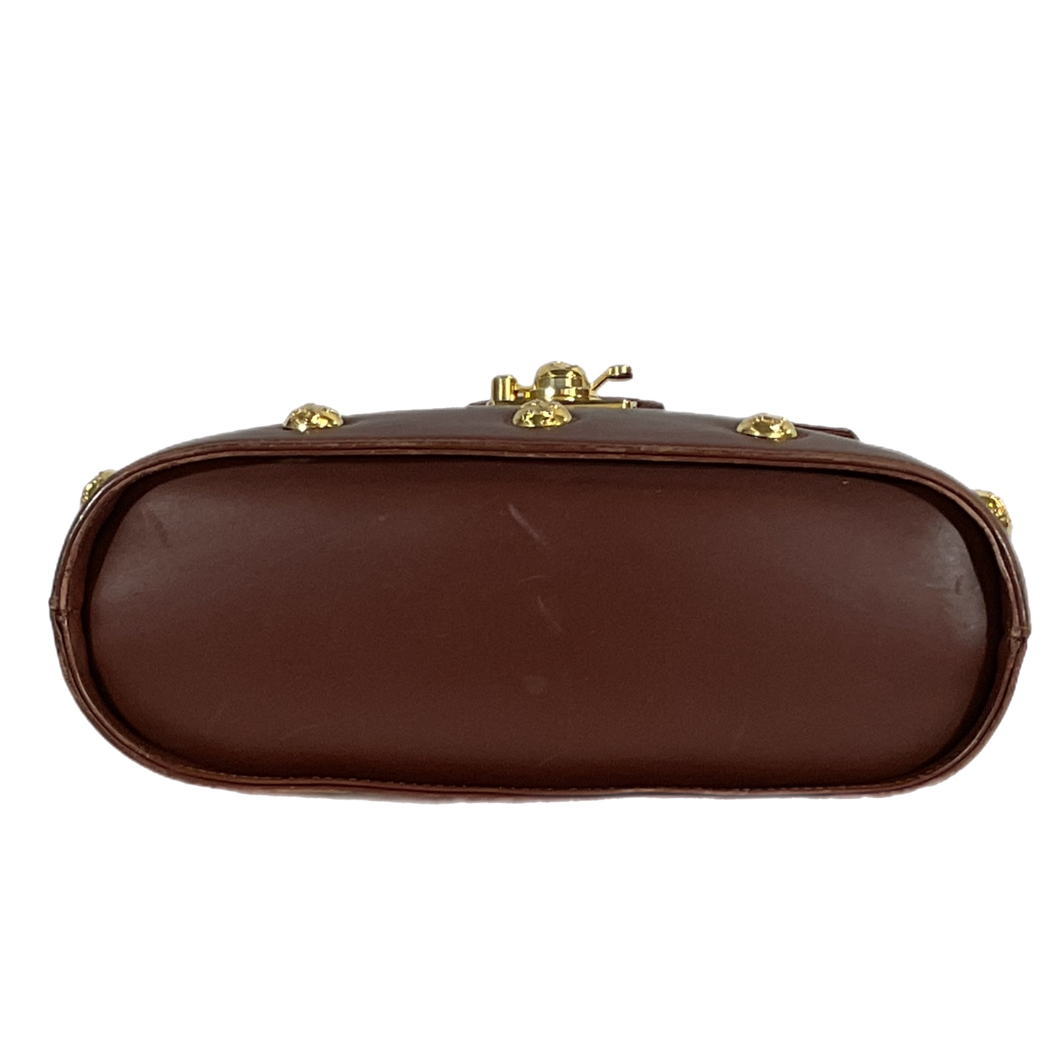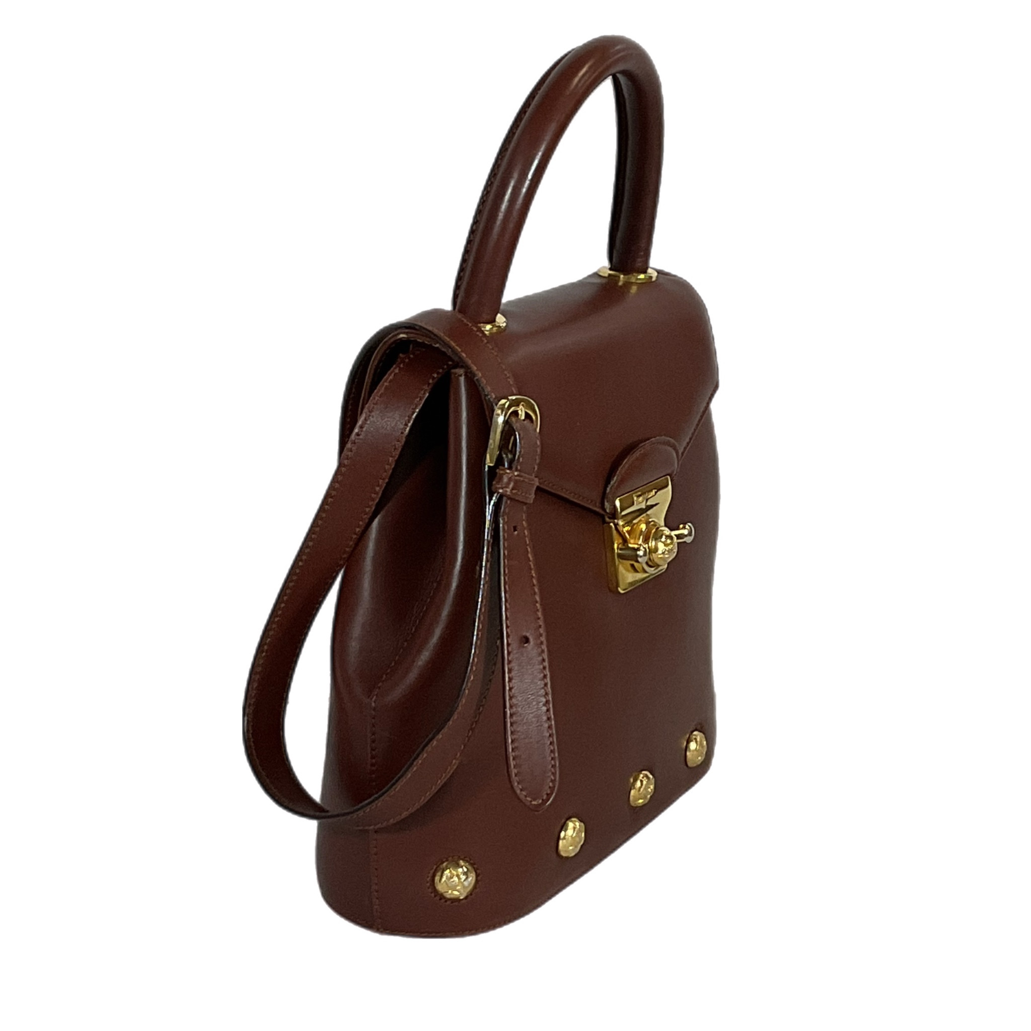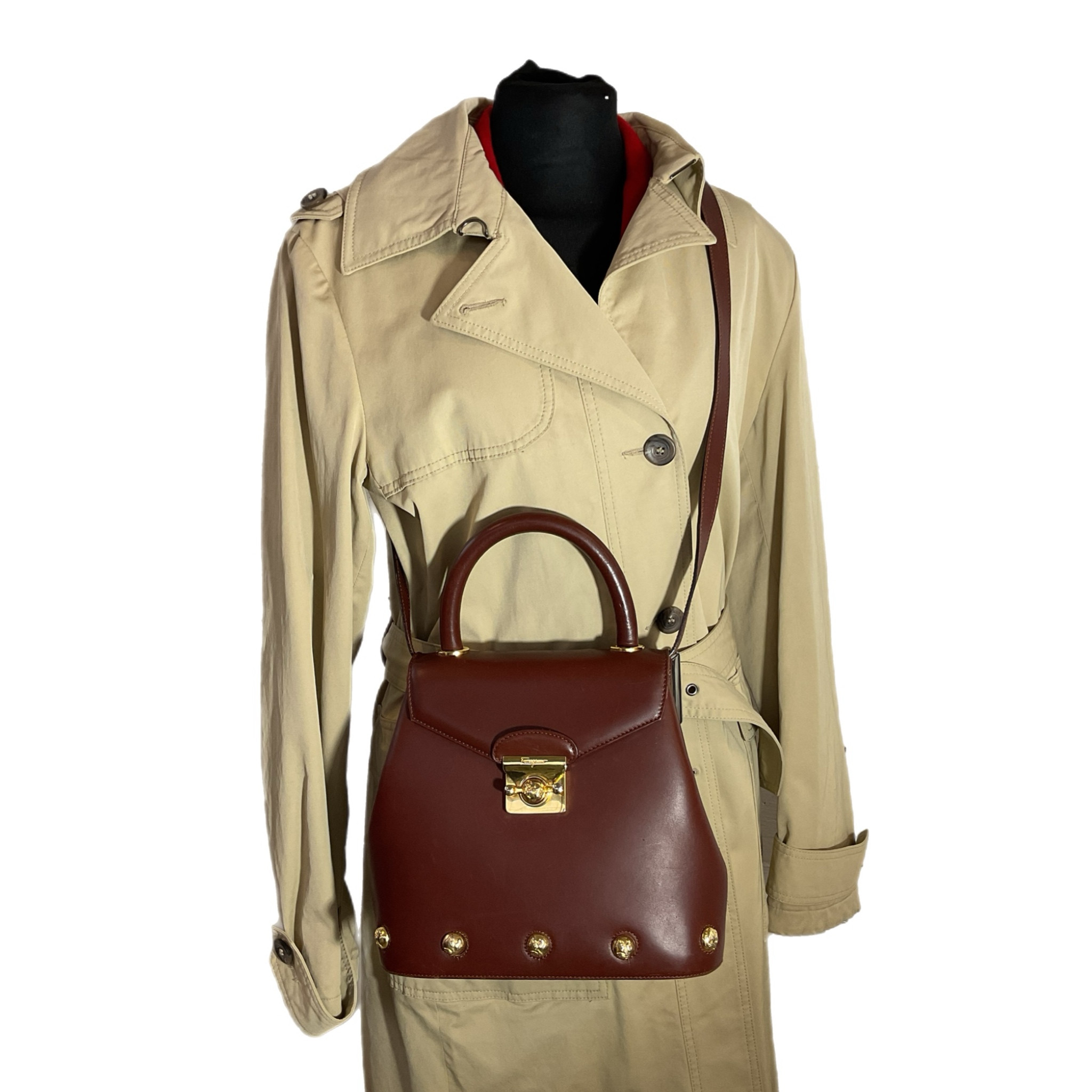 Borsa Salvatore Ferragamo anni 2000 in pelle liscia marrone con elementi in metallo color oro, la chiusura a gancio rotante la rende sicura e unica.