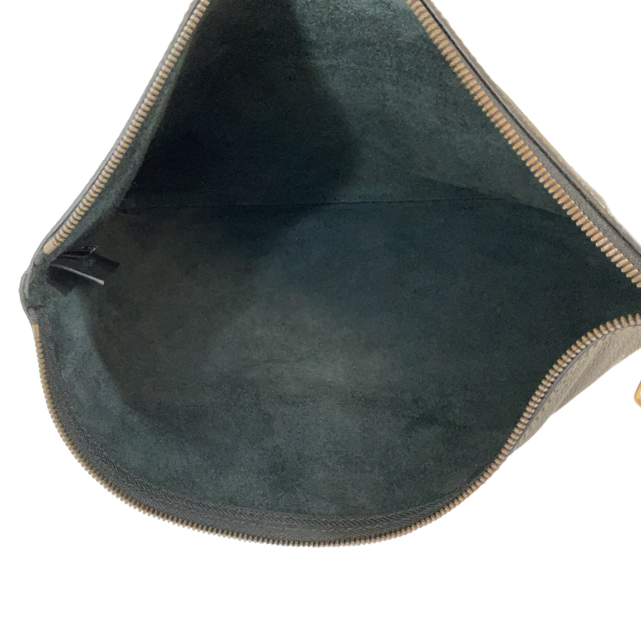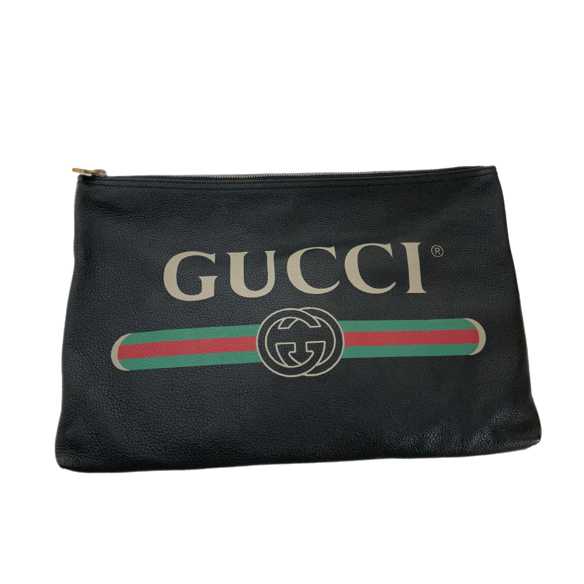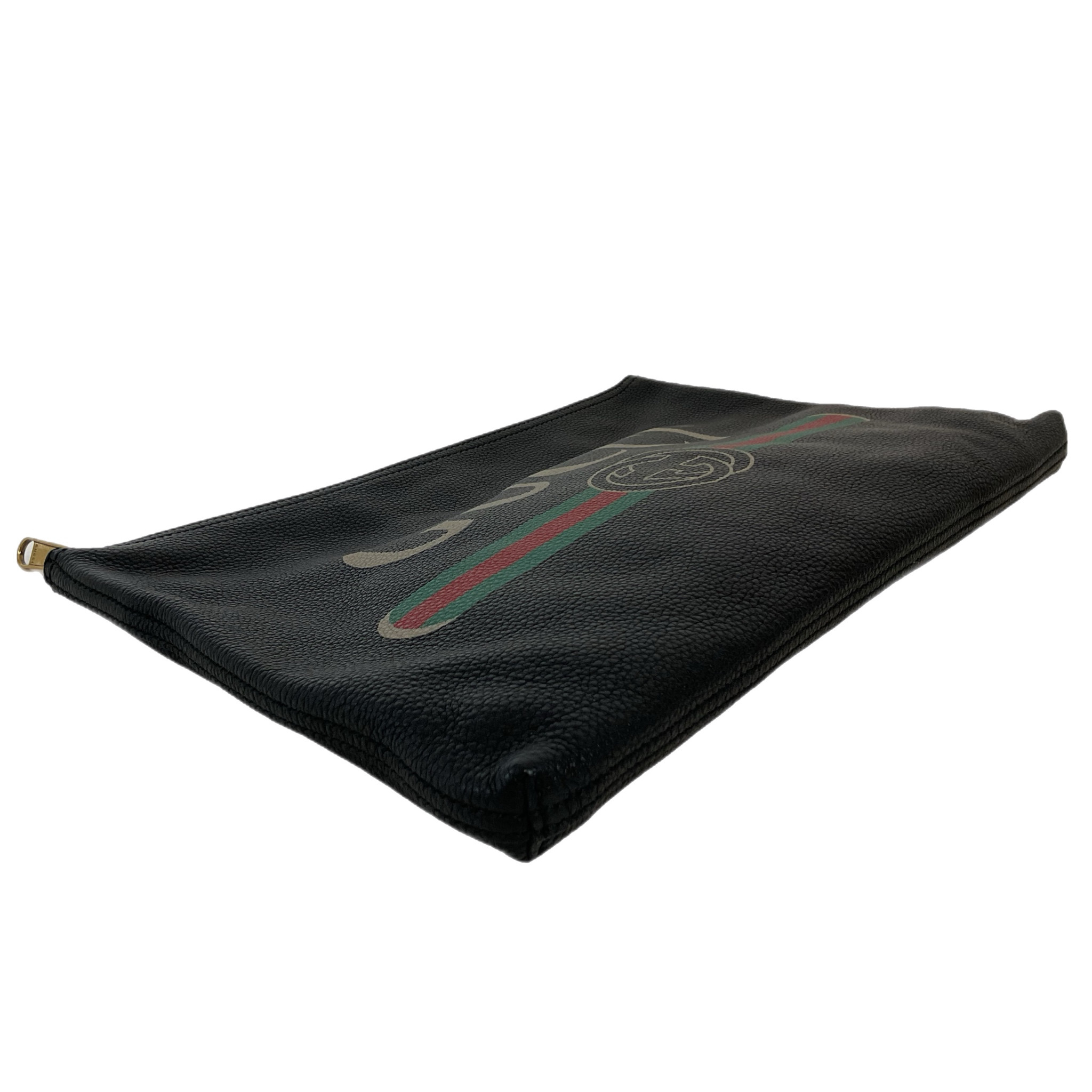 Gucci Pochette in pelle nera martellata con logo oro e bande verdi e rosse anni 2000.Il design esclusivo e sofisticato è perfetto per ogni occasione, mentre l'interno non foderato e la chiusura con zip aggiungono praticità.