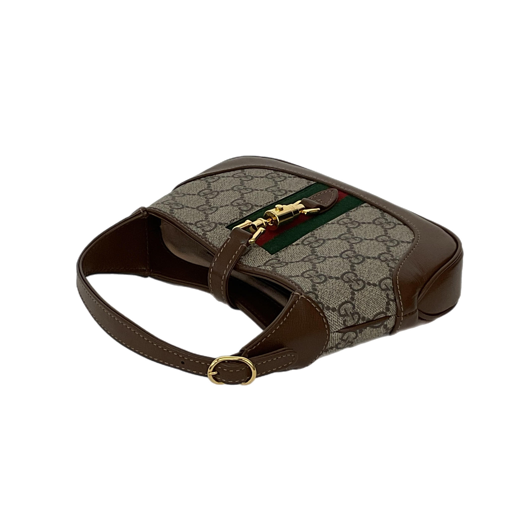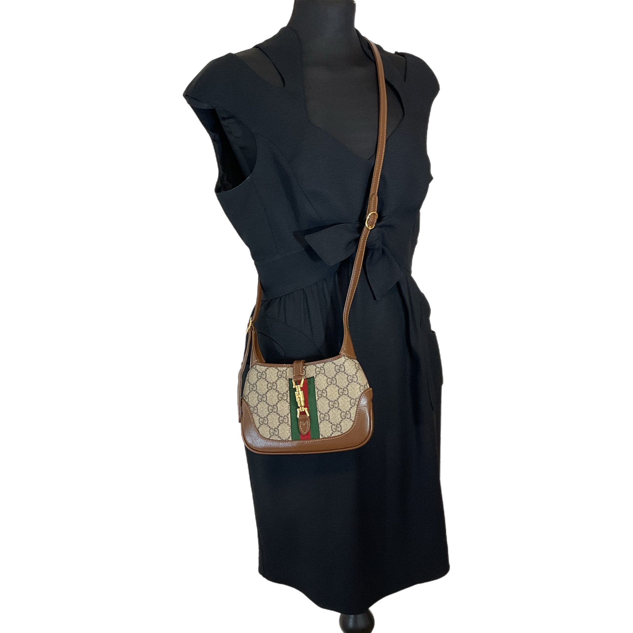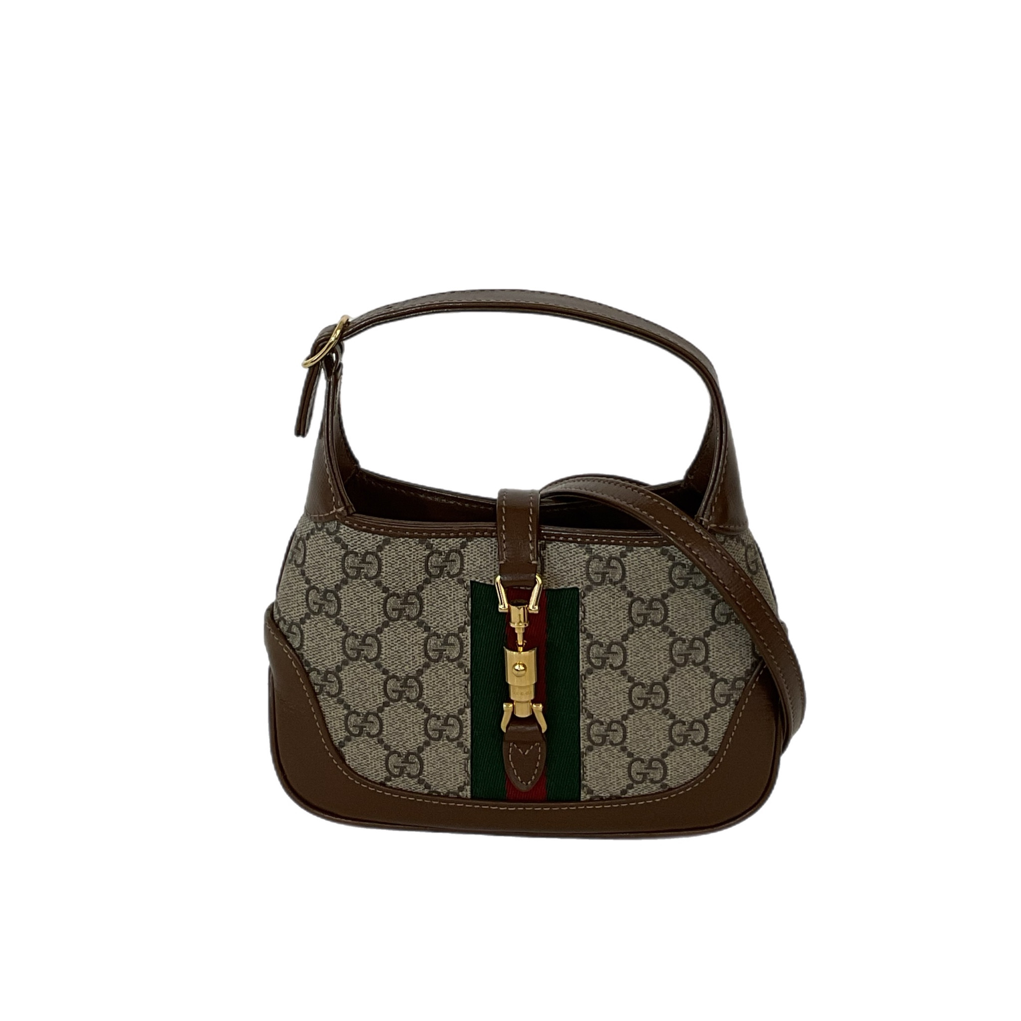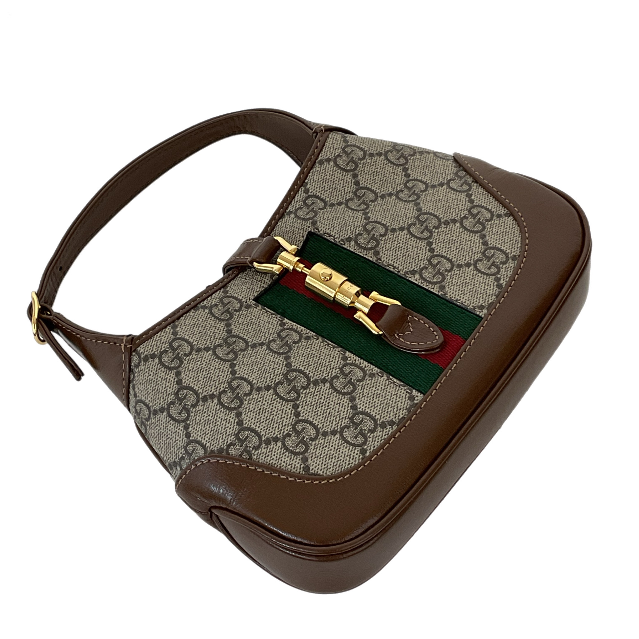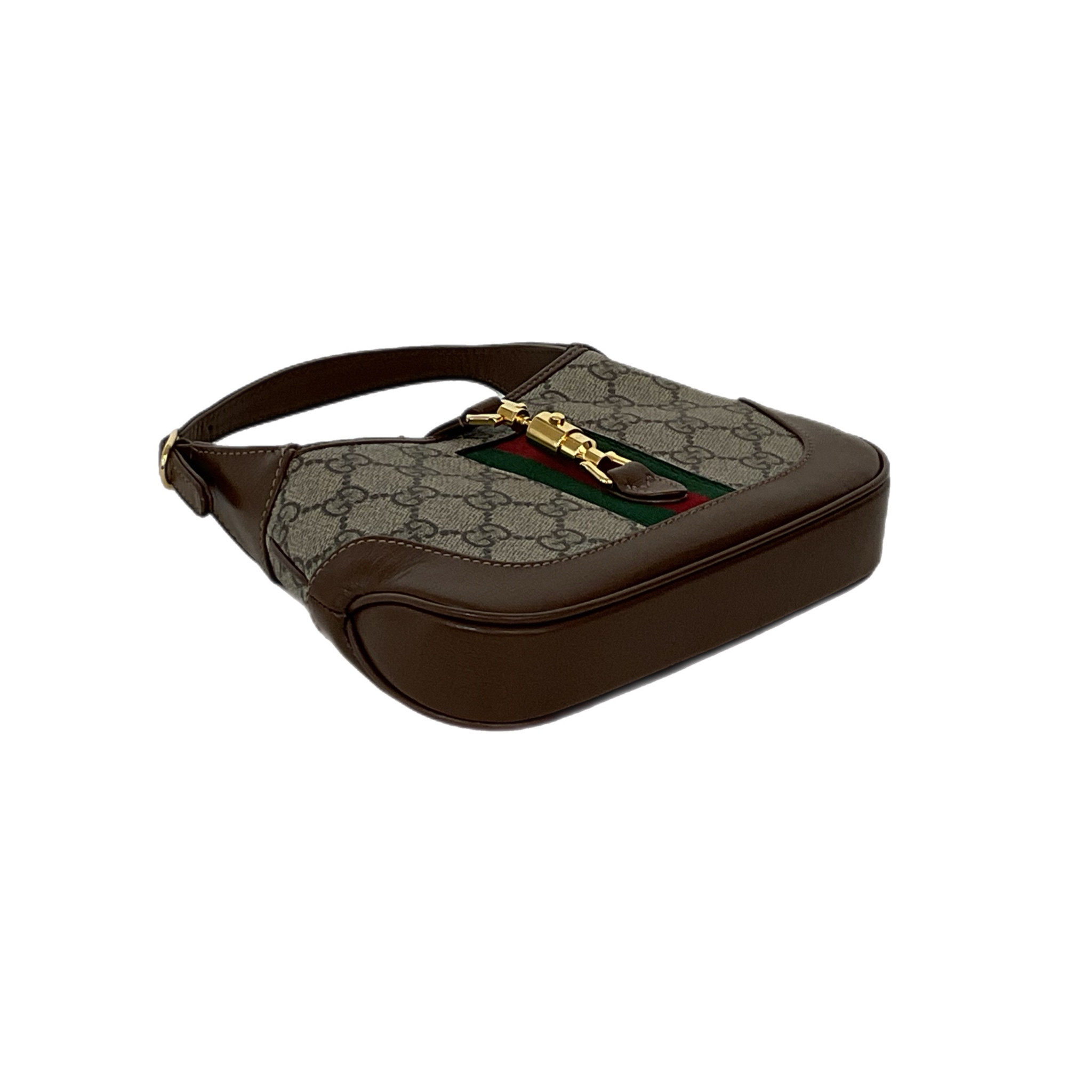 Mini borsa Jackie 1961 in tessuto GG Supreme beige ed ebano con finiture in pelle marrone e dettaglio Web verde e rosso. Presenta tracolla regolabile e removibile, chiusura a pistone, uno scomparto interno principale e una fessura interna per carte.