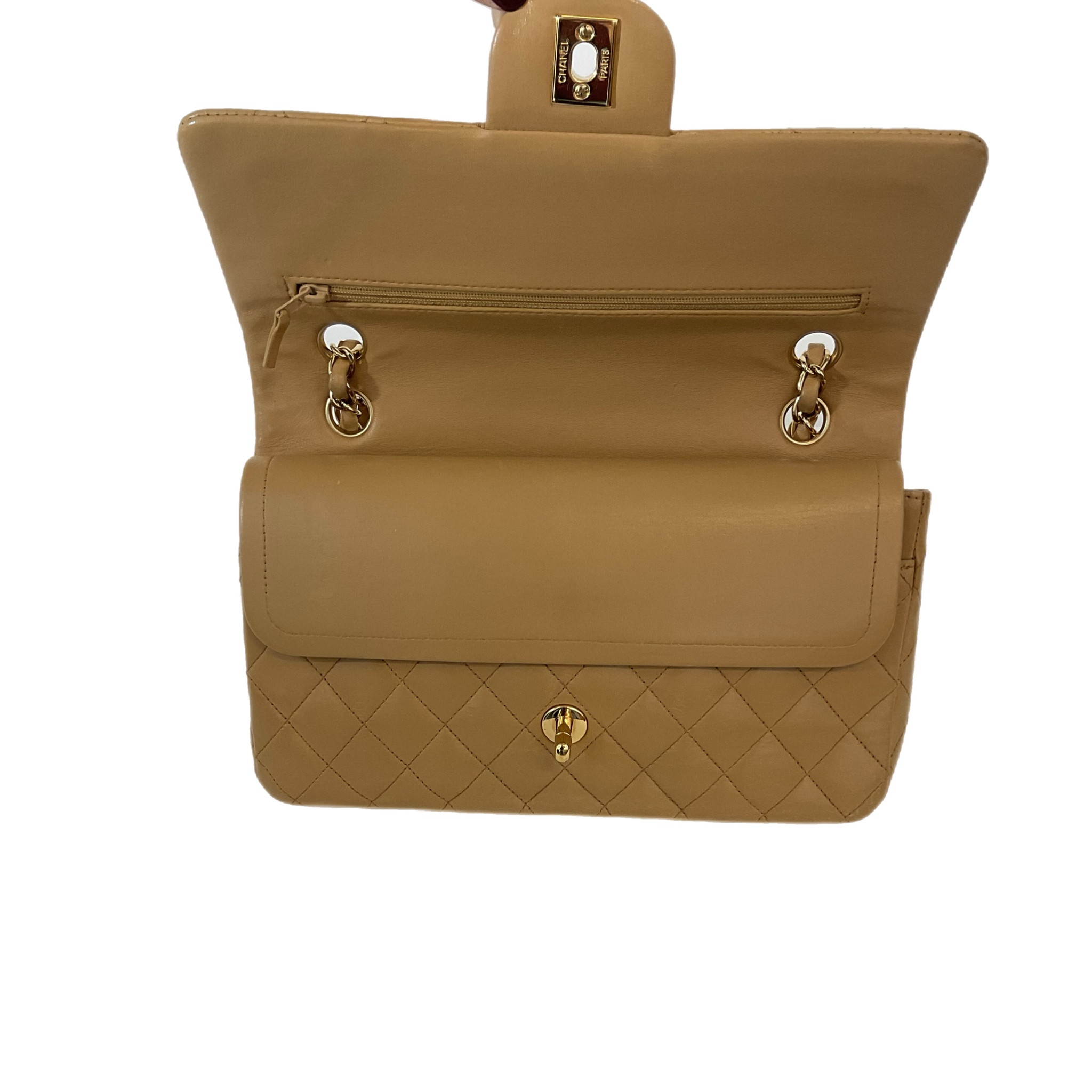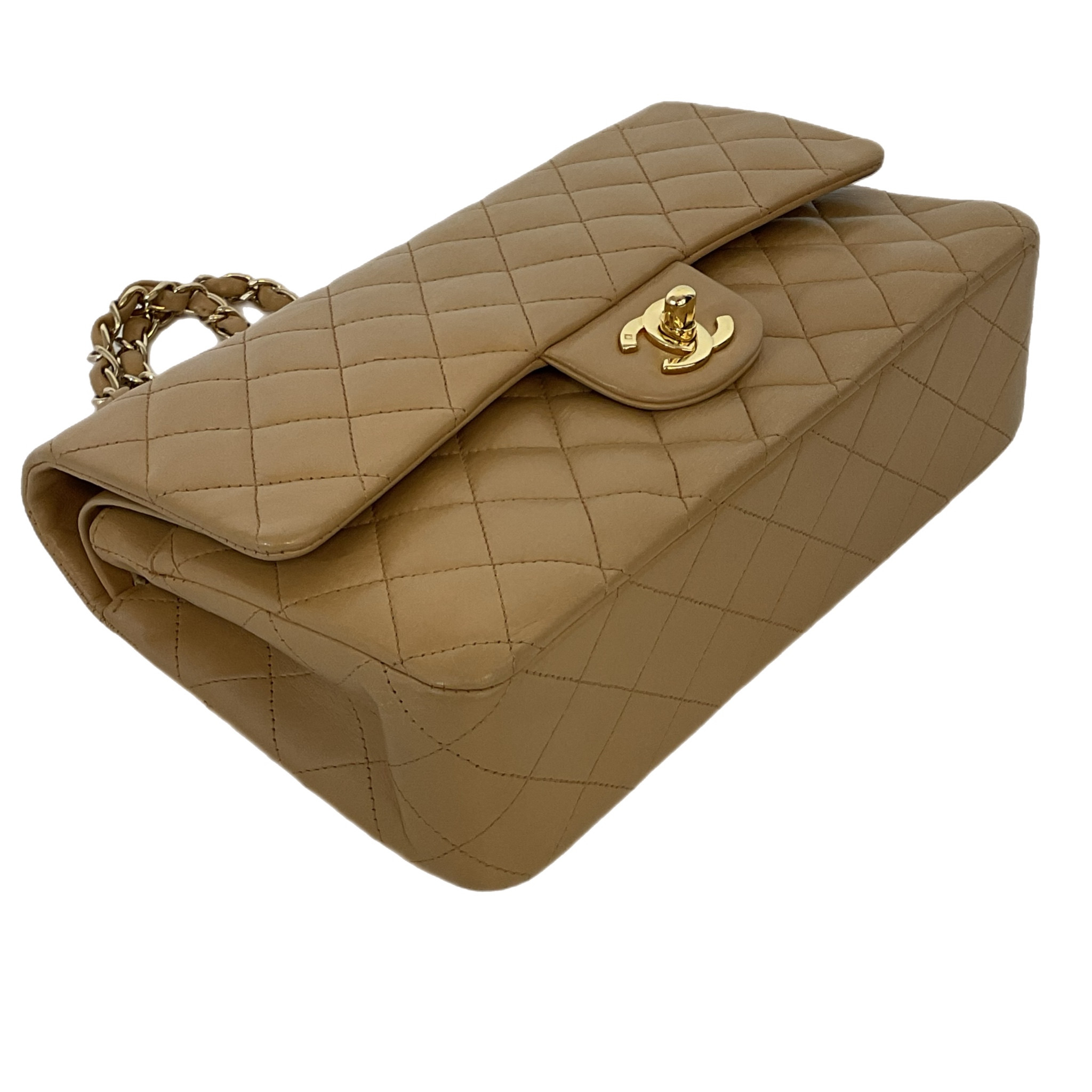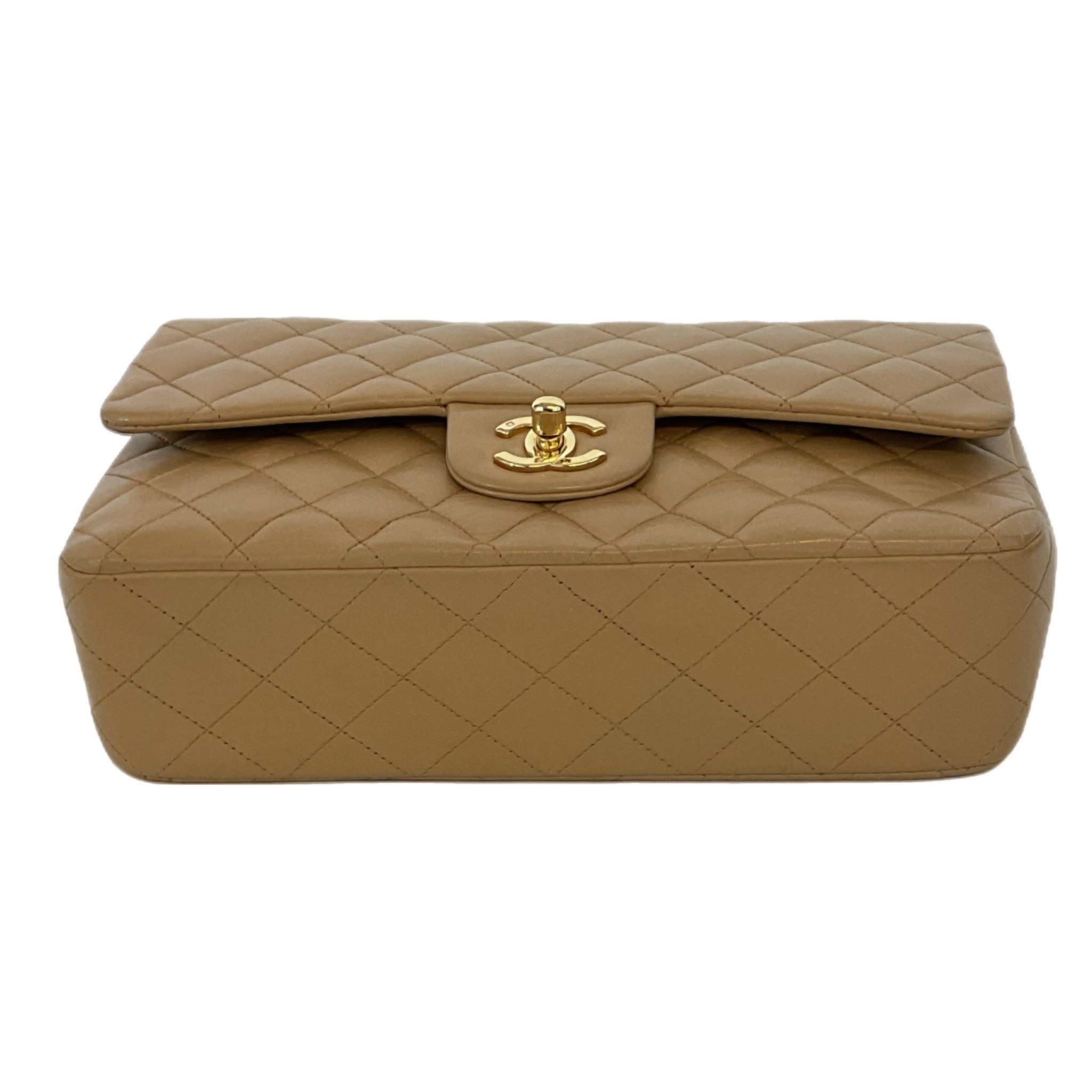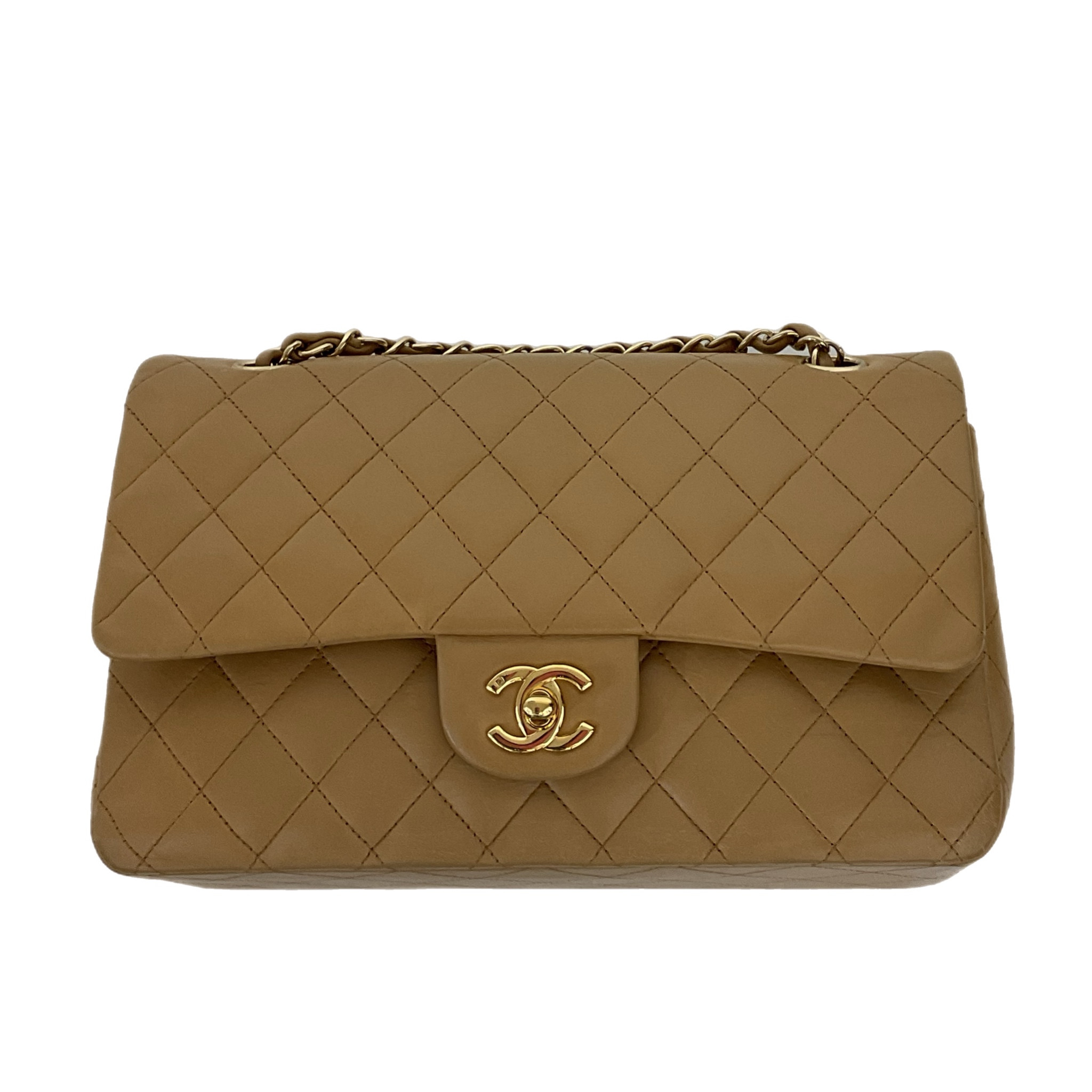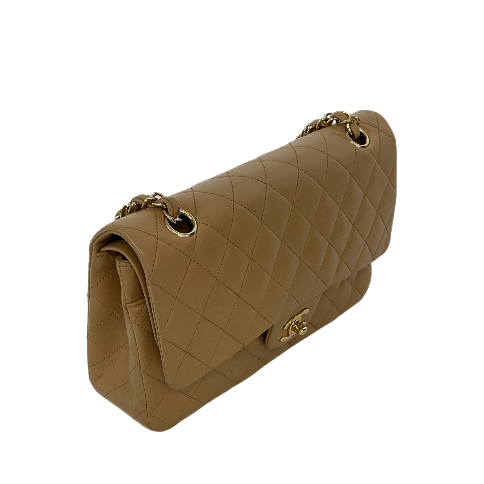 Elegante borsa Chanel Timeless in pelle trapuntata marrone, inserti in metallo dorato, una tracolla a catena in metallo dorato con intrecci di pelle marrone da portare a mano o in spalla.