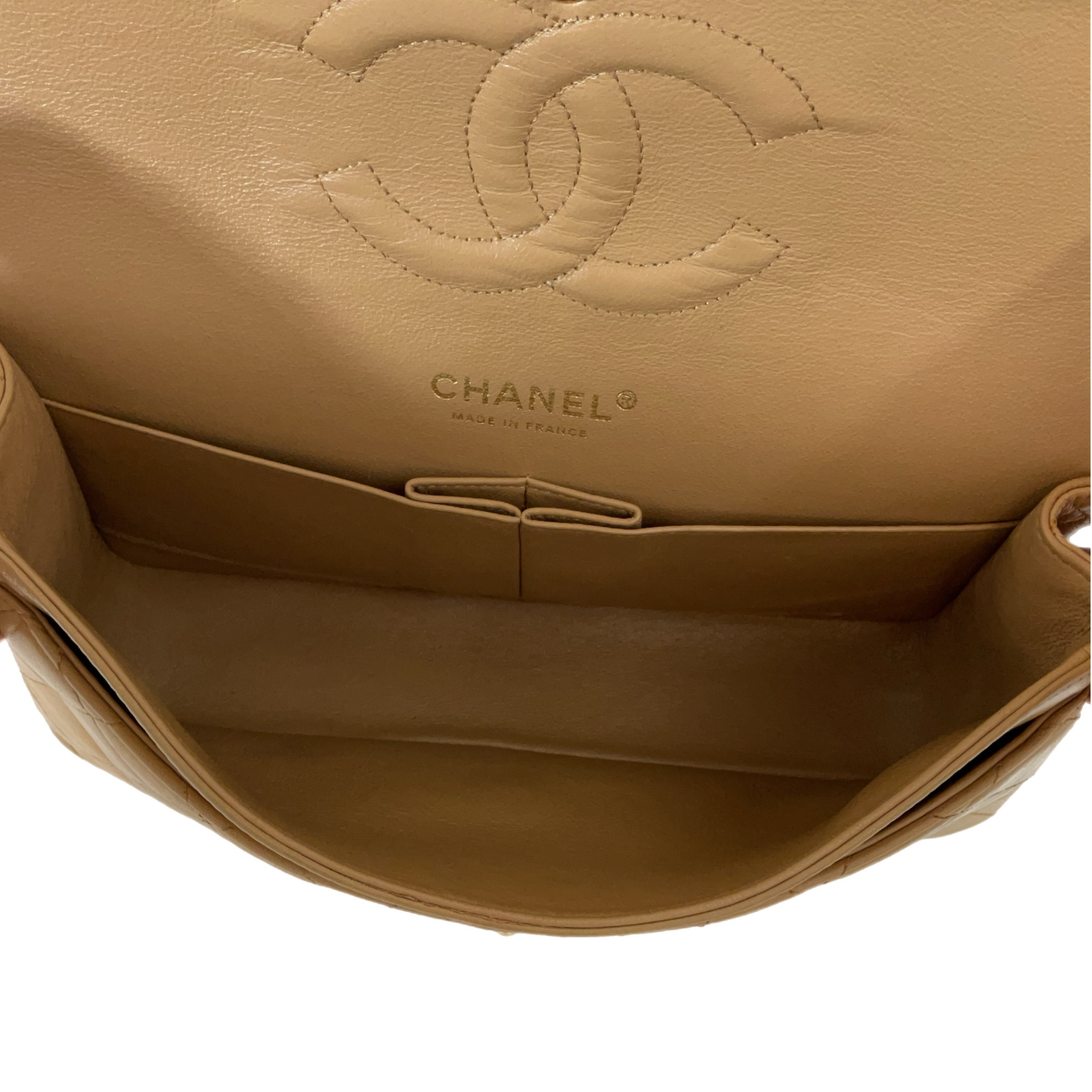 Fodera interna in pelle marrone, una tasca con zip, una tasca applicata, una doppia tasca applicata, uno scomparto per rossetto.