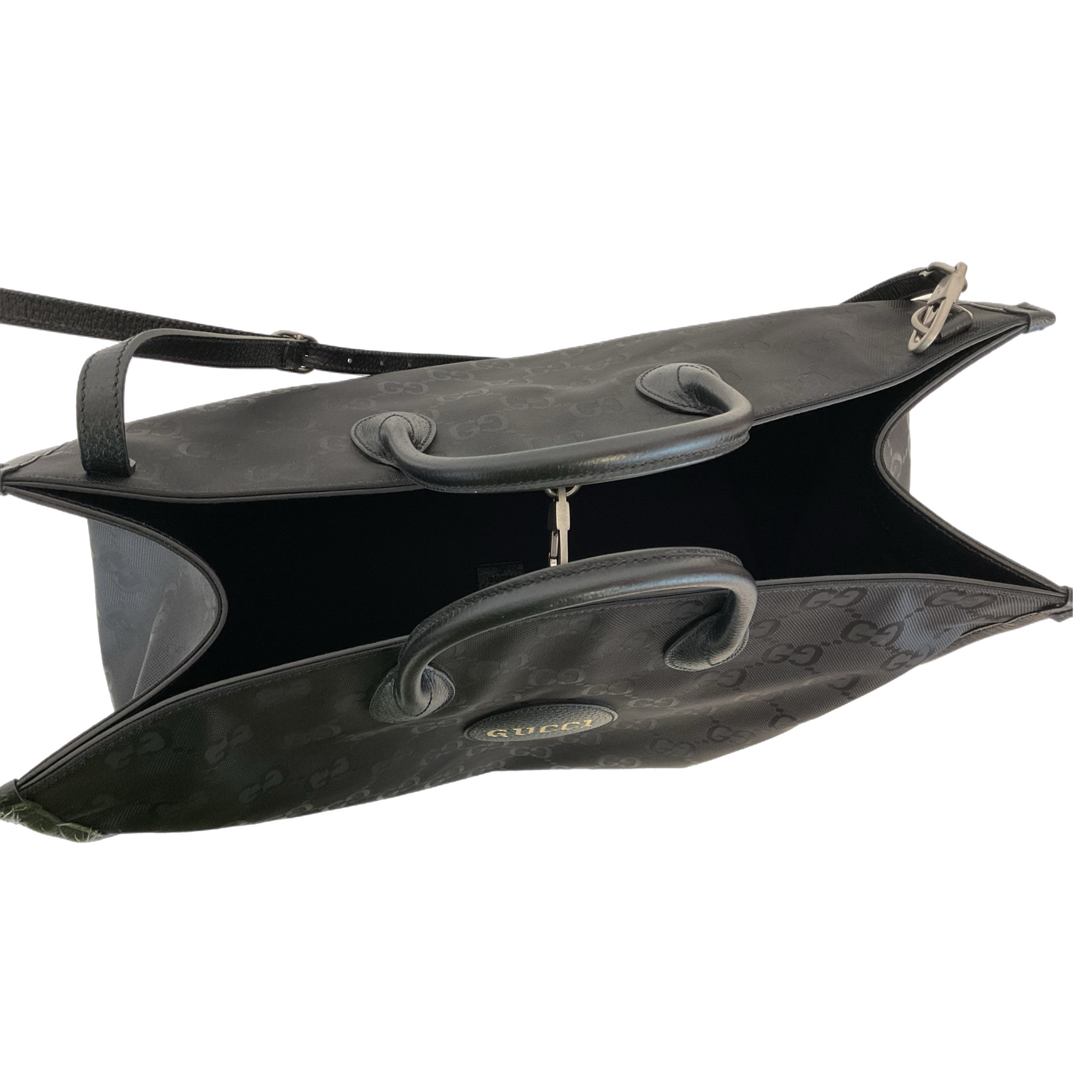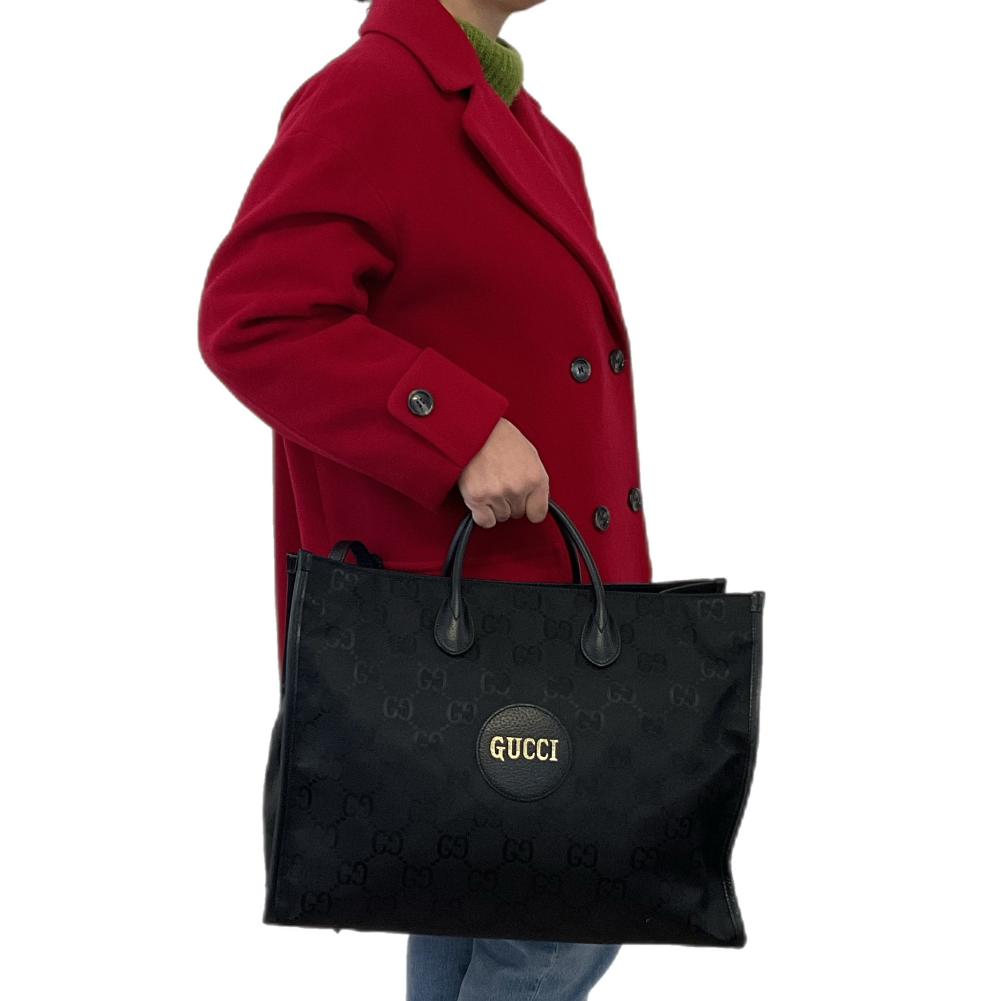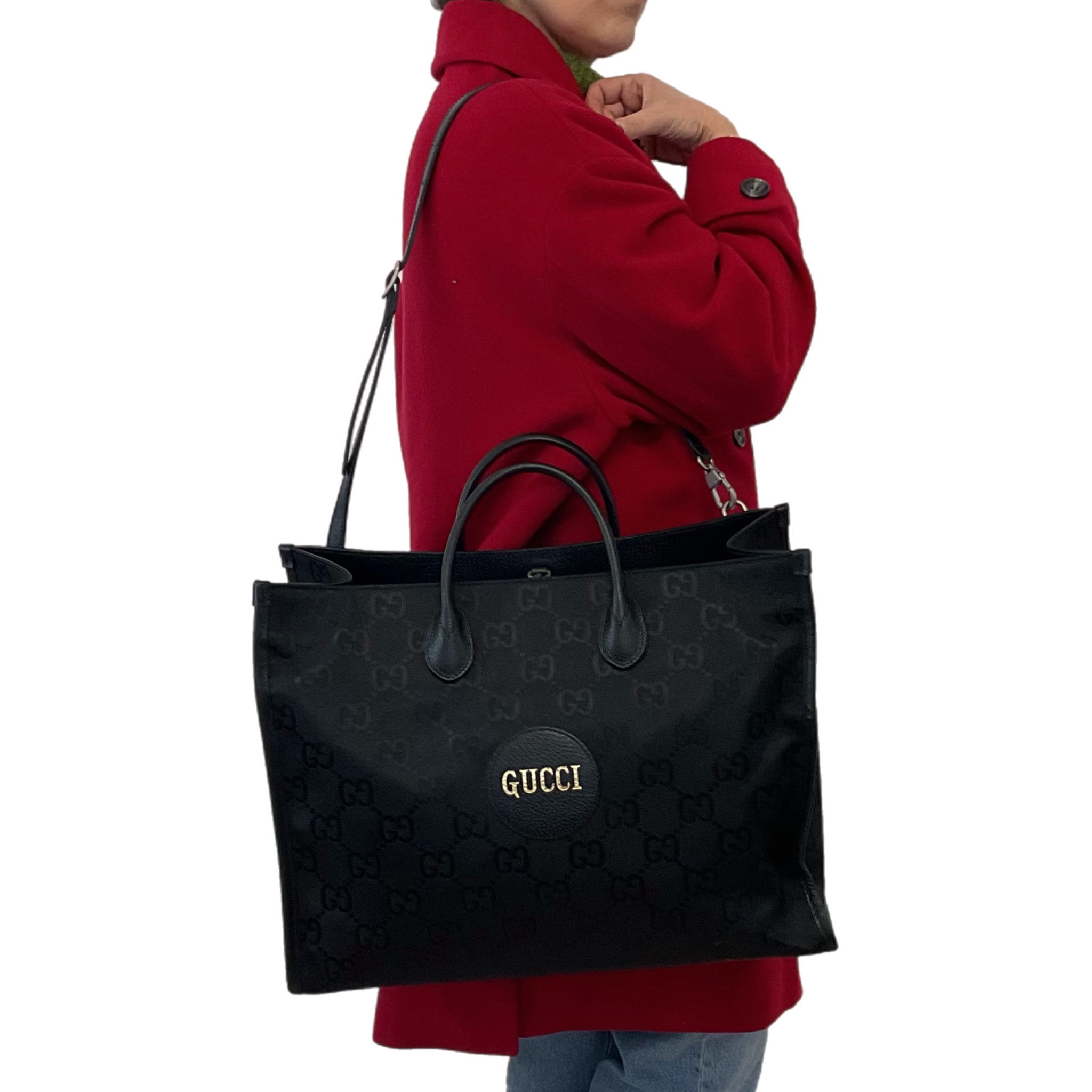 Gucci full set o off the grid 2 way tote bag del 2025, realizzata in tessuto nero con iconico motivo GG all-over tono su tono. Il design ampio e strutturato la rende ideale per l’uso quotidiano, perfetta come borsa da lavoro o da città. Il logo Gucci frontale in rilievo su inserto in pelle dona un tocco distintivo e raffinato. Dotata di doppi manici superiori e tracolla regolabile garantisce massima versatilità e comfort, dotata di 2 cerniere interne e un grande scomparto con chiusura a moschettone.