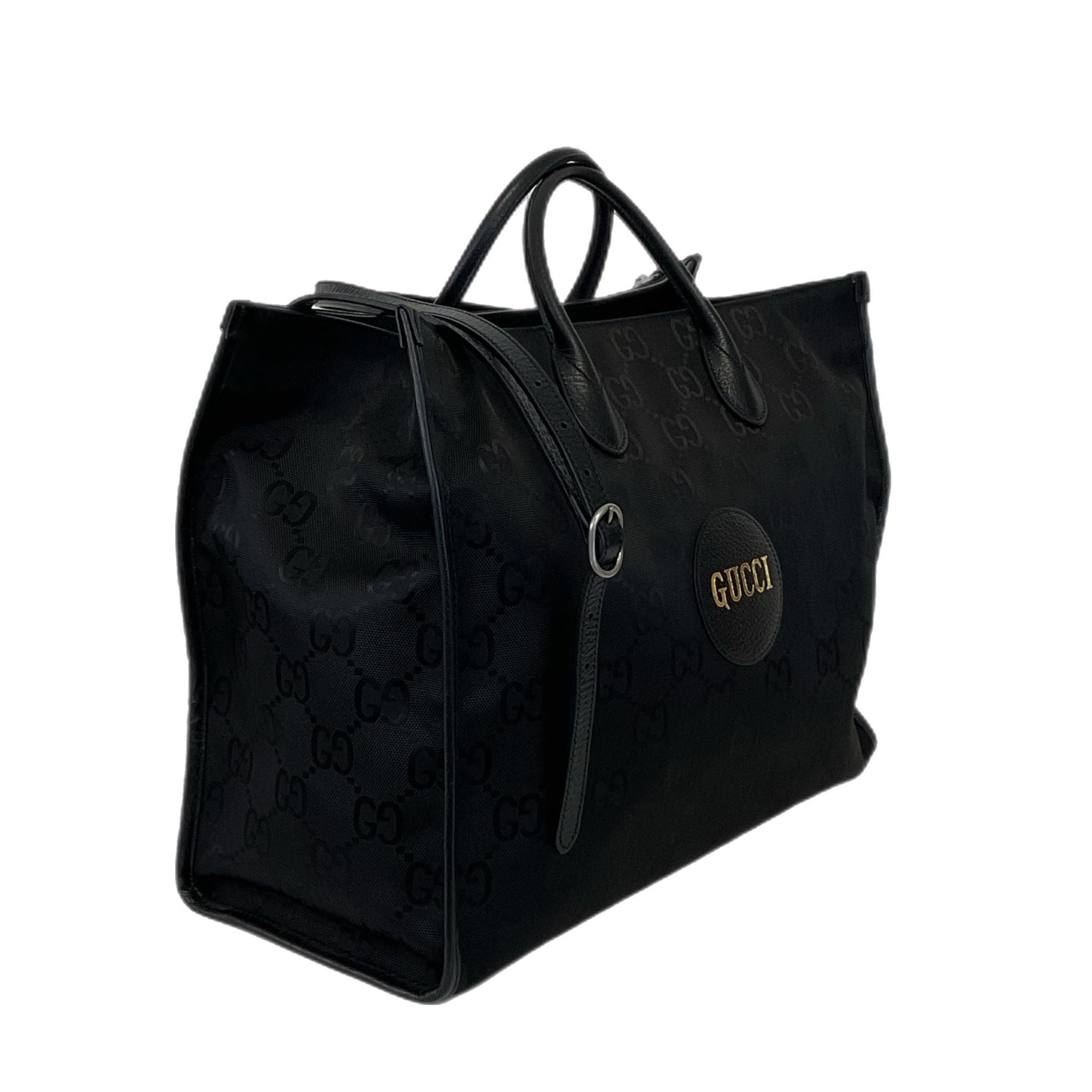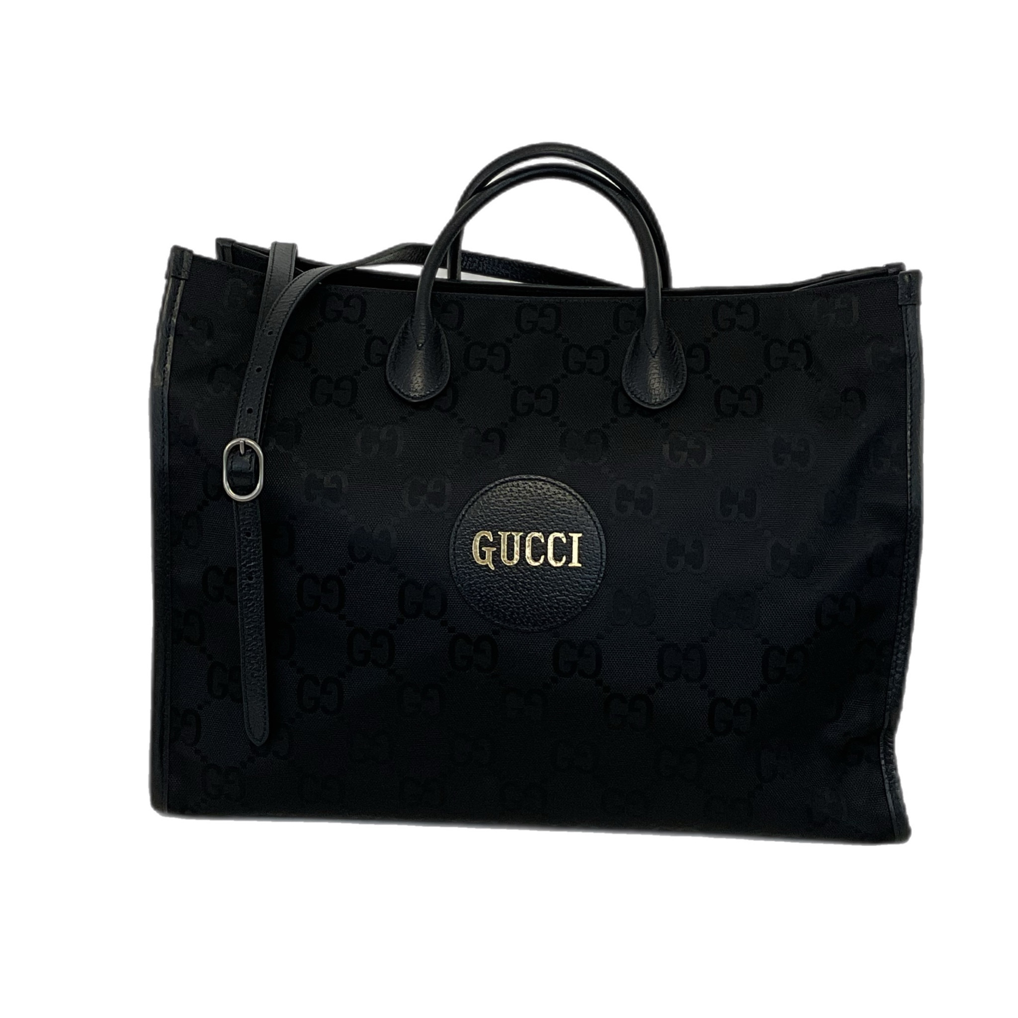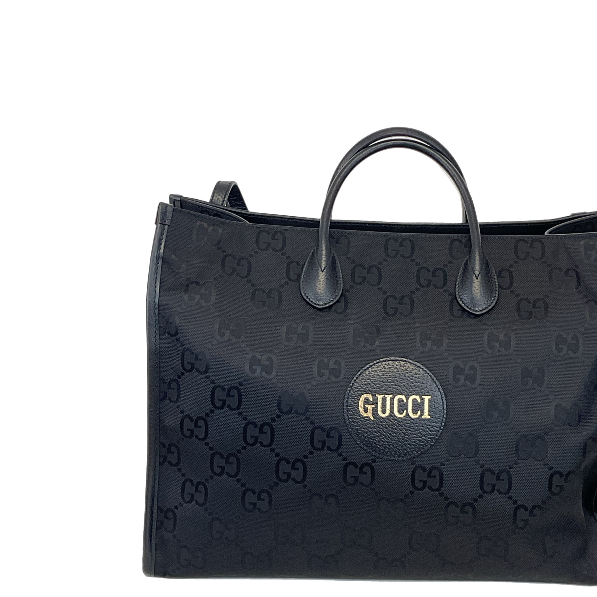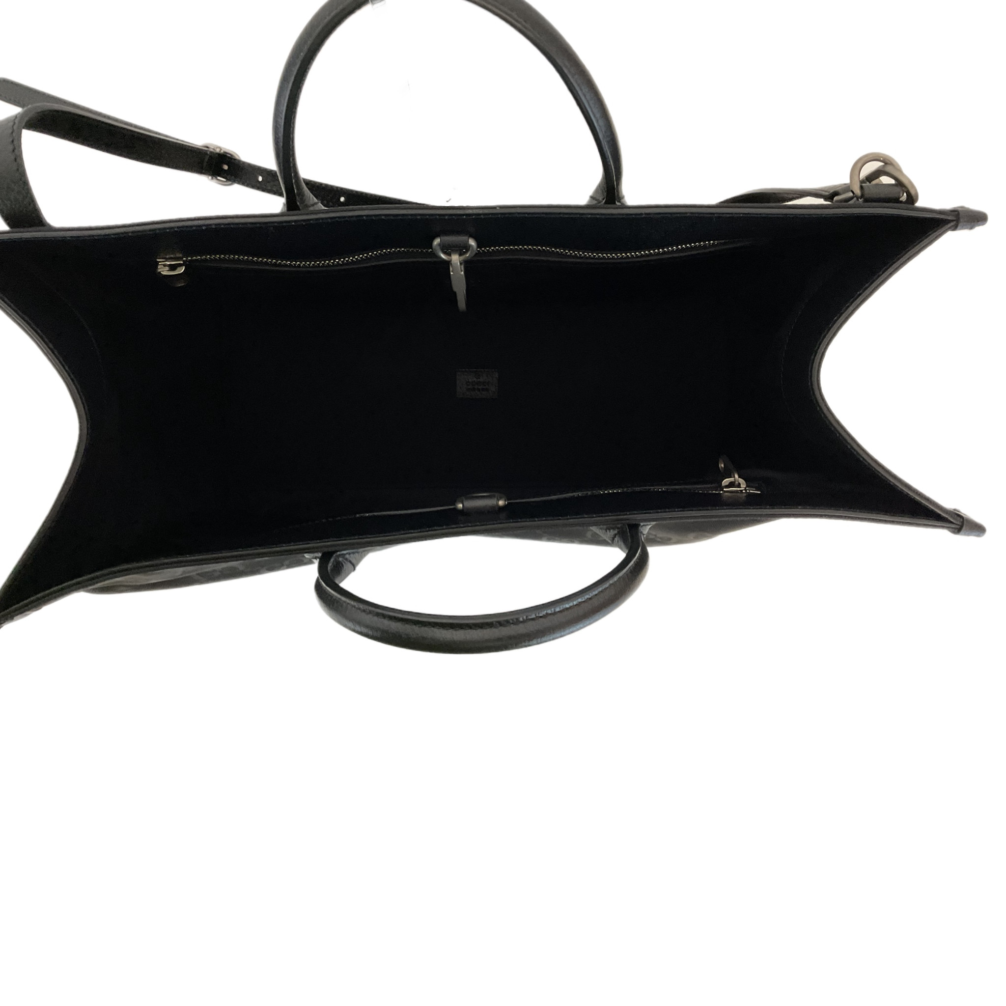 Gucci full set o off the grid 2 way tote bag del 2025, realizzata in tessuto nero con iconico motivo GG all-over tono su tono. Il design ampio e strutturato la rende ideale per l’uso quotidiano, perfetta come borsa da lavoro o da città. Il logo Gucci frontale in rilievo su inserto in pelle dona un tocco distintivo e raffinato. Dotata di doppi manici superiori e tracolla regolabile garantisce massima versatilità e comfort, dotata di 2 cerniere interne e un grande scomparto con chiusura a moschettone.