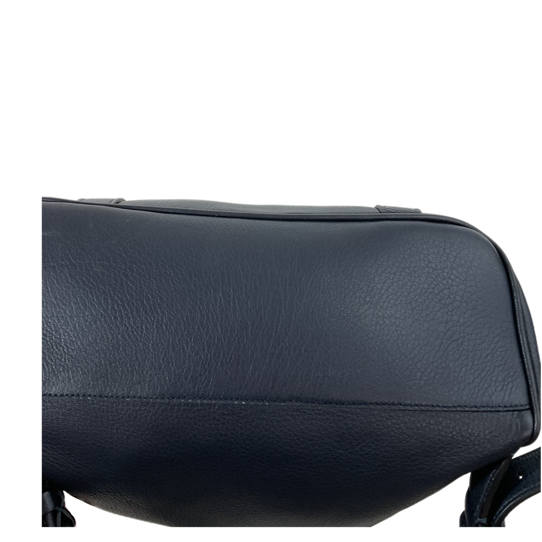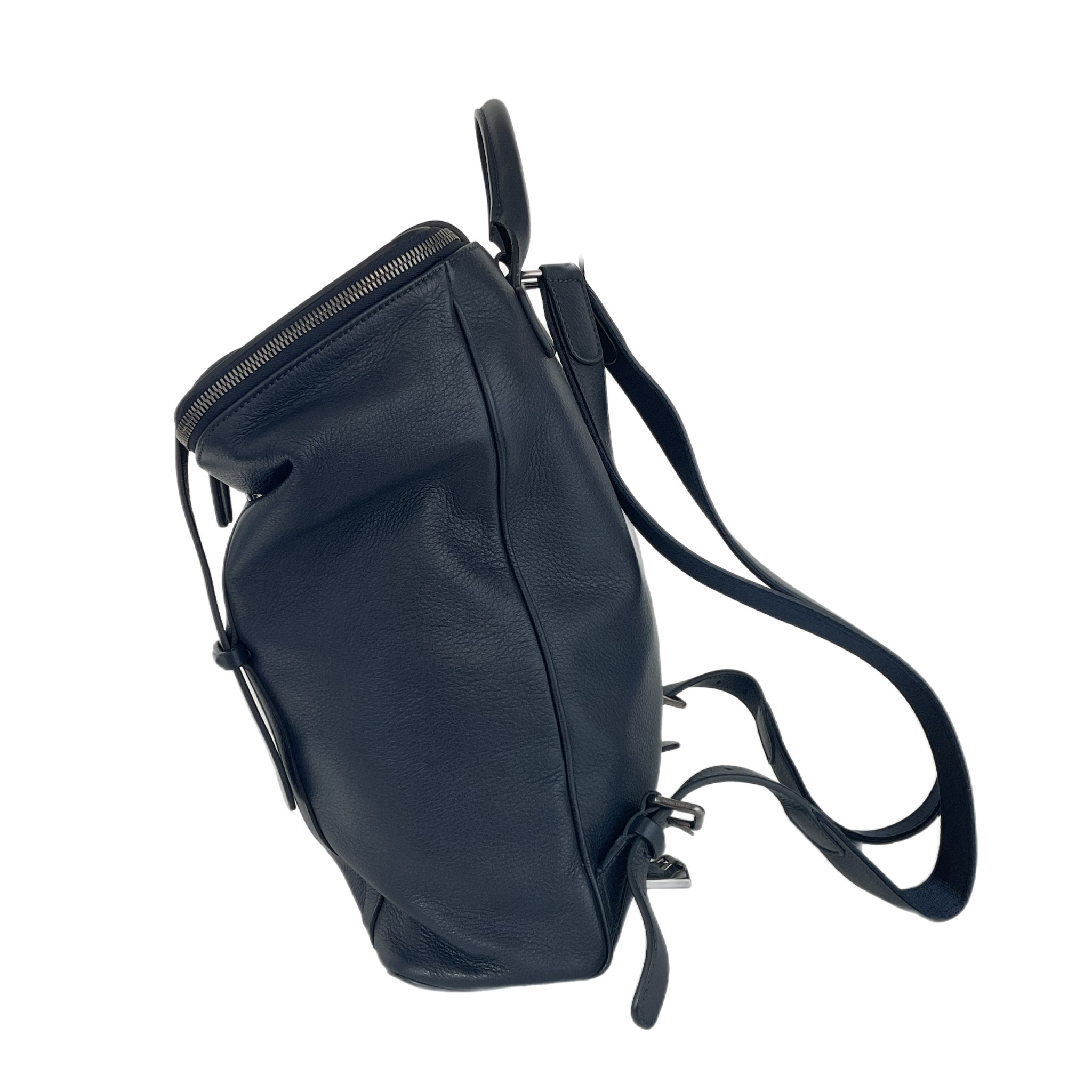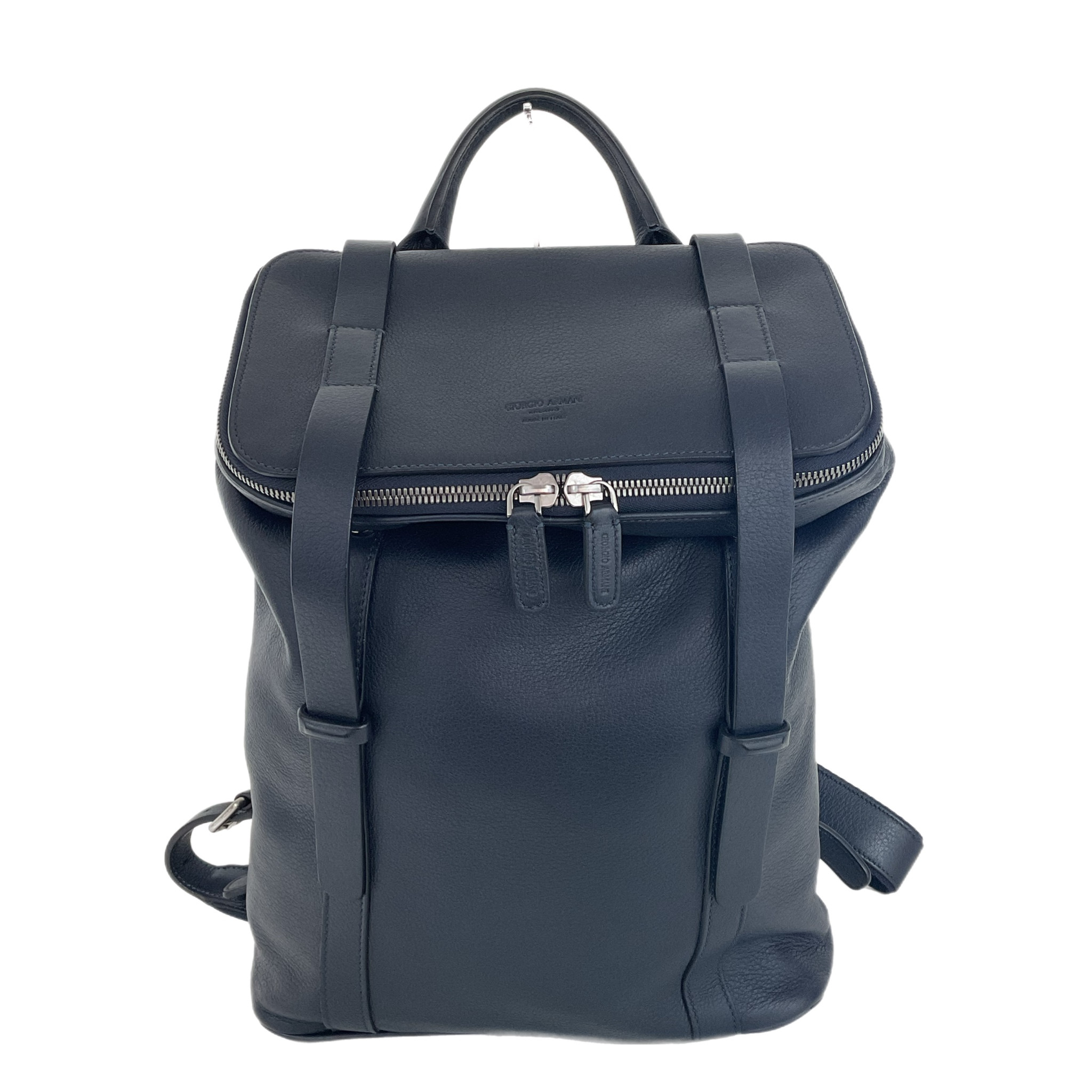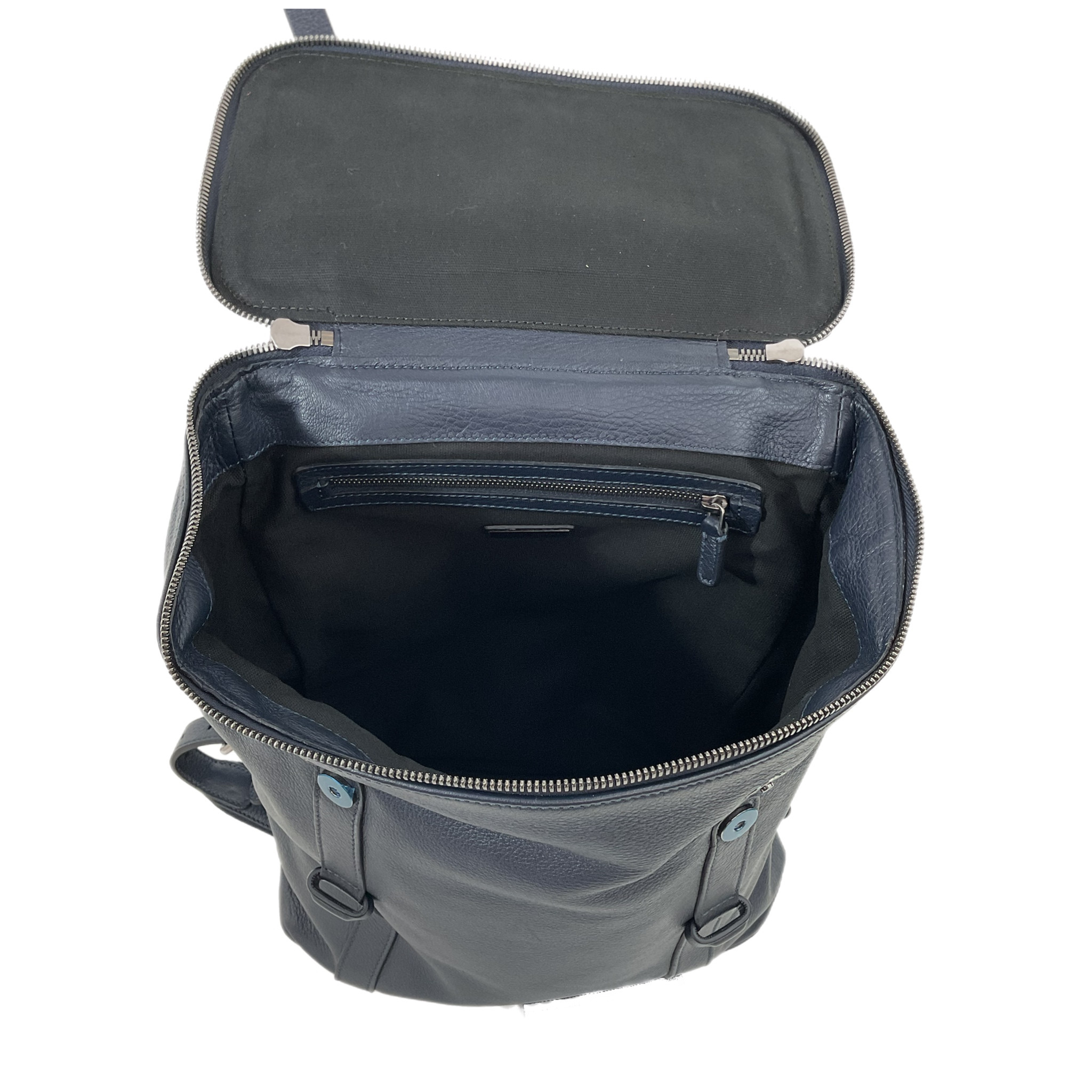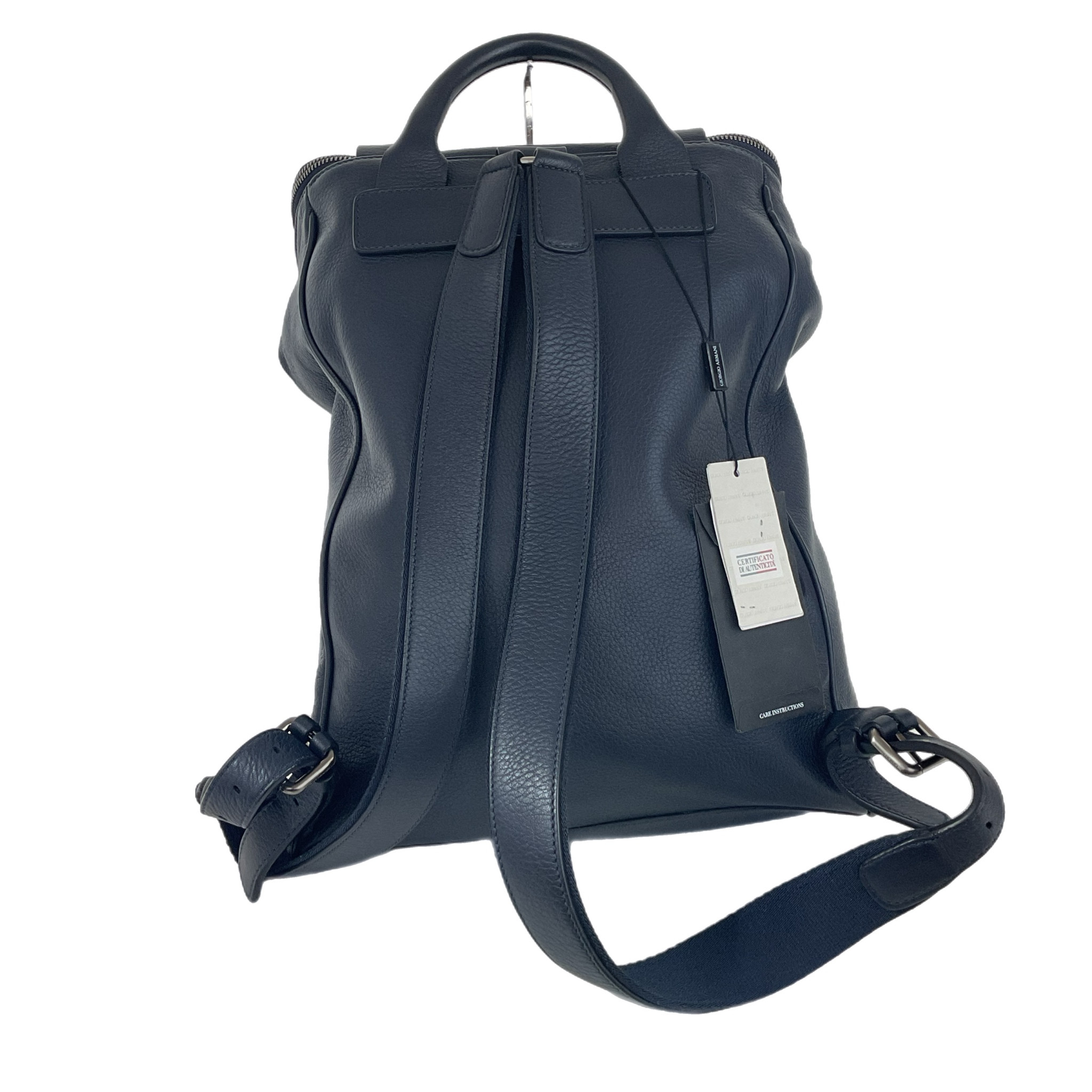 Zaino Giorgio Armani in pelle di colore blu regolabile, molto capiente e con una tasca con zip interna, la chiusura è con fibbie in pelle e grande cerniera a zip.