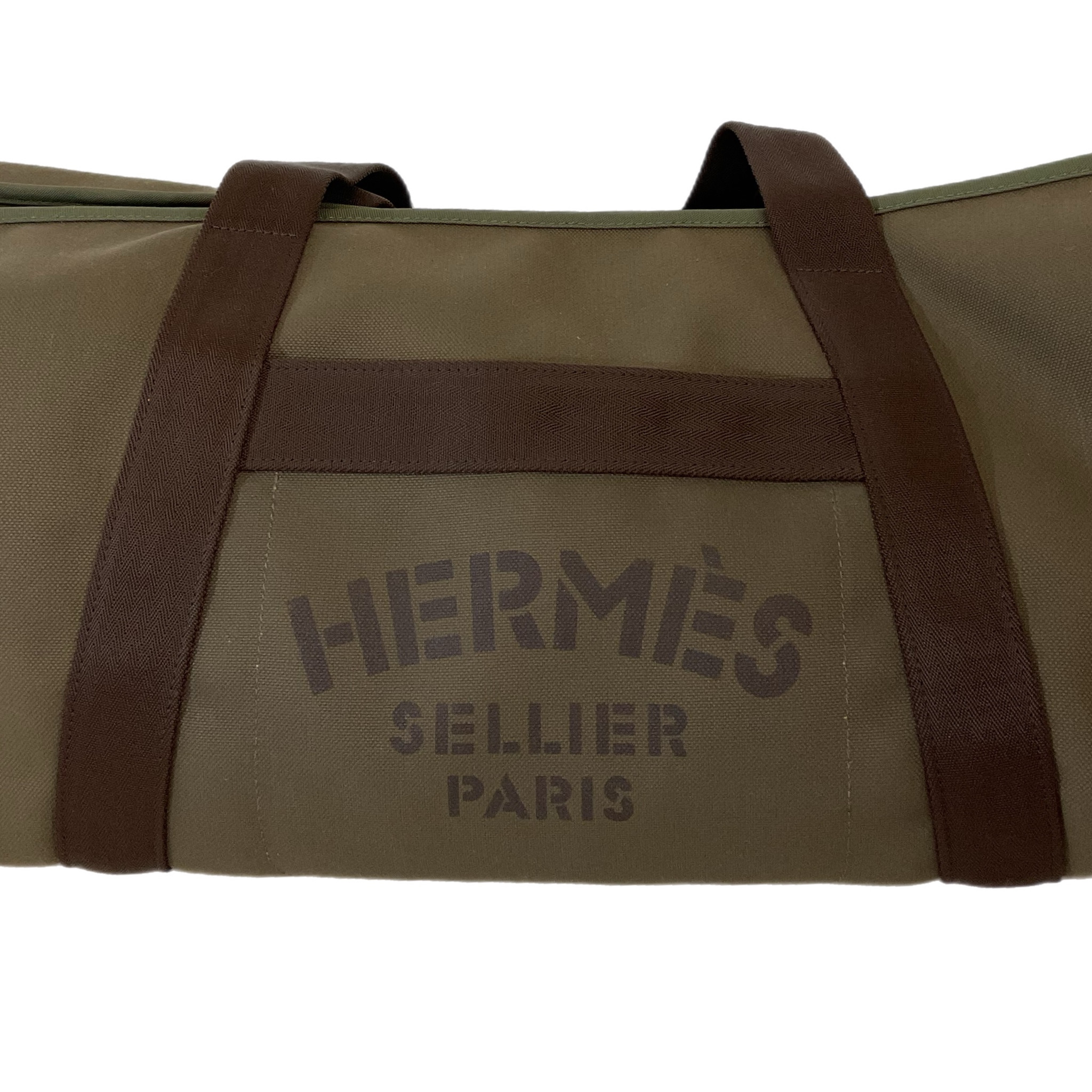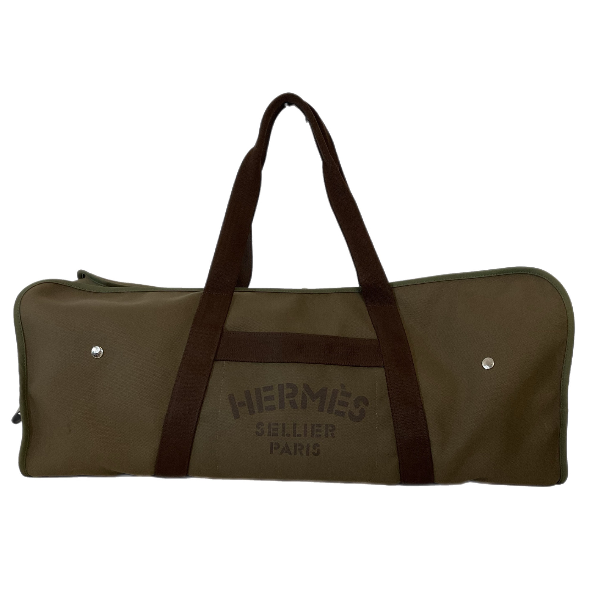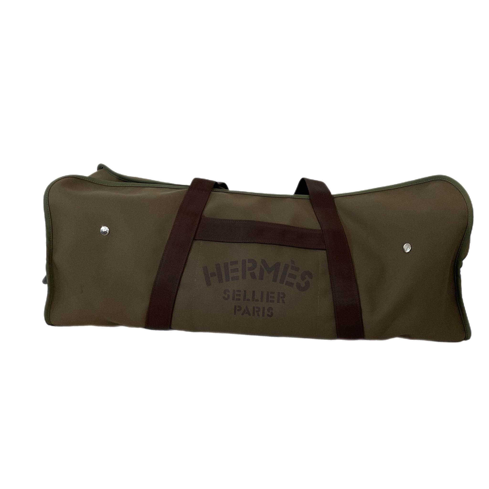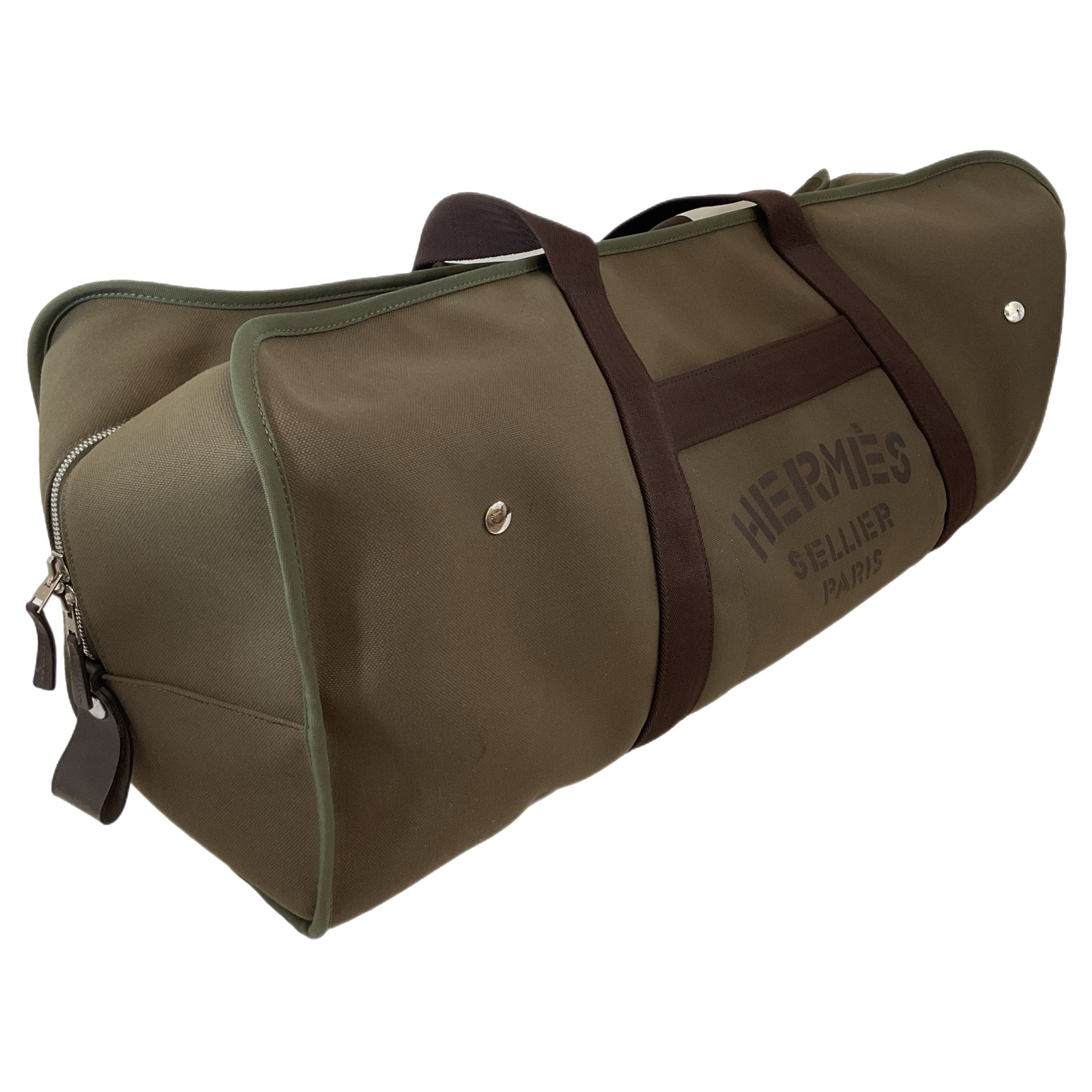 Borsone Hermès da viaggio in tela marrone e verde oliva. Scomparto interno, con bottoni, interamente estraibile, piccola dust bag in tela di colore arancione, pratico e capiente questo borsone ha tanti scomparti da riempire comodamente per i tuoi viaggi.