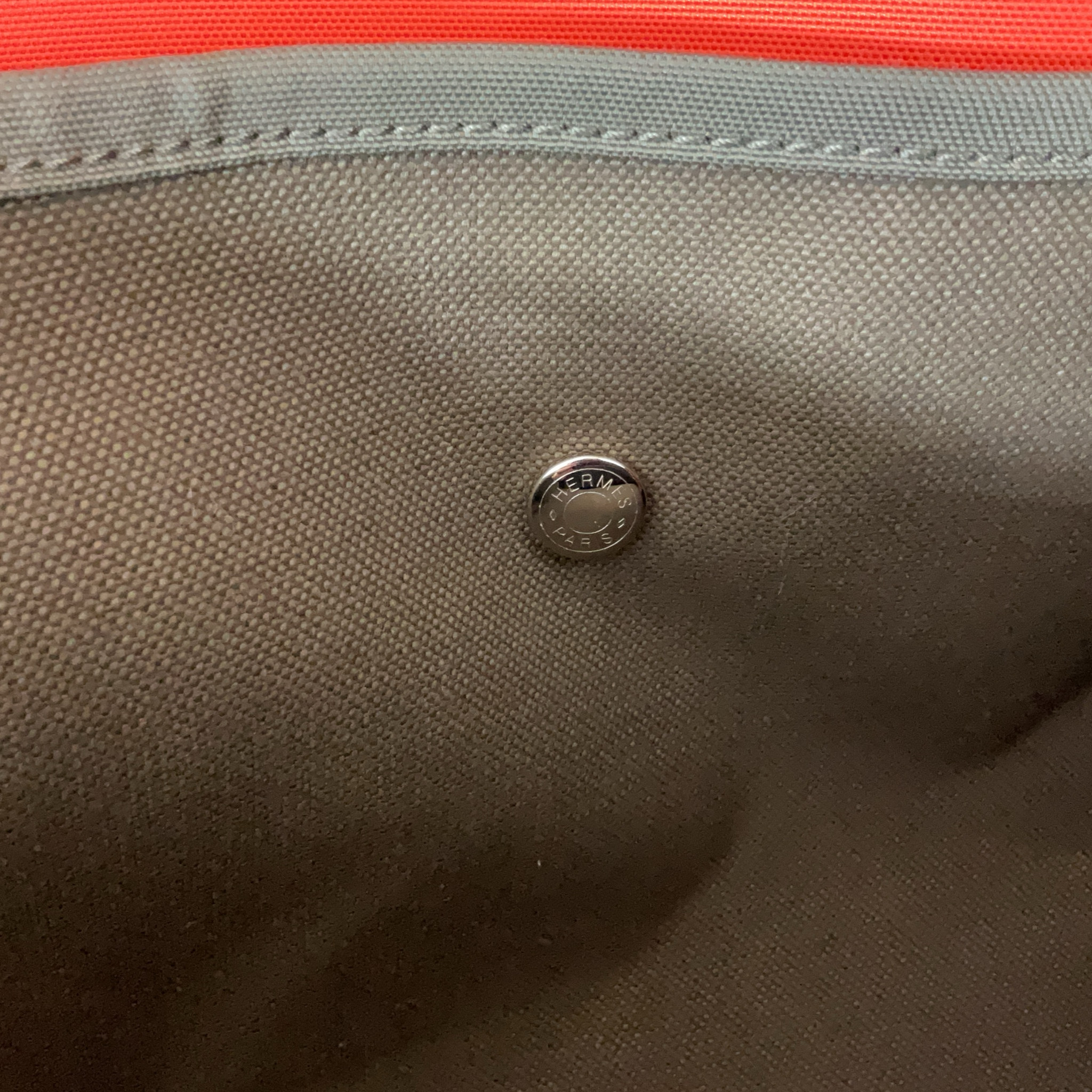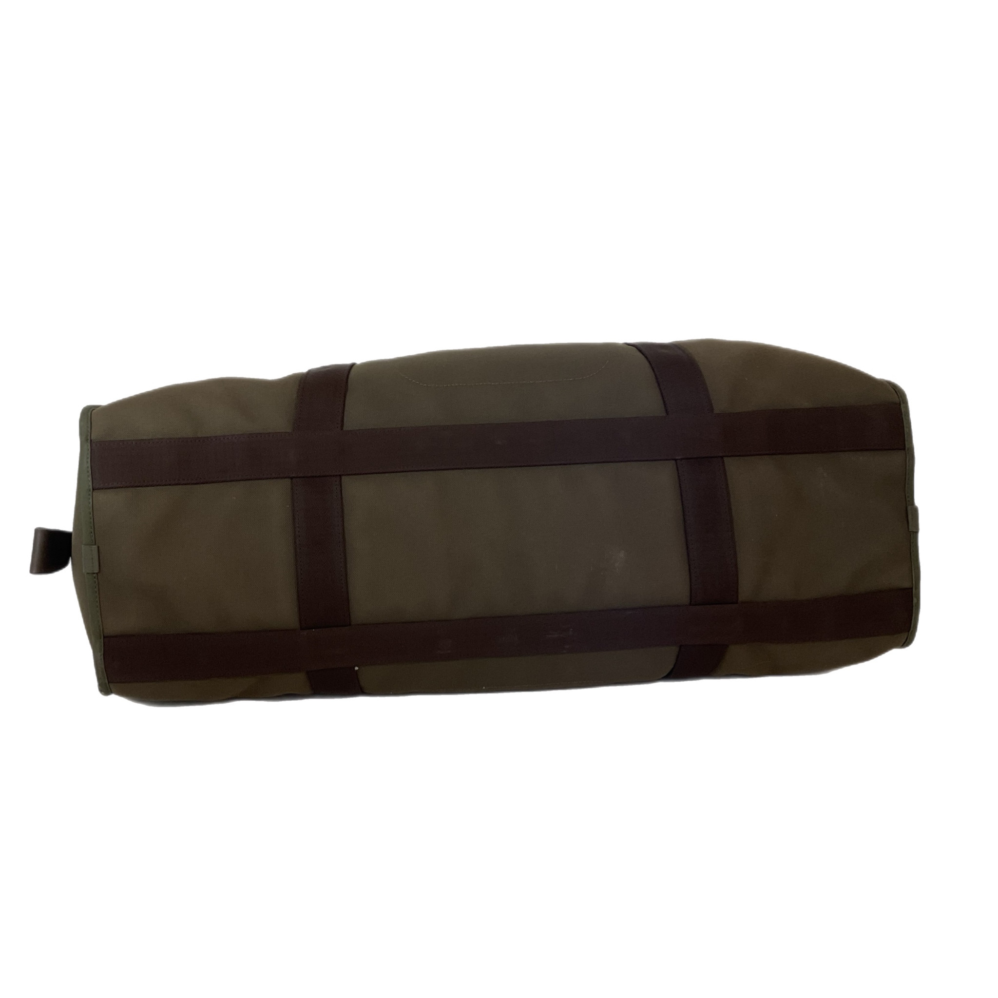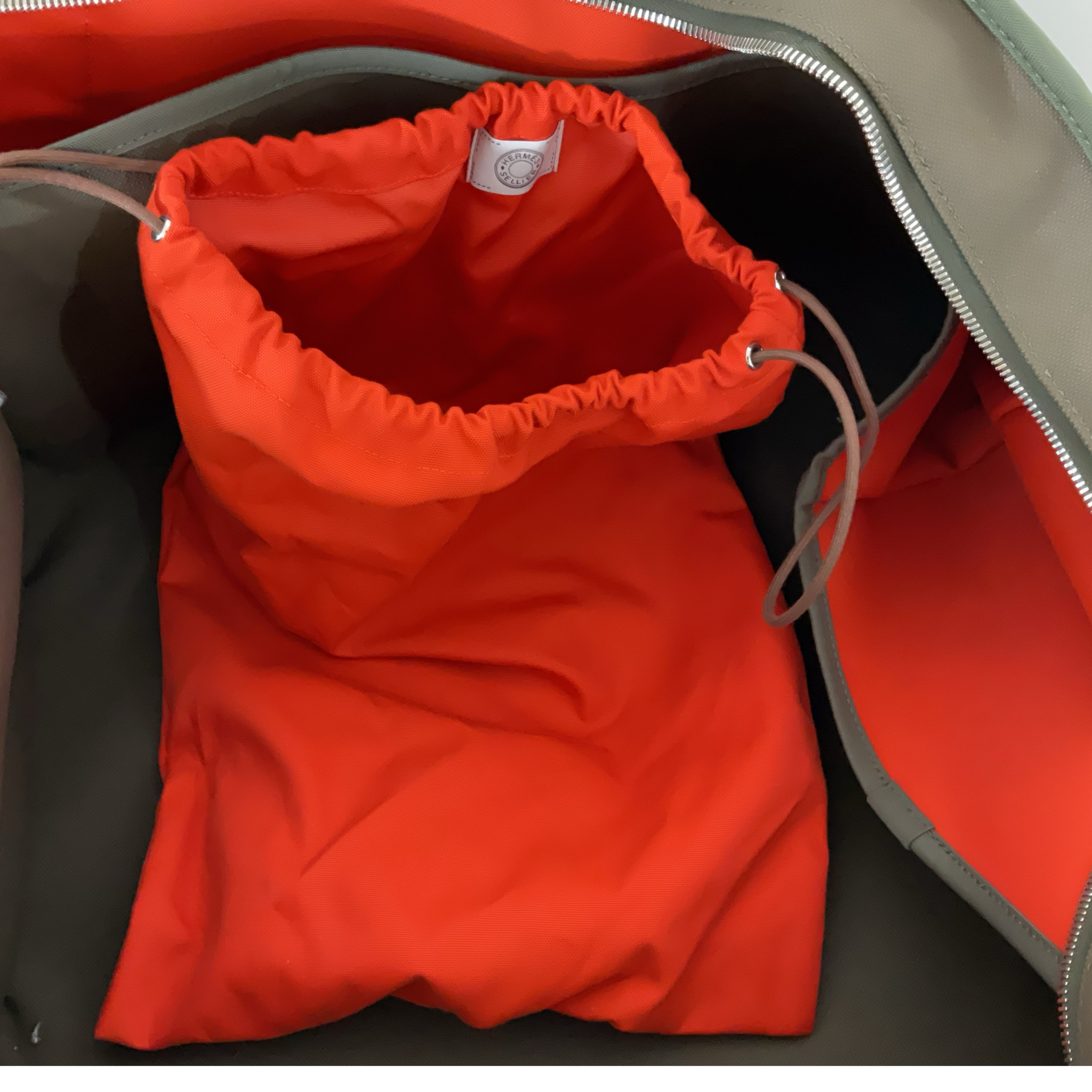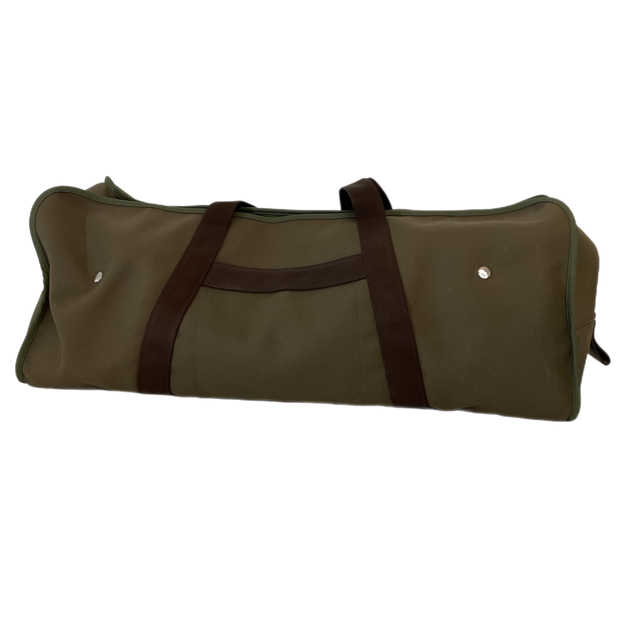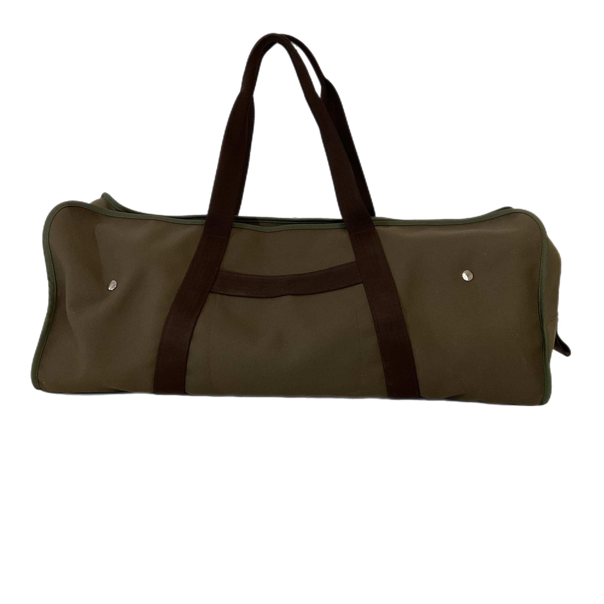 Borsone Hermès da viaggio in tela marrone e verde oliva. Scomparto interno, con bottoni, interamente estraibile, piccola dust bag in tela di colore arancione, pratico e capiente questo borsone ha tanti scomparti da riempire comodamente per i tuoi viaggi.