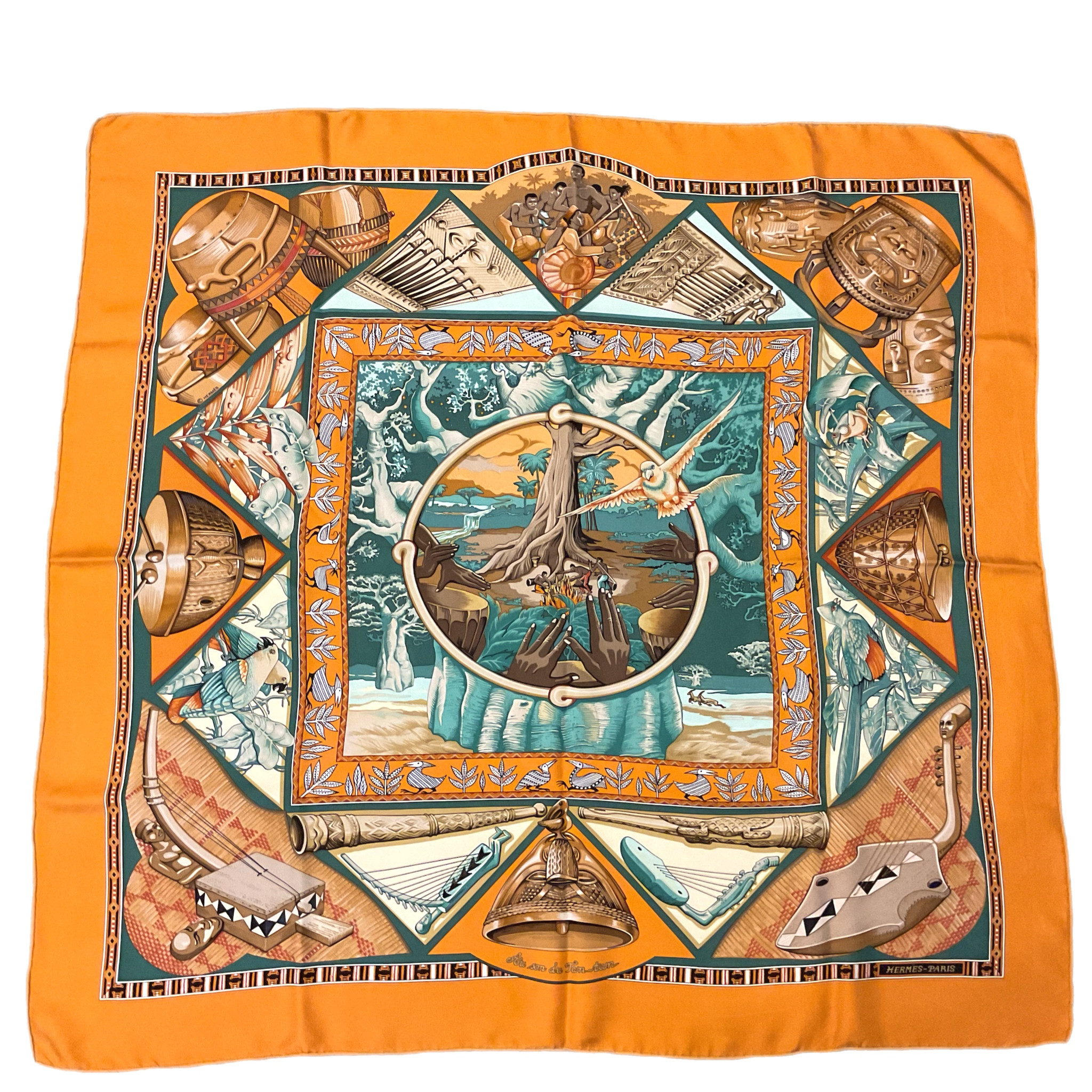 Carrè 90 Hermès "Au du TAM-TAM" anno 1997 disegnato da Toutsy Bourthoumieux, rappresenta strumenti musicali tradizionali e scene naturali con un tema musicale.