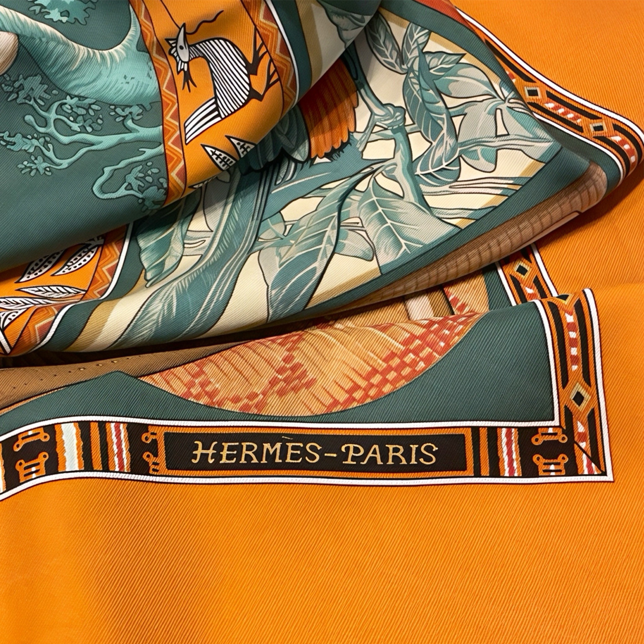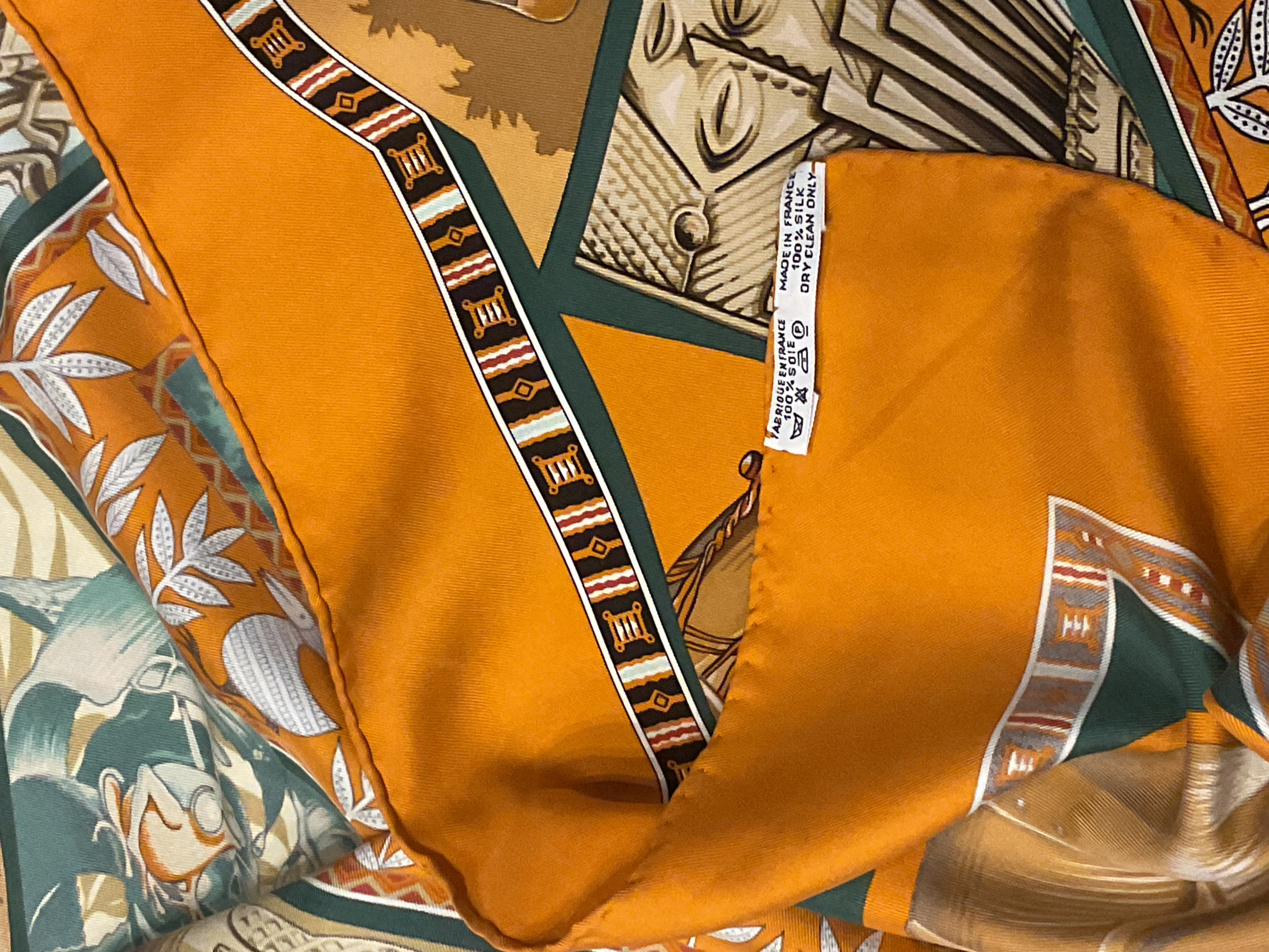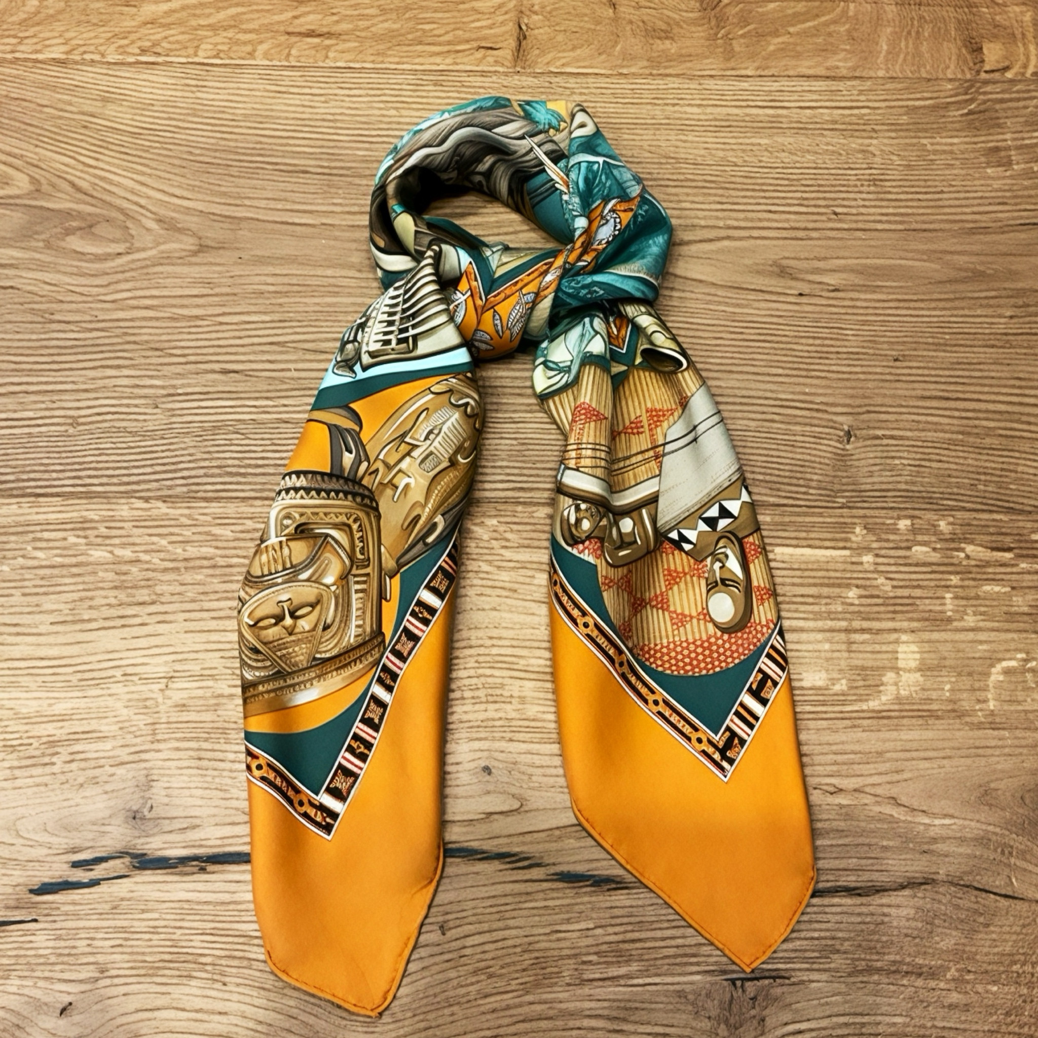 Questo particolare modello, con la sua vivace combinazione di colori arancione e verde acqua e le illustrazioni dettagliate di strumenti musicali, è particolarmente ricercato dai collezionisti di foulard vintage Hermès e dagli amanti della musica che apprezzano l'eleganza senza tempo di questi accessori iconici.