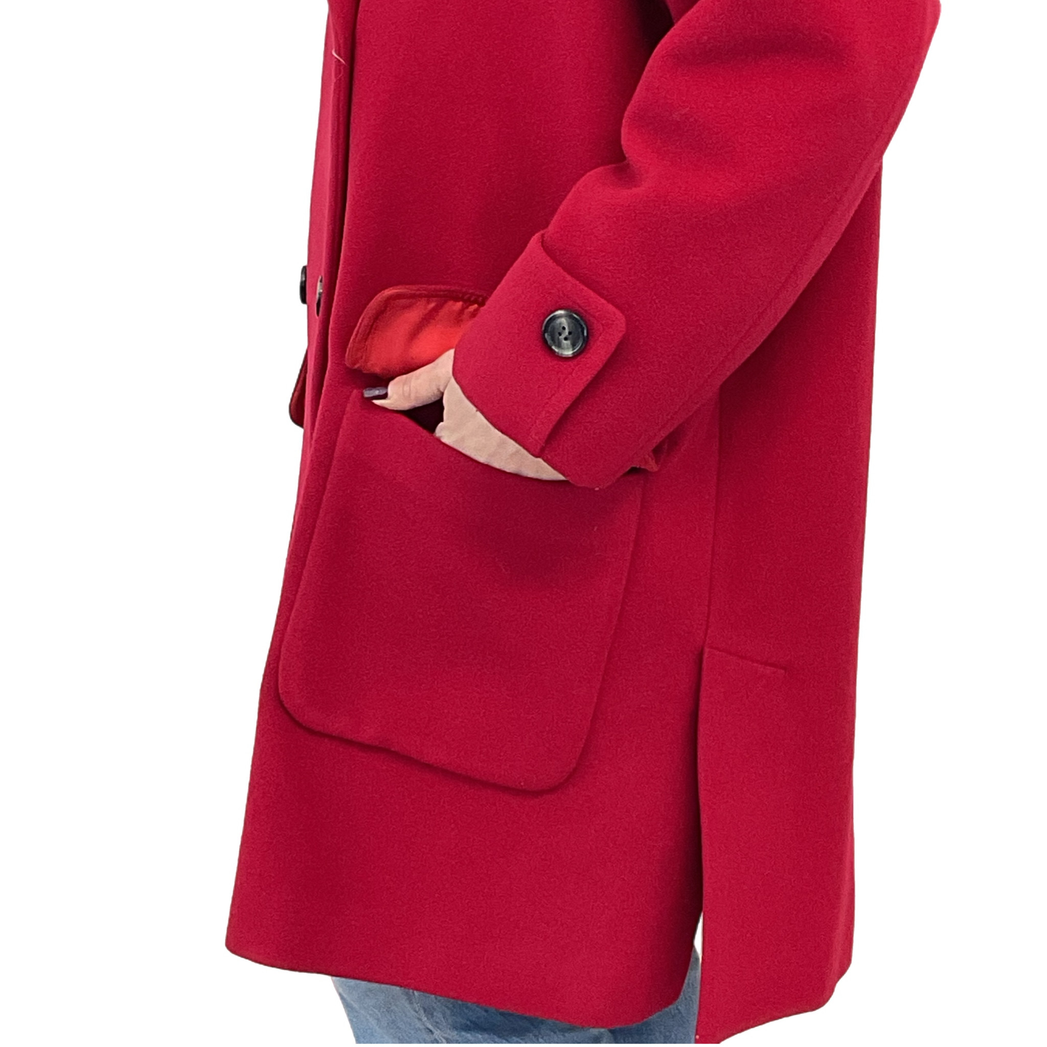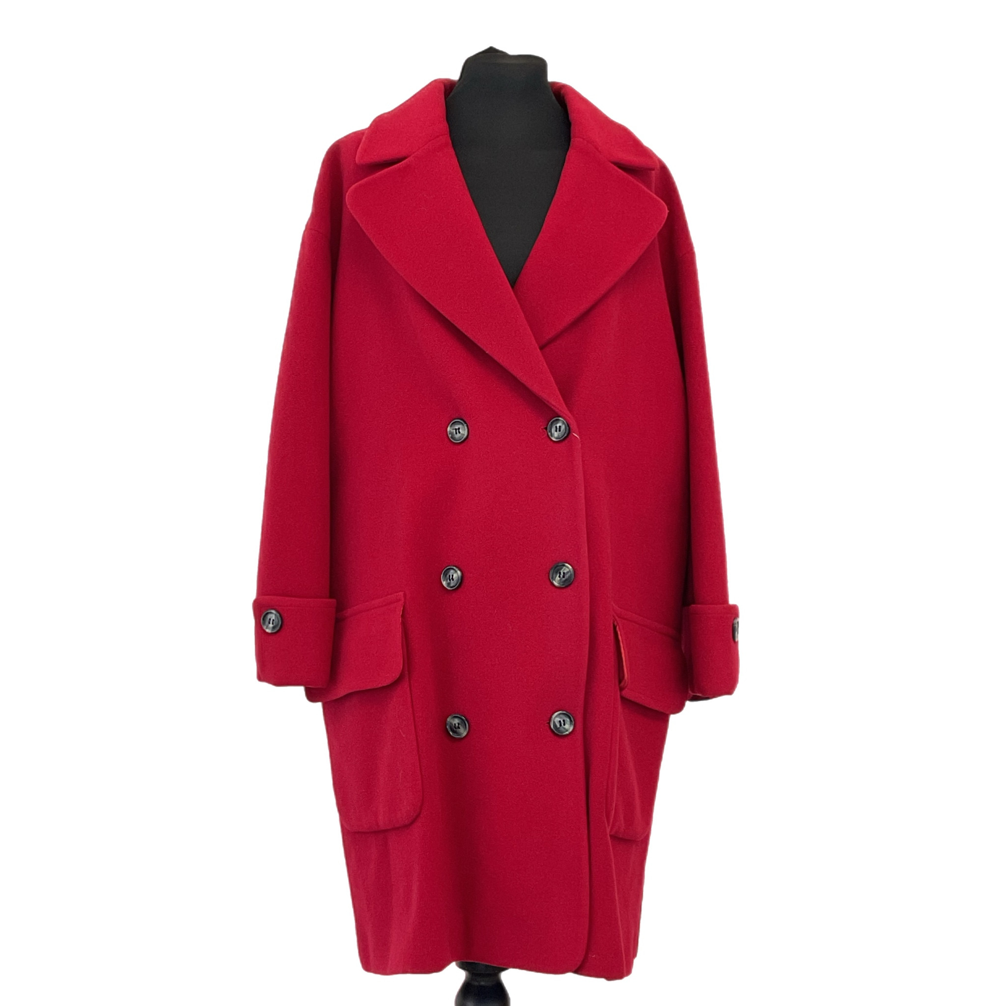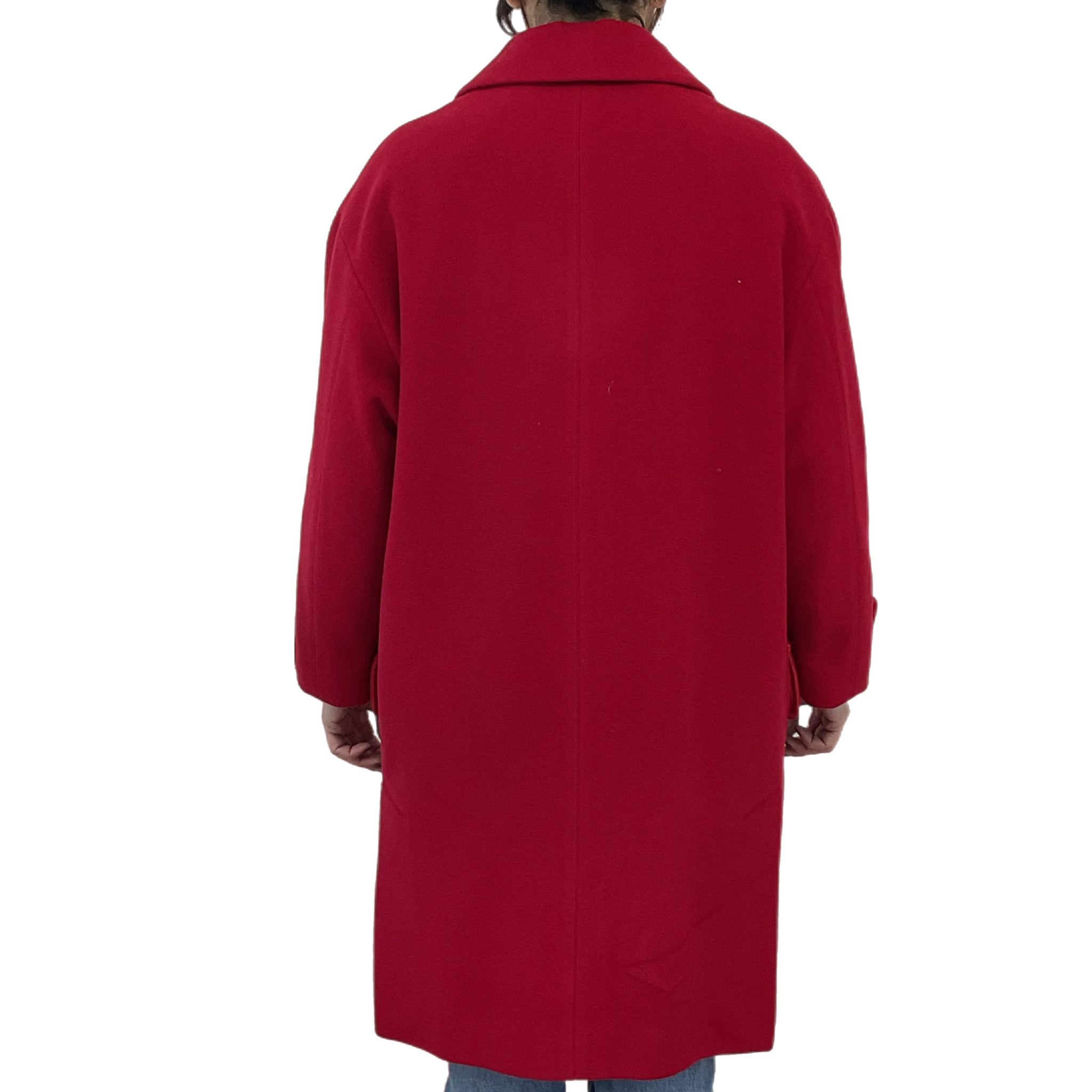 Cappotto "Oliver" Valentino anni '90 con doppiopetto dal design intramontabile, realizzato in lana,con il suo colore rosso intenso dona carattere e raffinatezza, rendendolo un capo ideale per la stagione fredda. Il collo ampio a rever, la chiusura con bottoni a contrasto e le tasche applicate aggiungono un tocco sartoriale ed elegante. La vestibilità morbida garantisce comfort e versatilità, taglia 48, perfetta sia per look casual che più formali.