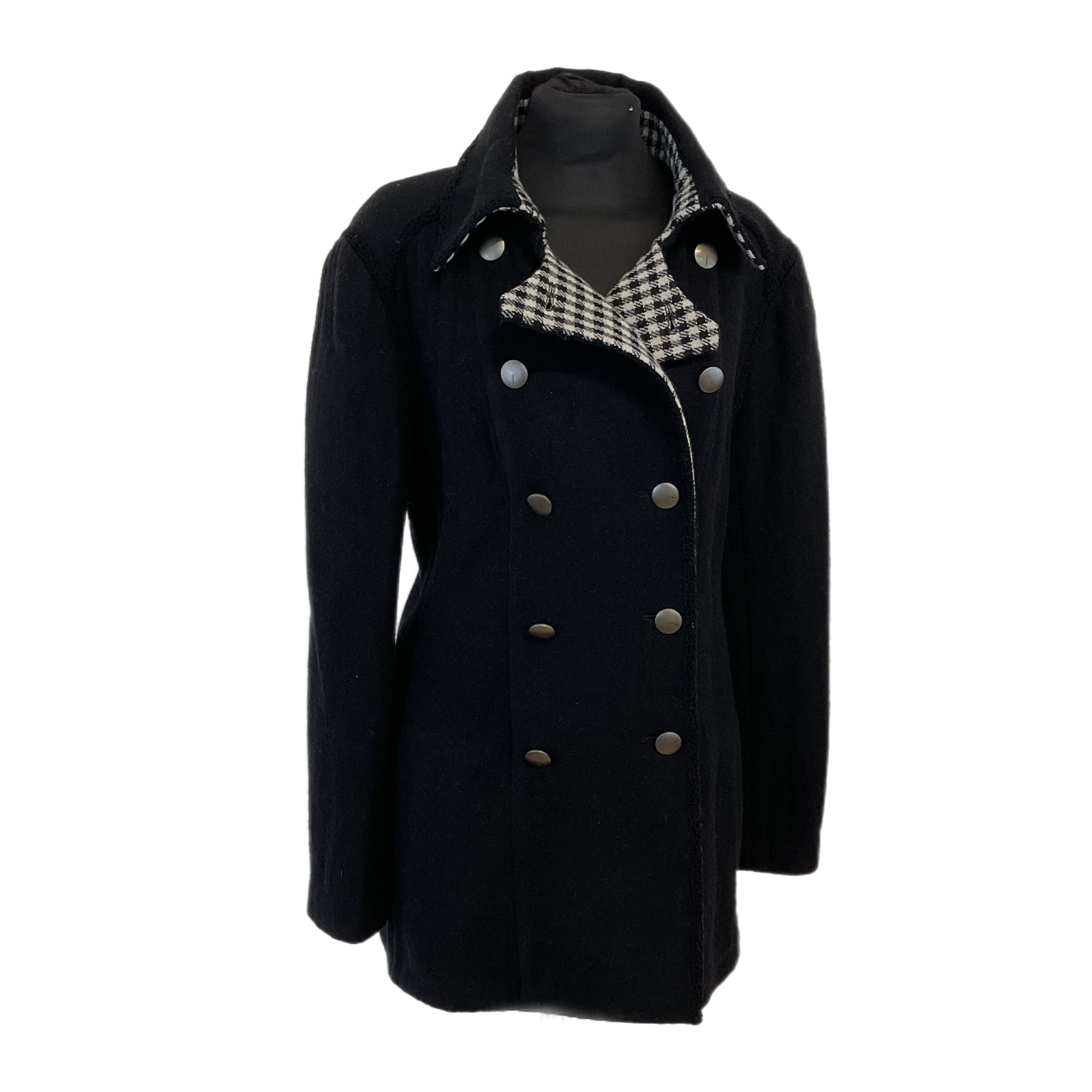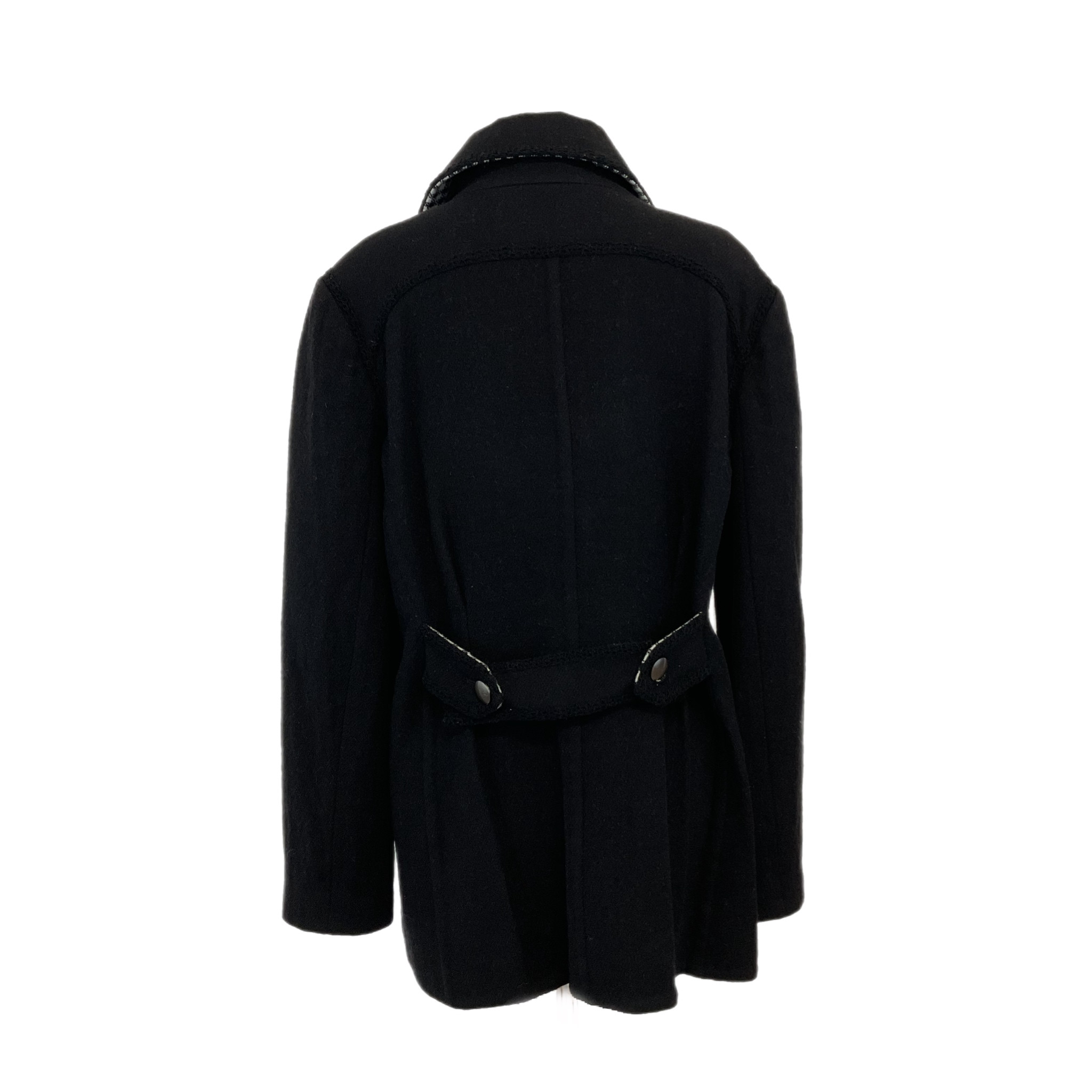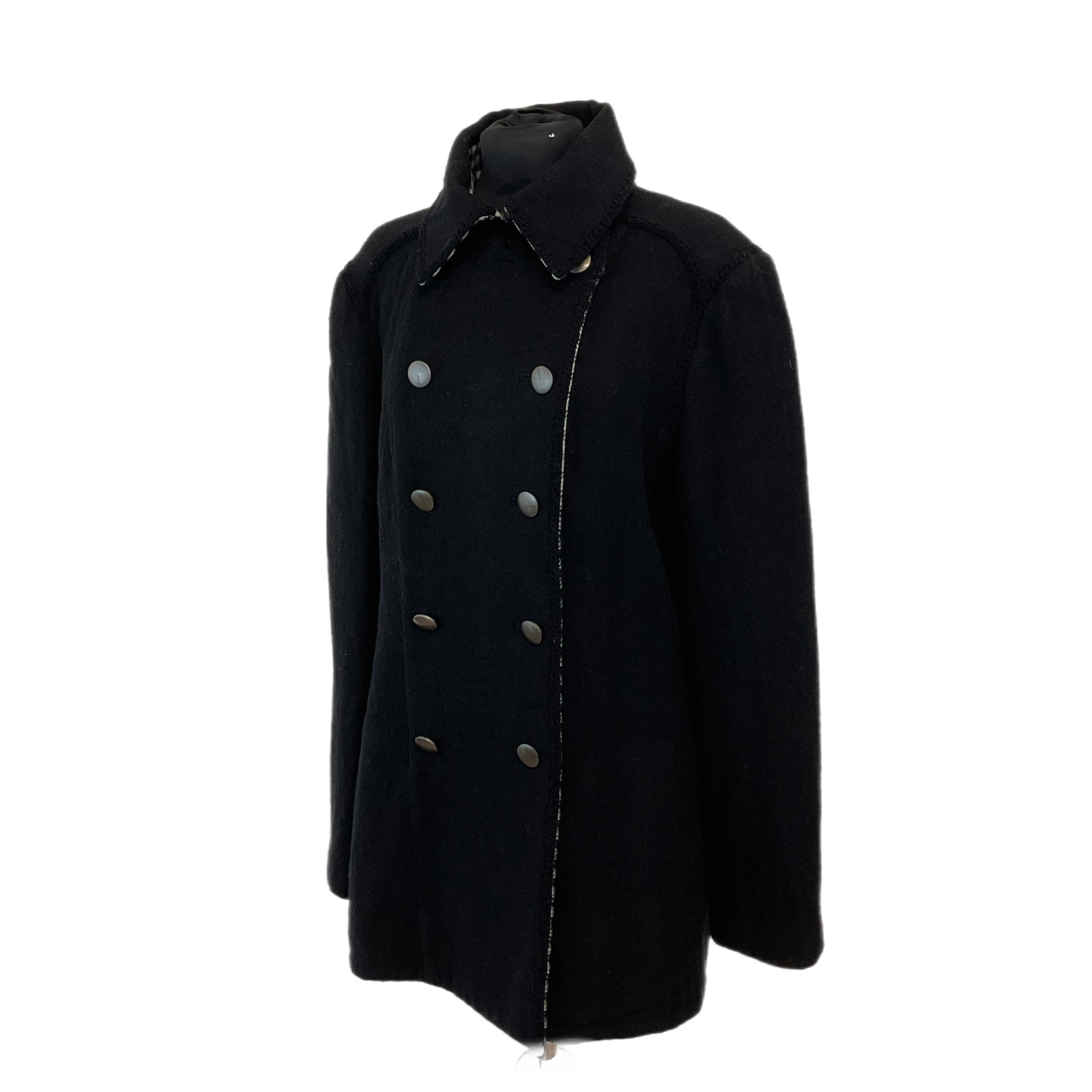 Cappotto Chanel in lana anni 2000, di colore nero con l'interno bianco e nero, doppiopetto con bottoni in metallo con logo Chanel.