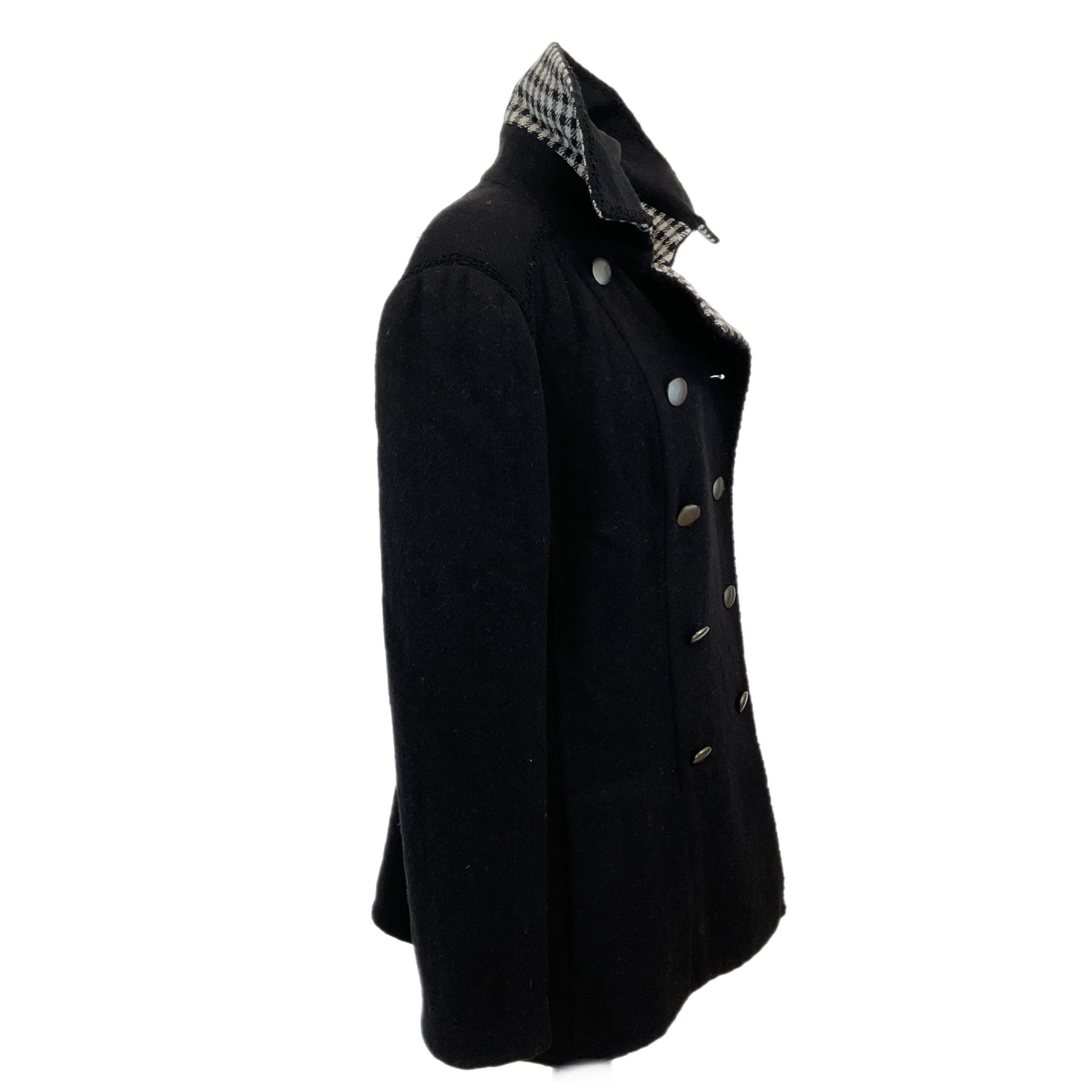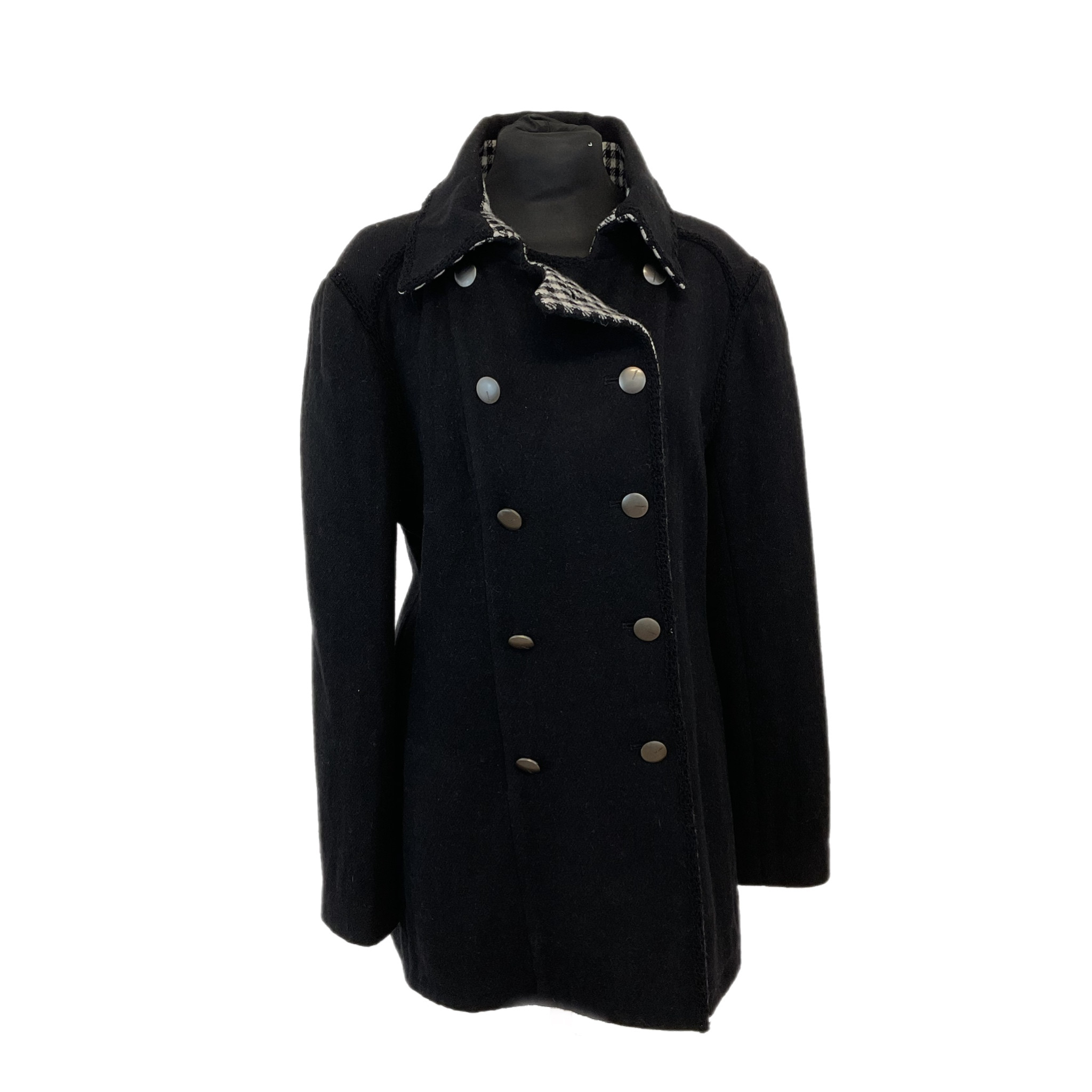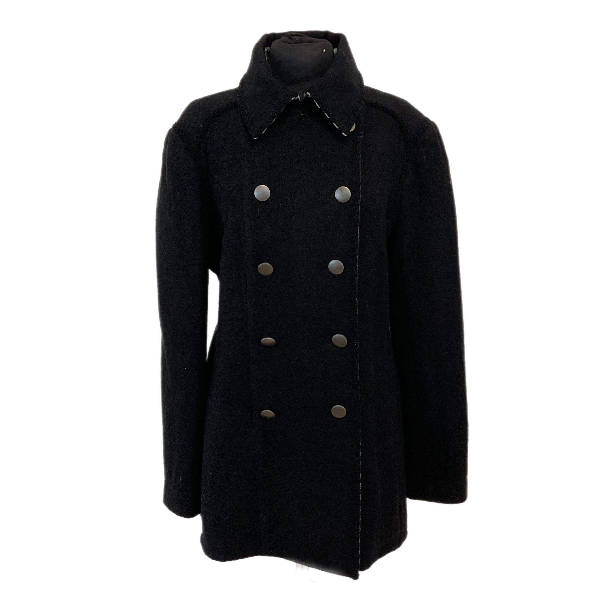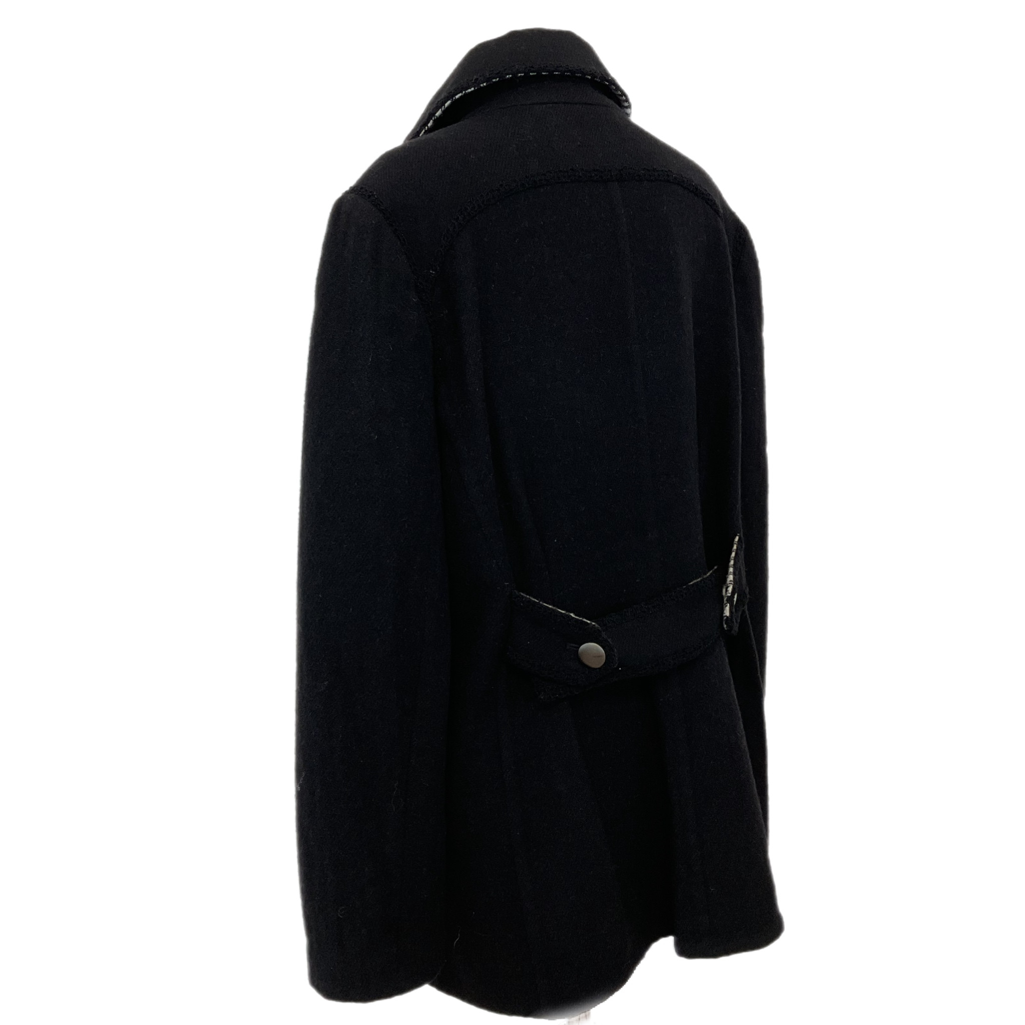 Cappotto Chanel in lana anni 2000, di colore nero con l'interno bianco e nero, doppiopetto con bottoni in metallo con logo Chanel.