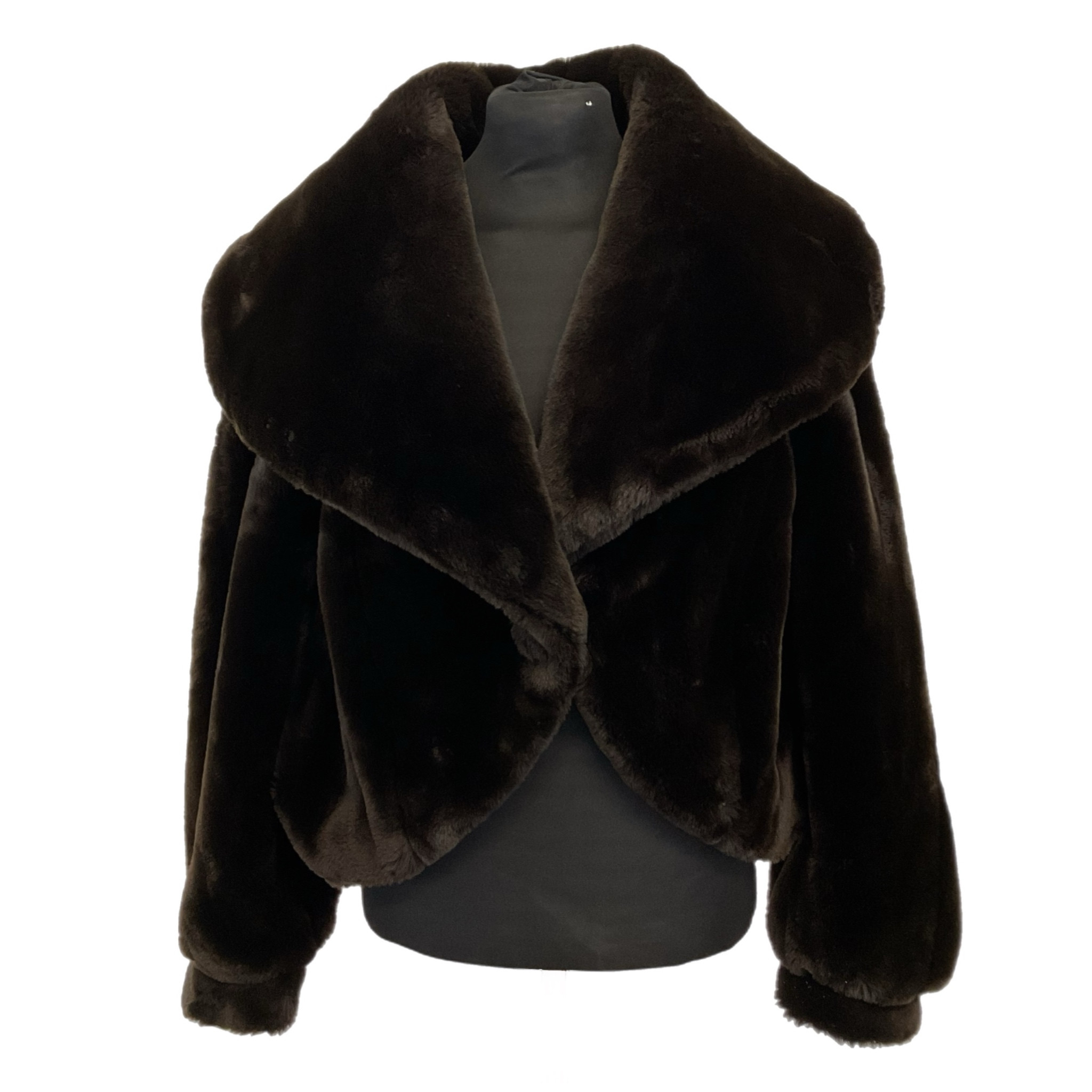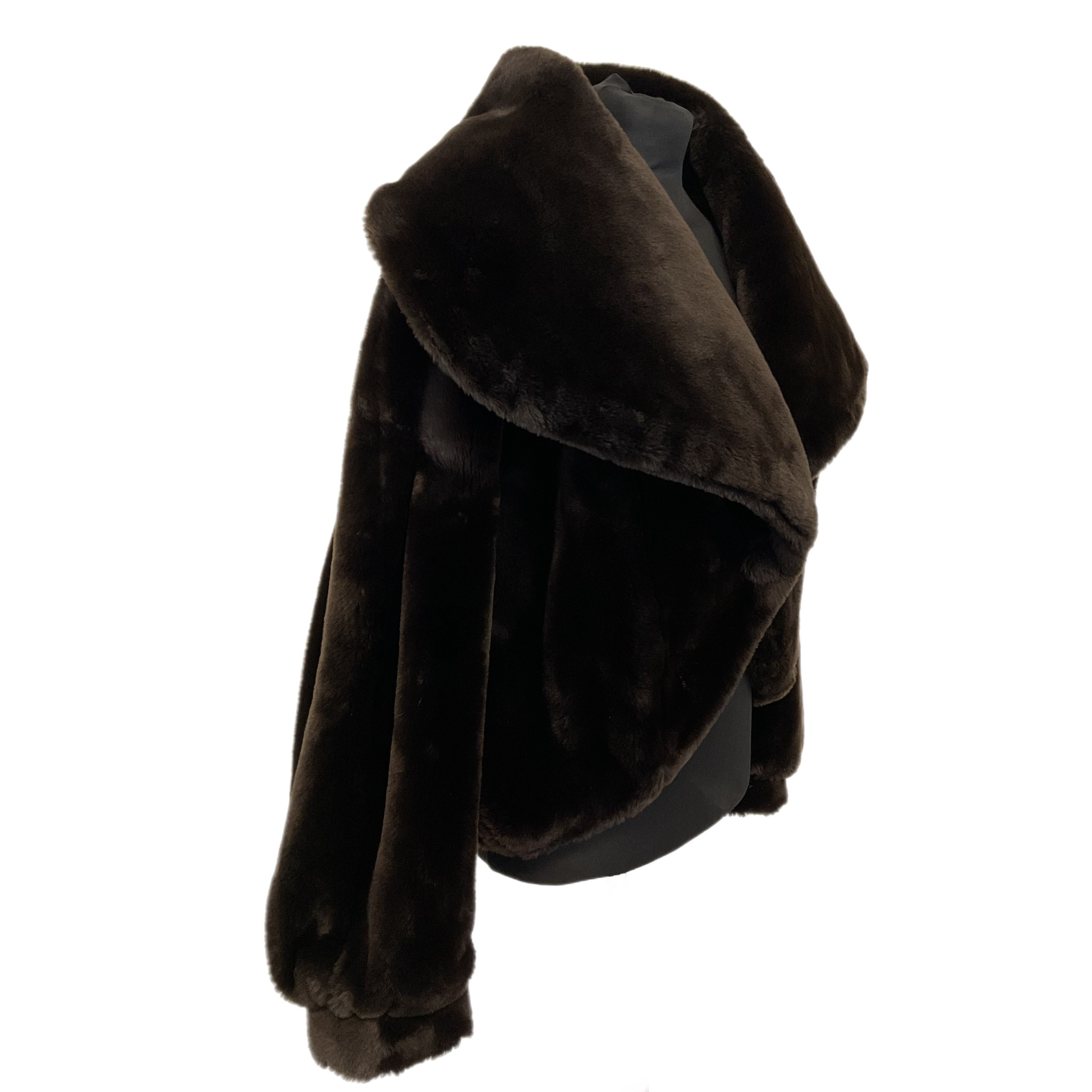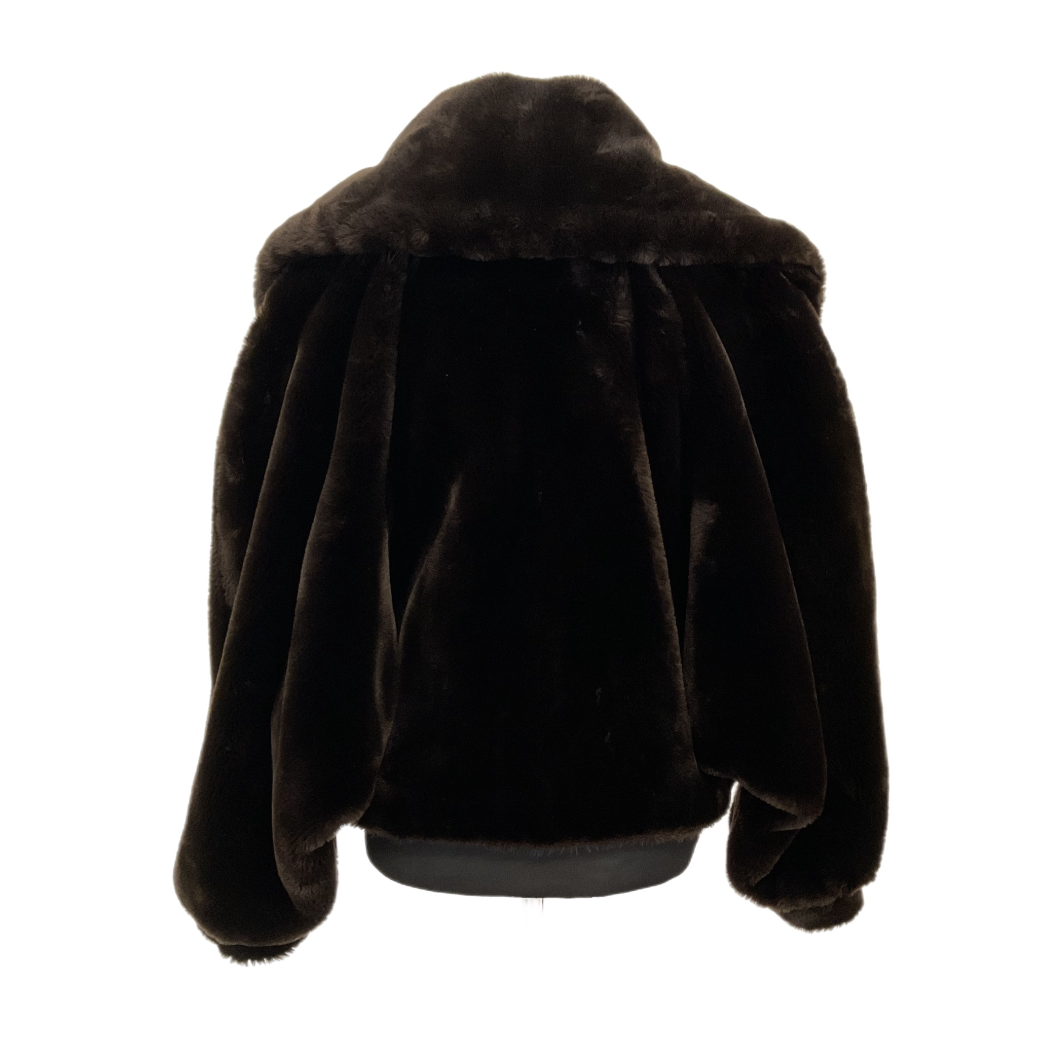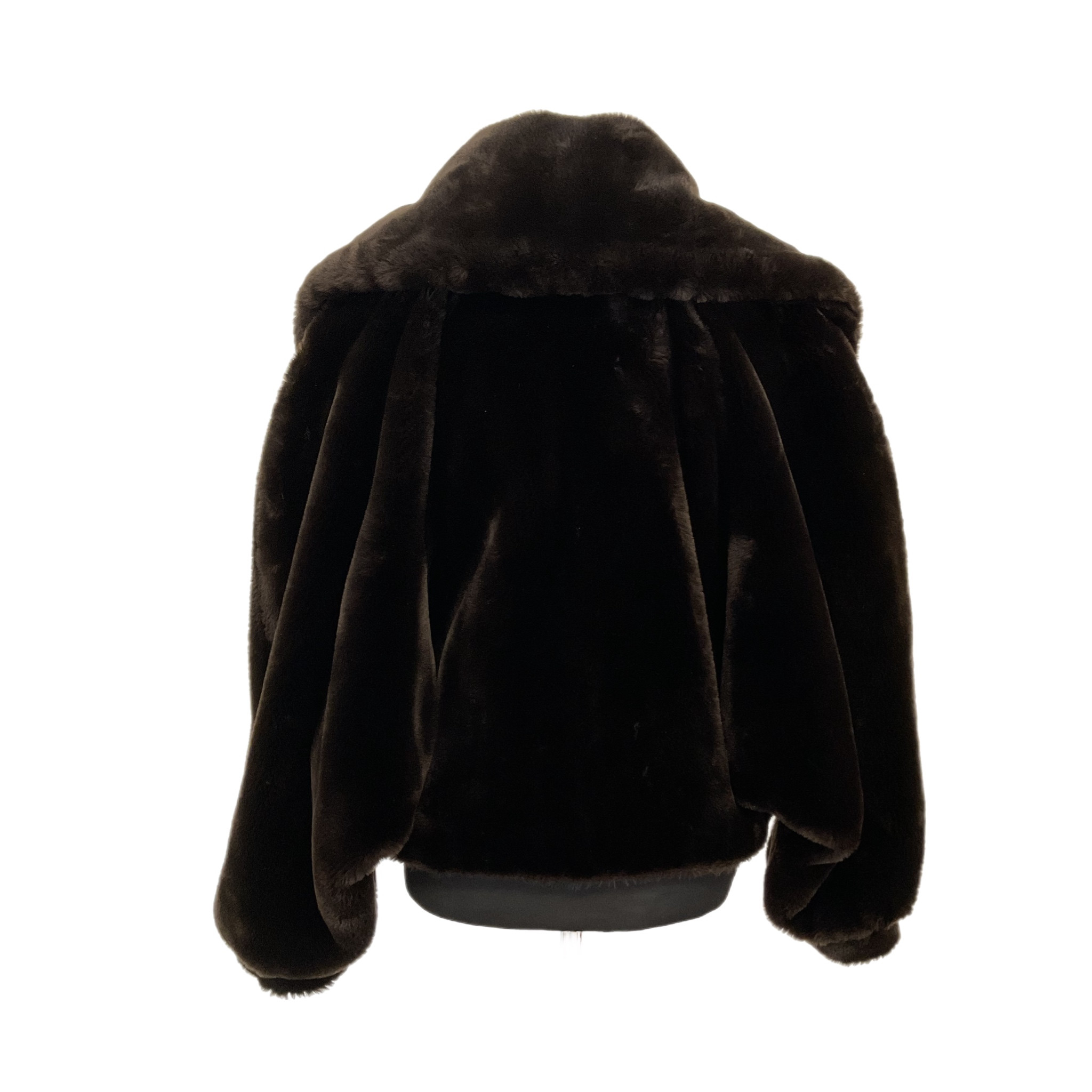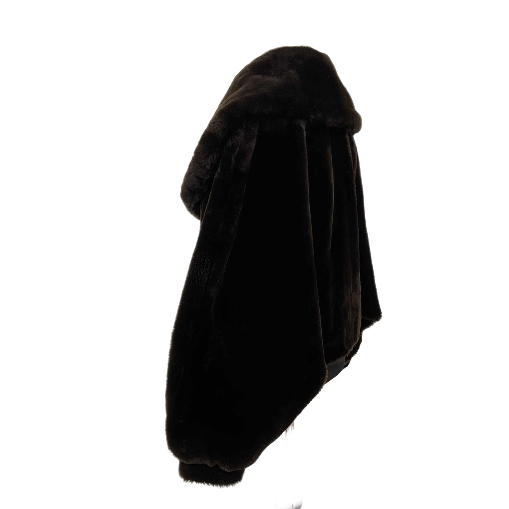 Pelliccia ecologica di colore marrone anni '80 caratterizzata dal collo molto ampio, maniche leggermente a "sbuffo", la chiusura con un bottone tondo, sempre rivestito di pelliccia ecologica dona eleganza e questa meravigliosa pelliccia.